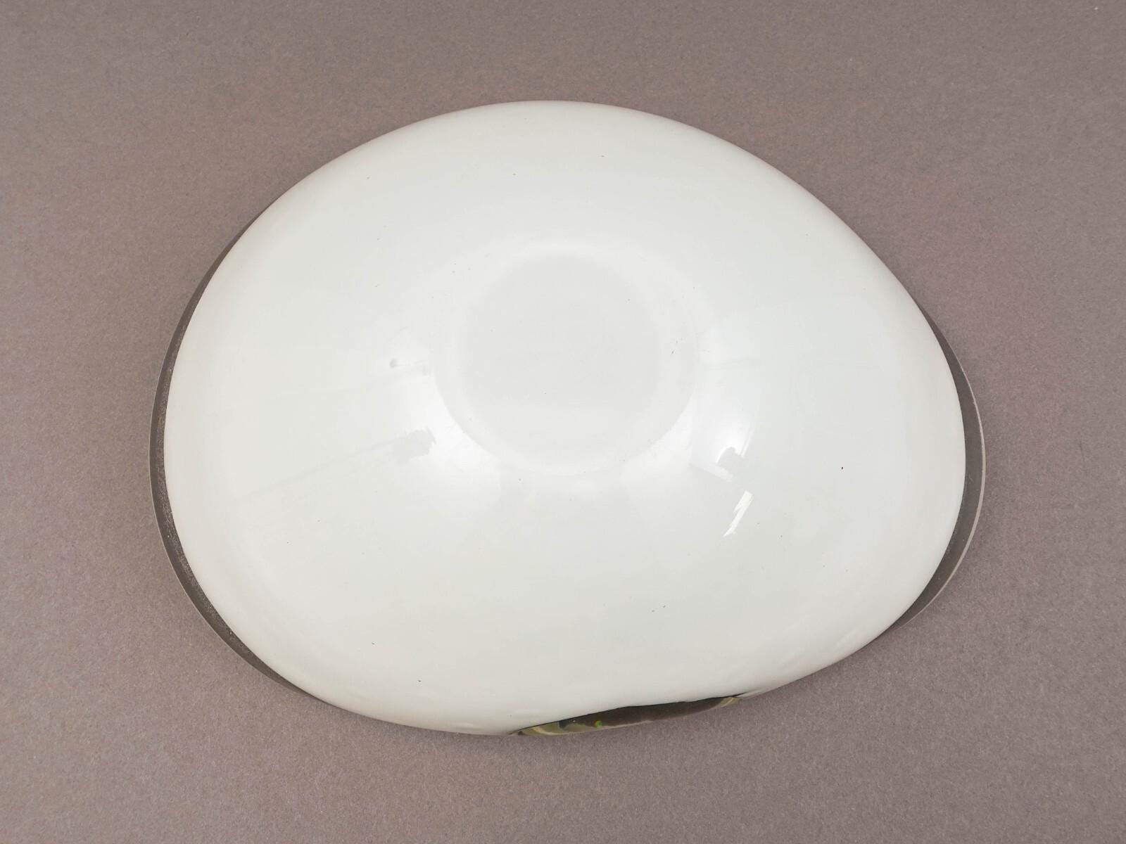 Flecks Art Glass Bowl.Measures approximately 10 7/8" long, 8 1/2" wide, 3 1/2" high. Weight 6.7 Pounds.Good pre-owned condition. Item is being sold as found. No chips, cracks or repairs. Some scratches to two areas on outside border, small scuff to inside border to one area and light scratches to underside.