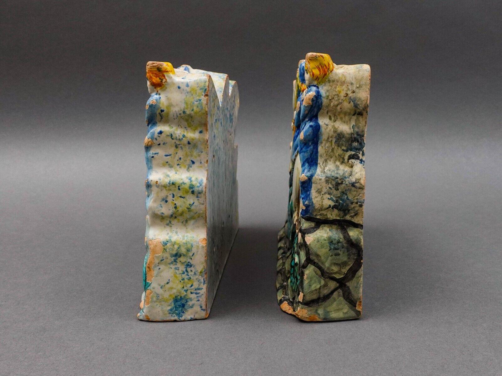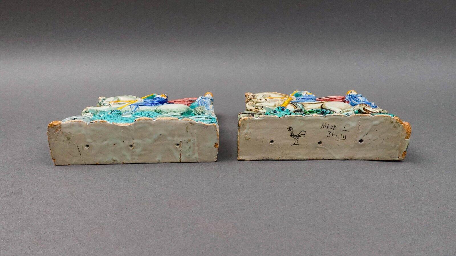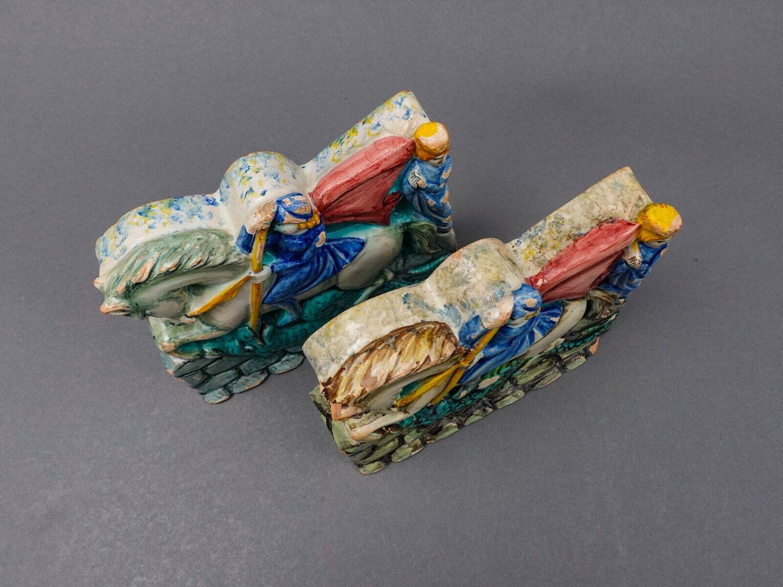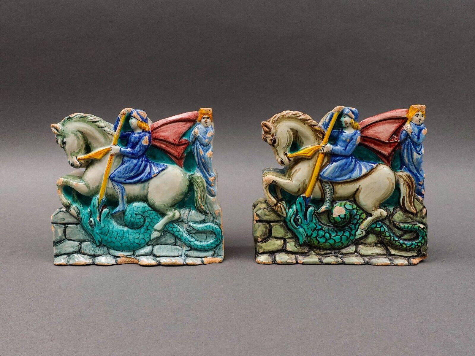 Antique Italian St George Slaying Dragon Terracotta Plaque Bookend Sculpture Set