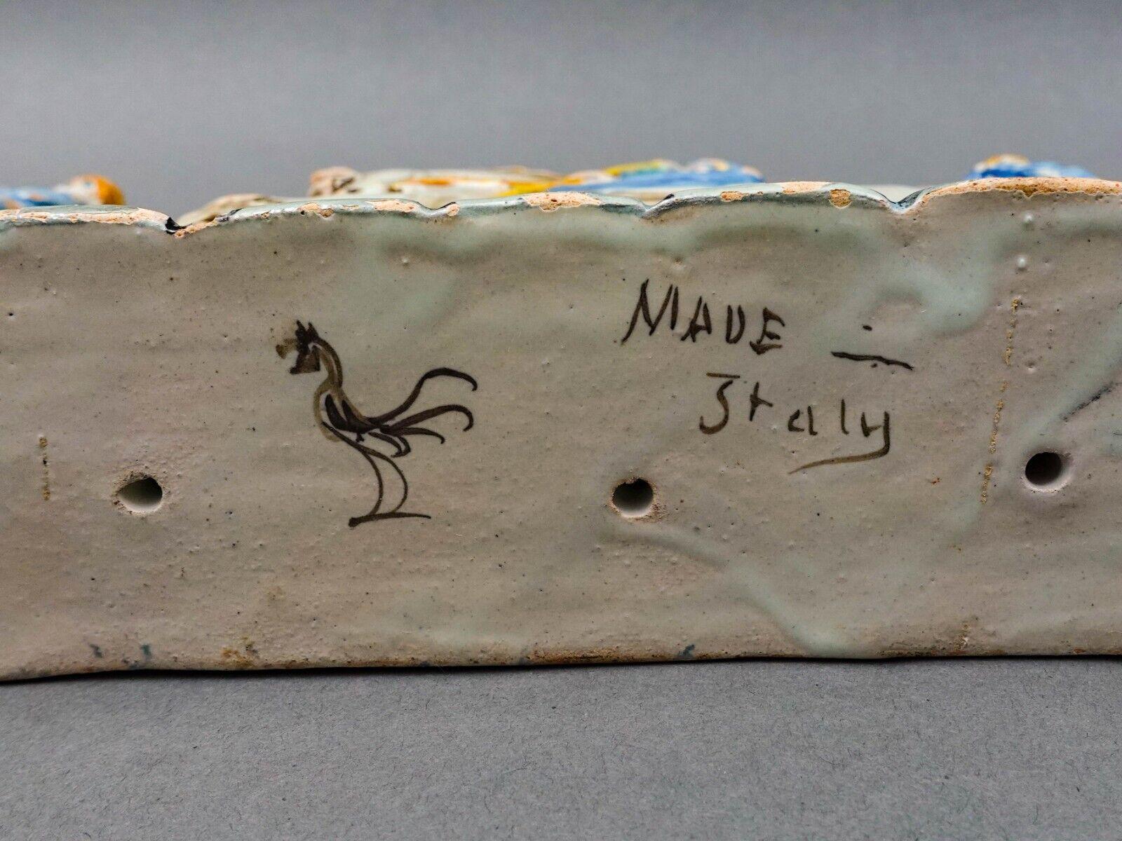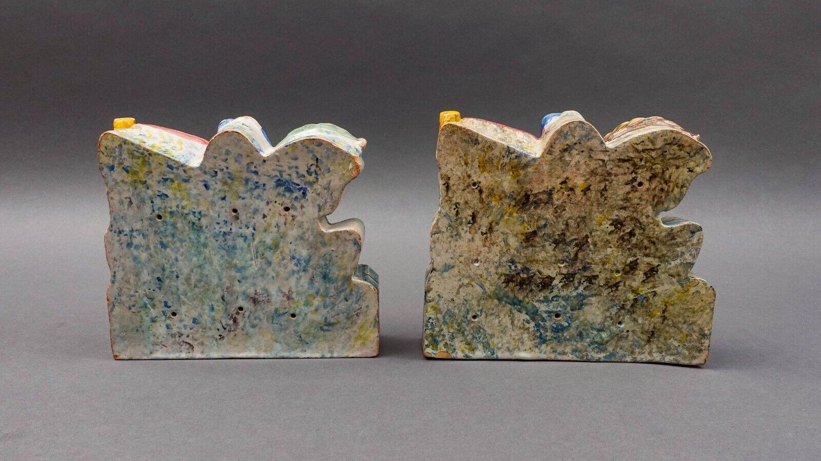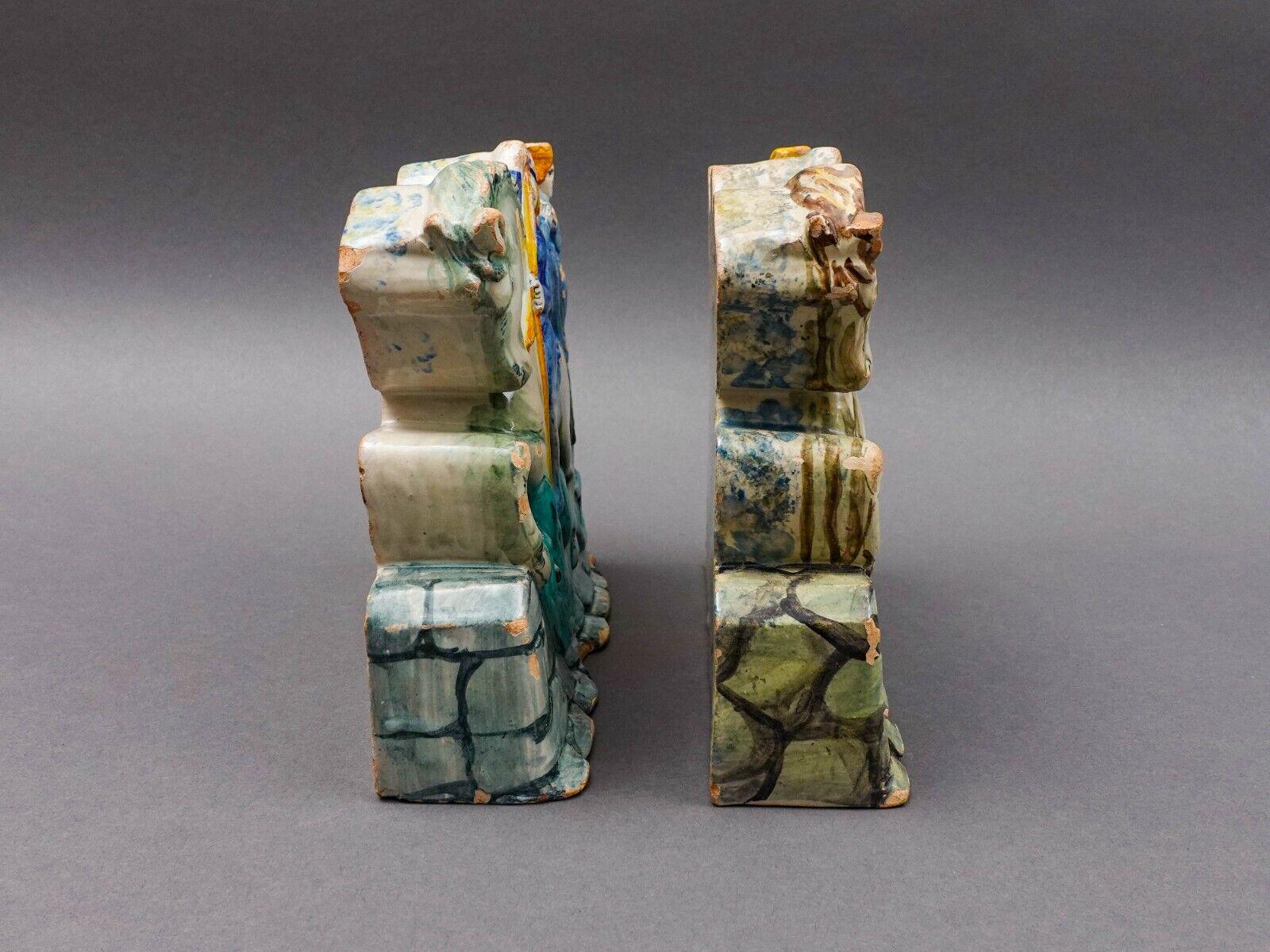 Bookend Relief Sculpture Set Of 2. One Is Hallmarked With Rooster Made Italy. Measures approximately 7 3/4" long, 2 3/8" wide, 6 3/4" high. Pre-owned condition. Item is being sold as found. No cracks or repairs. Many chips, nicks and flakes. Please use zoom over mouse feature to view.