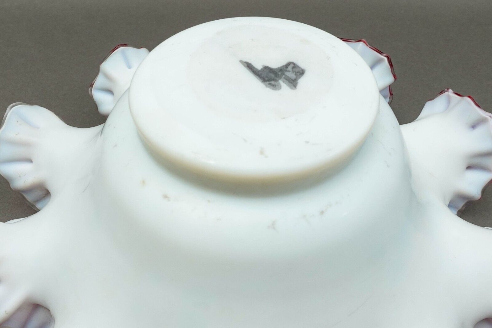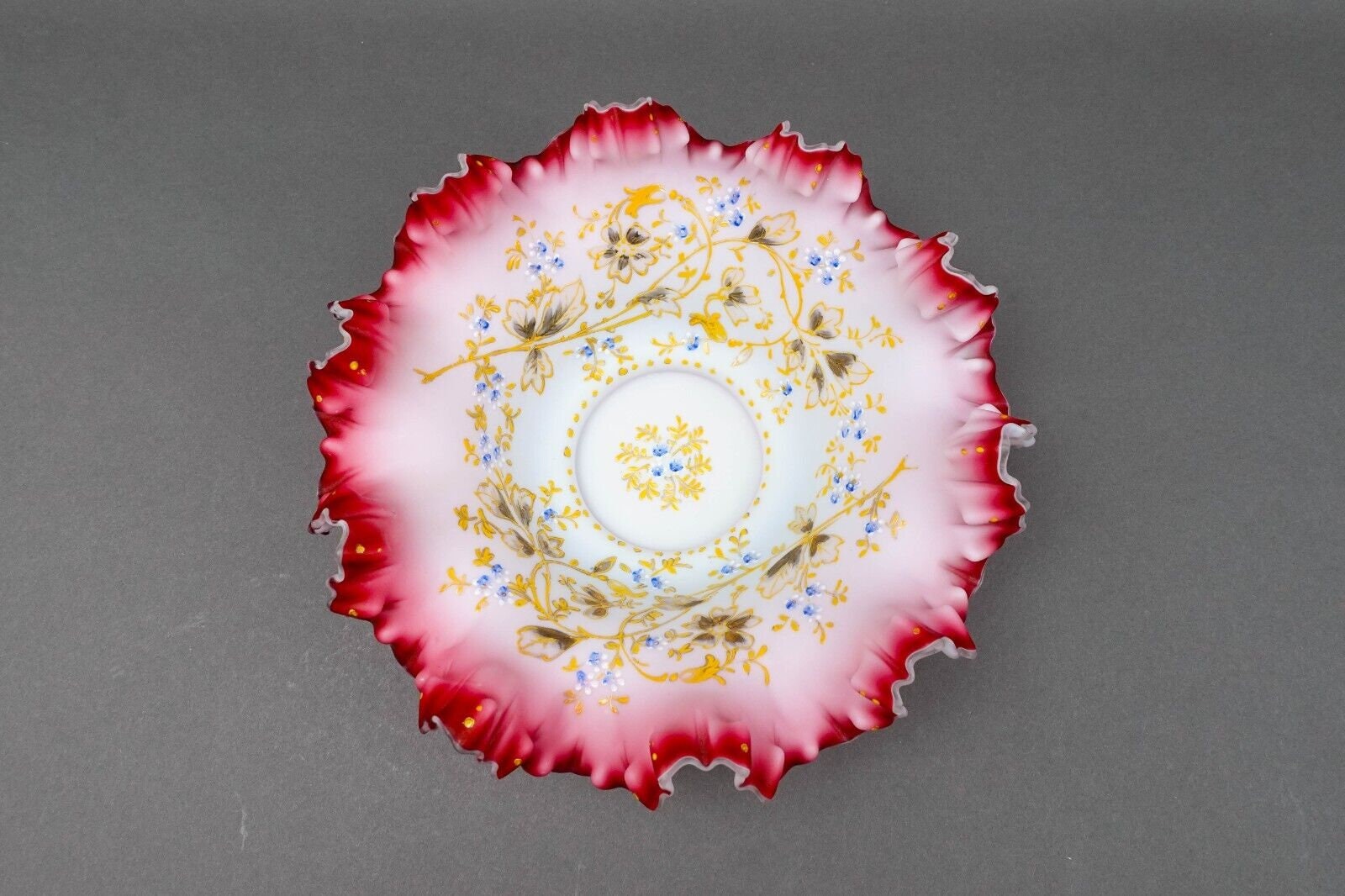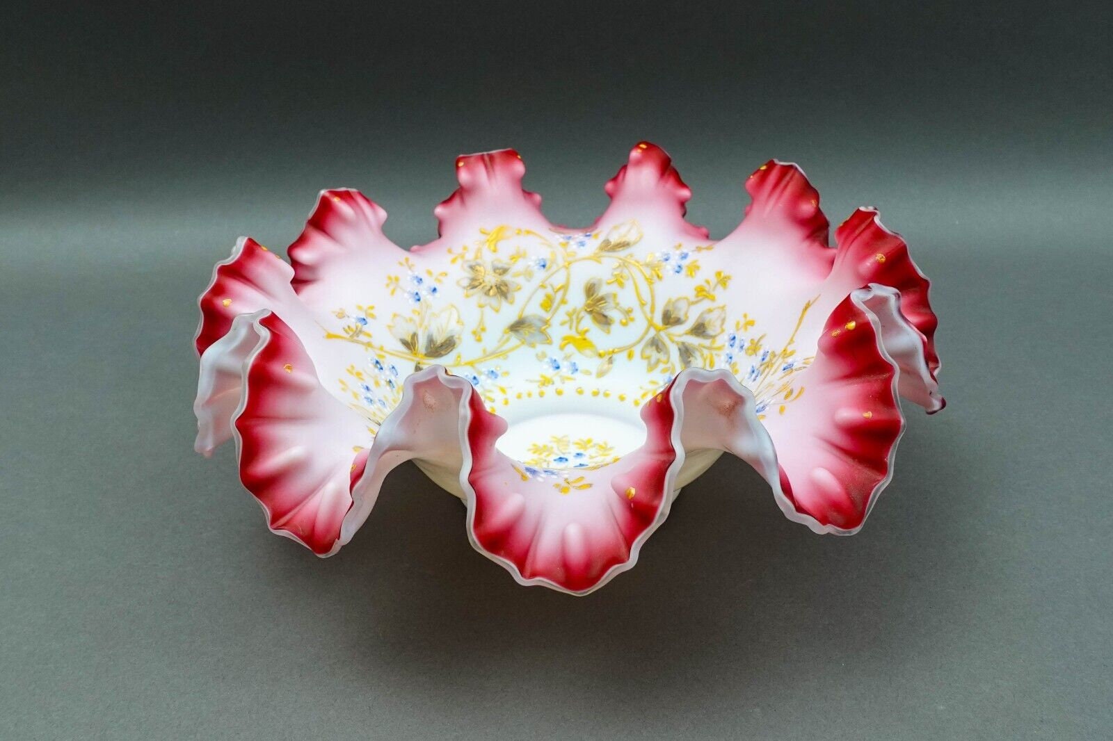 Antique Victorian Hand Painted Cranberry Ruffled Edges Glass Brides Basket Bowl