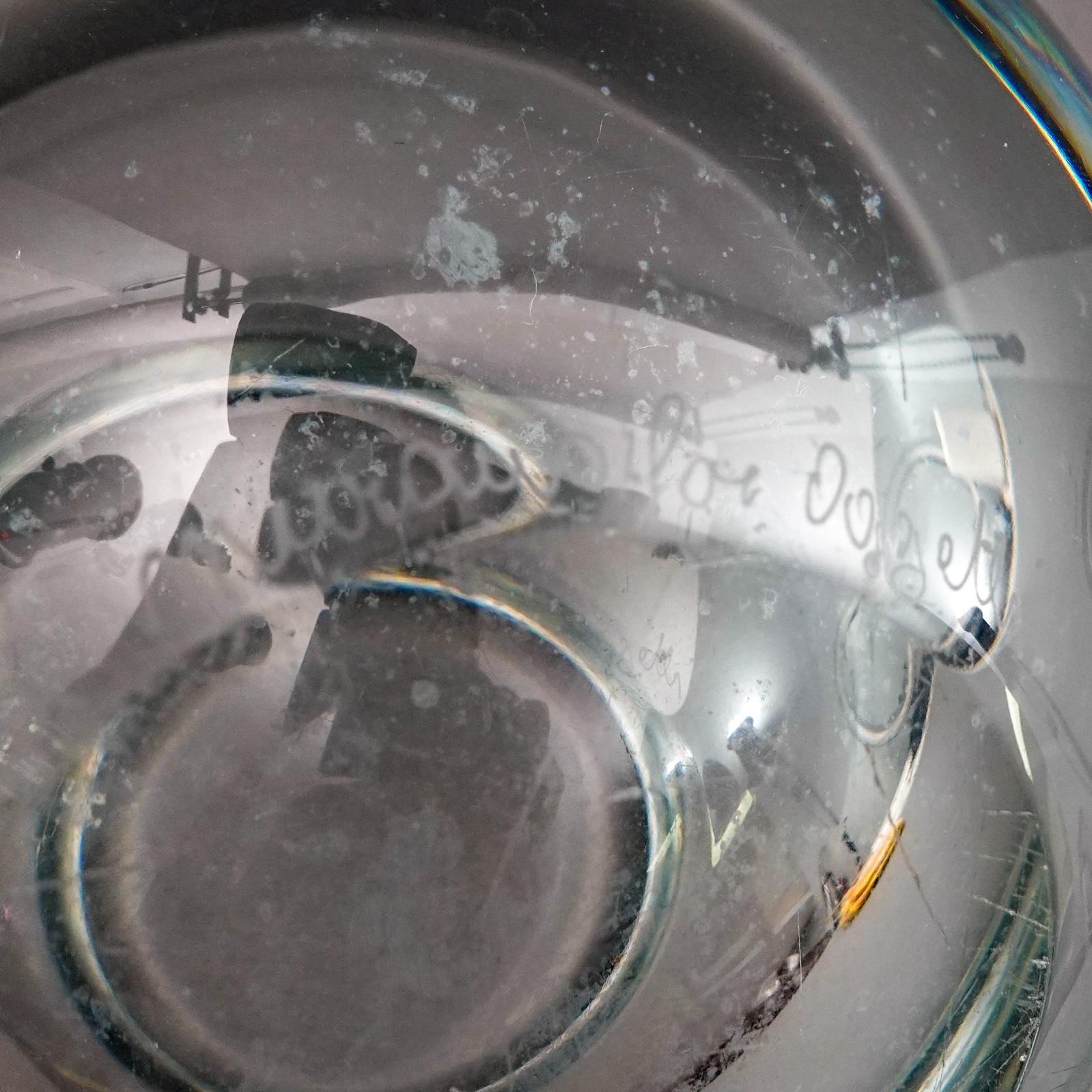repairs. Three light scratches inside seen under inspection against light, white residue to inside bottom and light scratches to small area to bottom near base.