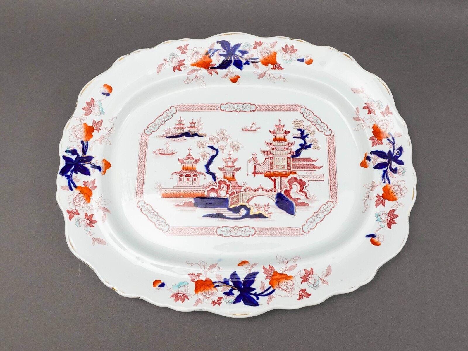 B & L Burgess & Leigh England Large Antique Tonquin Porcelain Platter Tray.Measures approximately 19 1/2" long, 16" wide, 1 1/2" high.Good pre-owned condition. Item is being sold as found. No chips, cracks or repairs.Some utensil scratches, gold loss to borde, imperfections to edge and crazing.