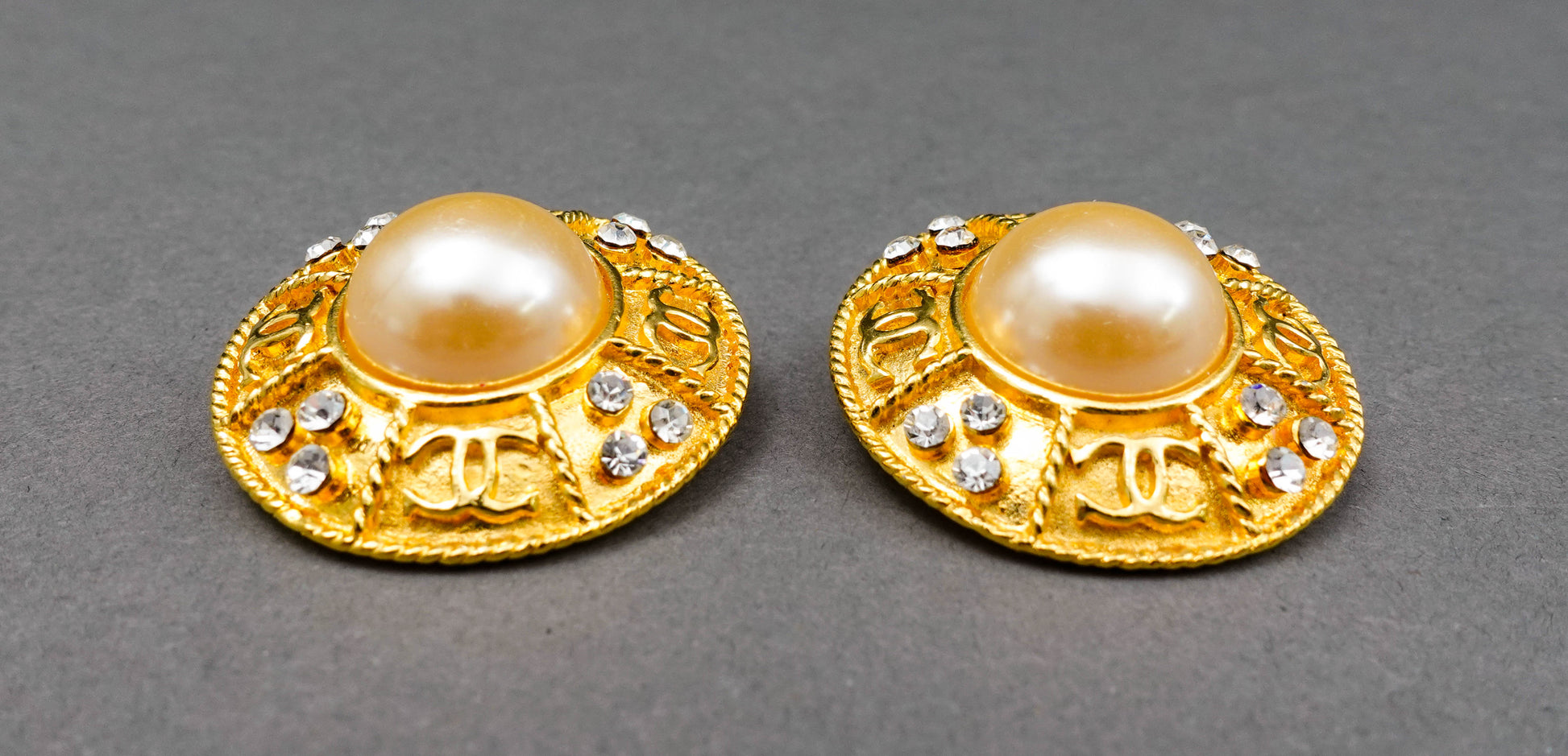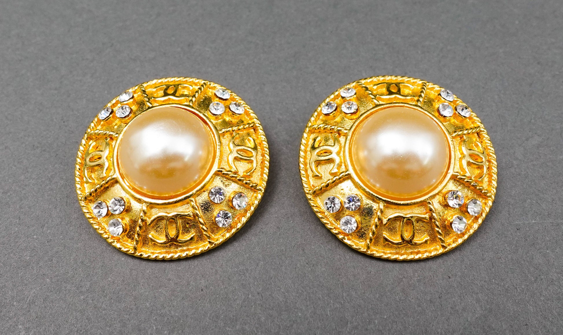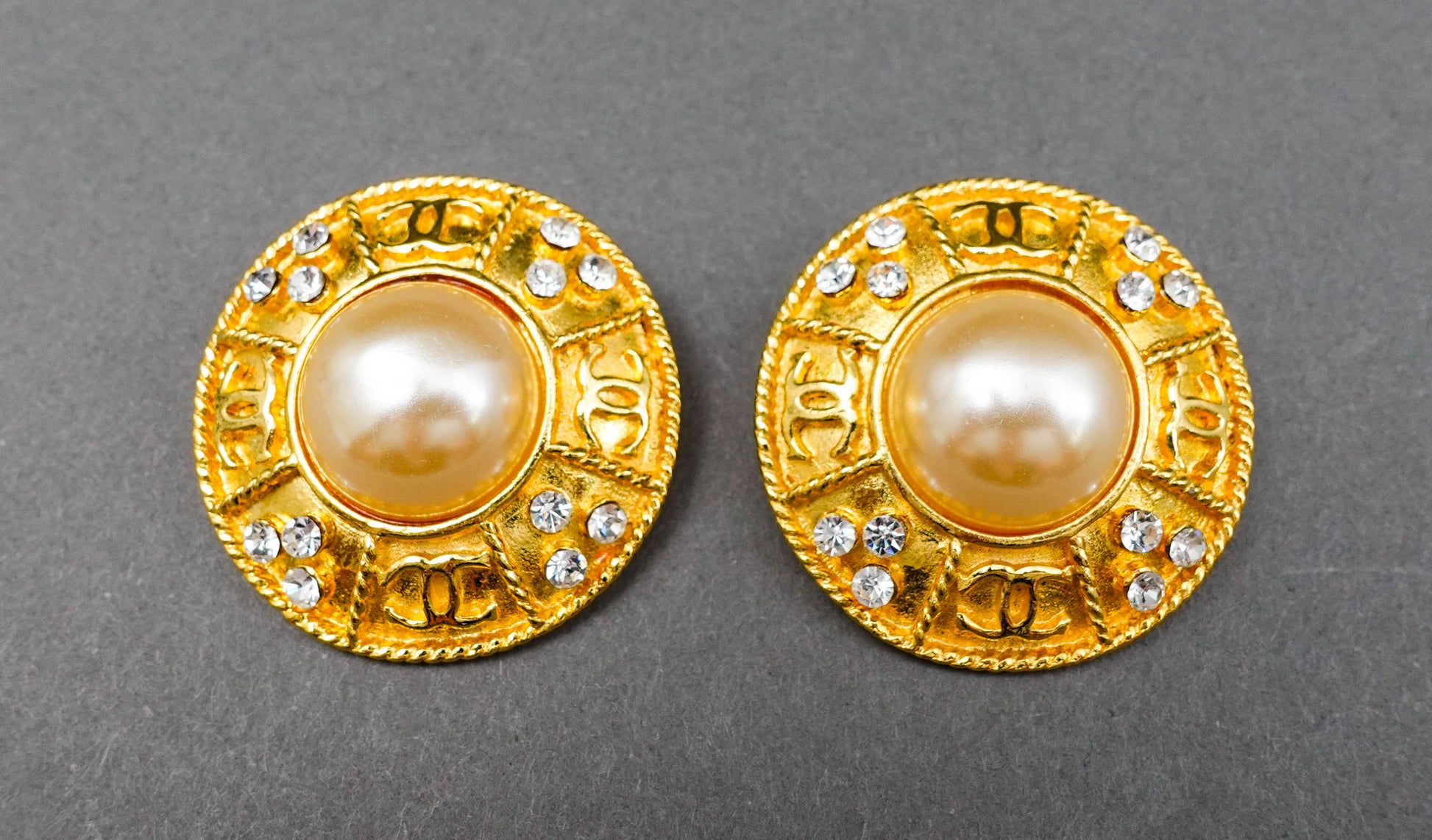 Chanel Vintage CC Logo Round Gold Tone Faux Mabe Pearl Rhinestone Clip Earrings