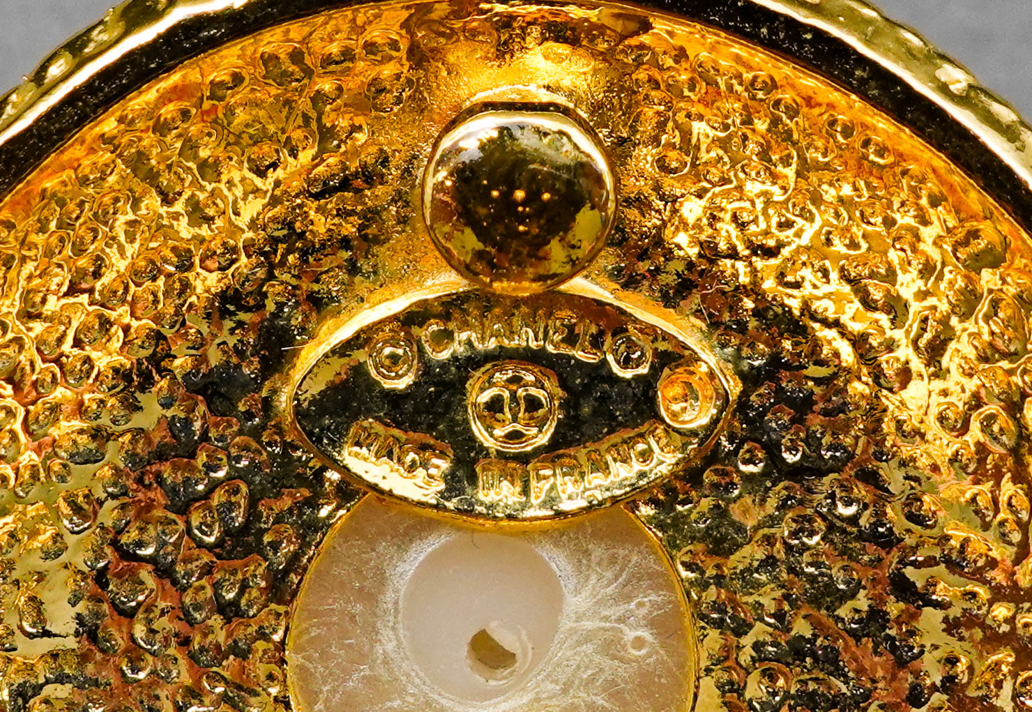 Chanel Vintage CC Logo Round Gold Tone Faux Mabe Pearl Rhinestone Runway Statement Clip Earrings.