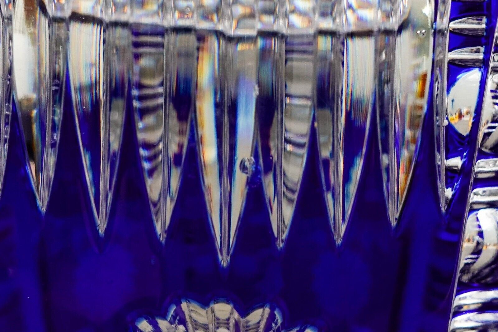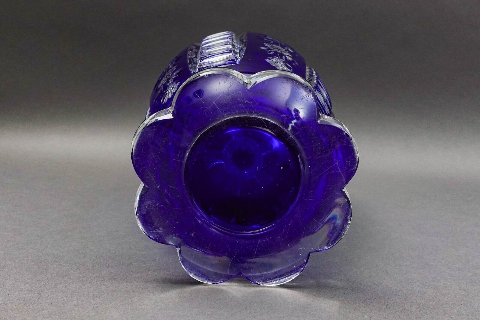 Bohemian Czech Cobalt Blue Cut To Clear Crystal Vase With Sawtooth Rim.