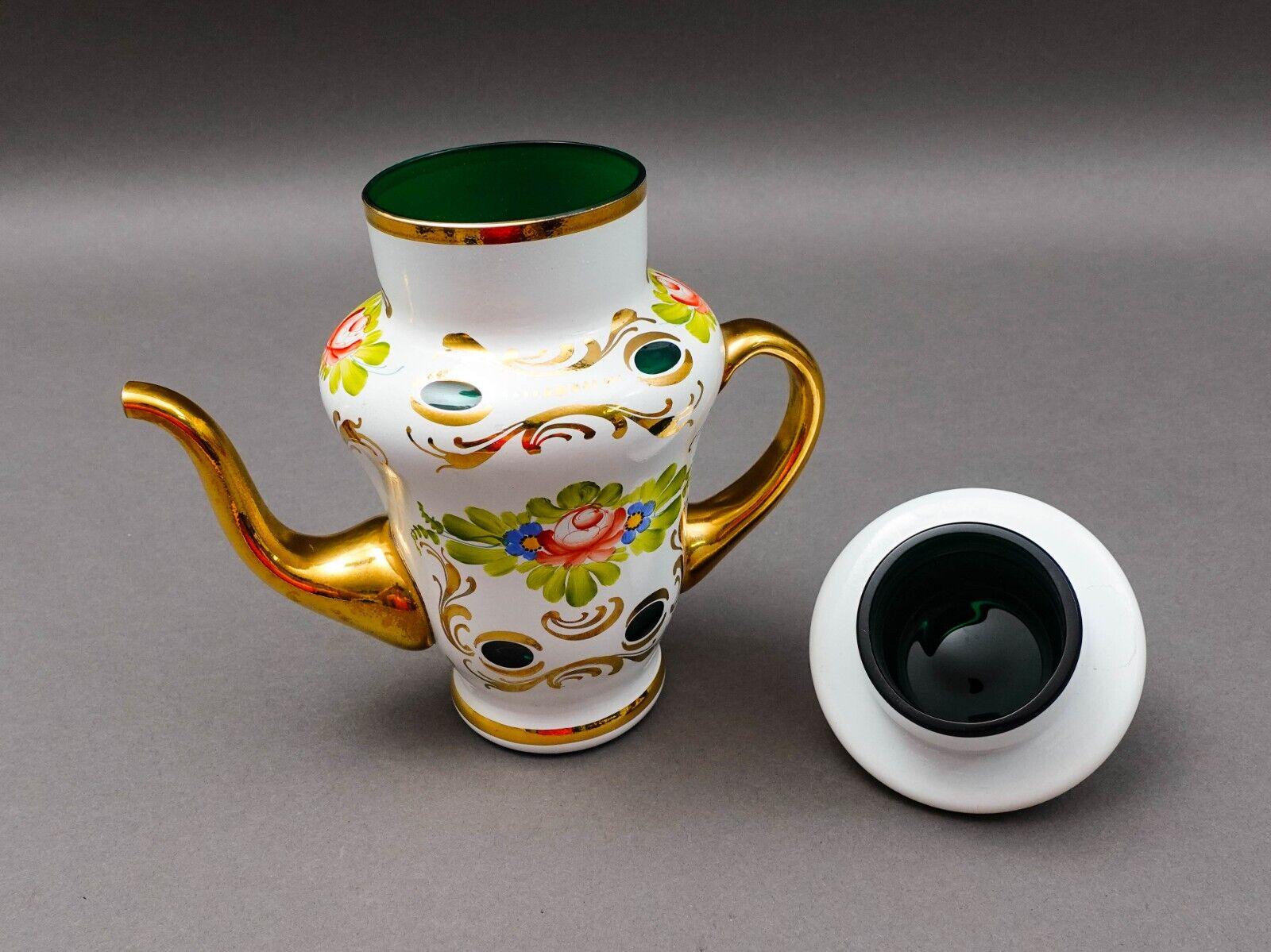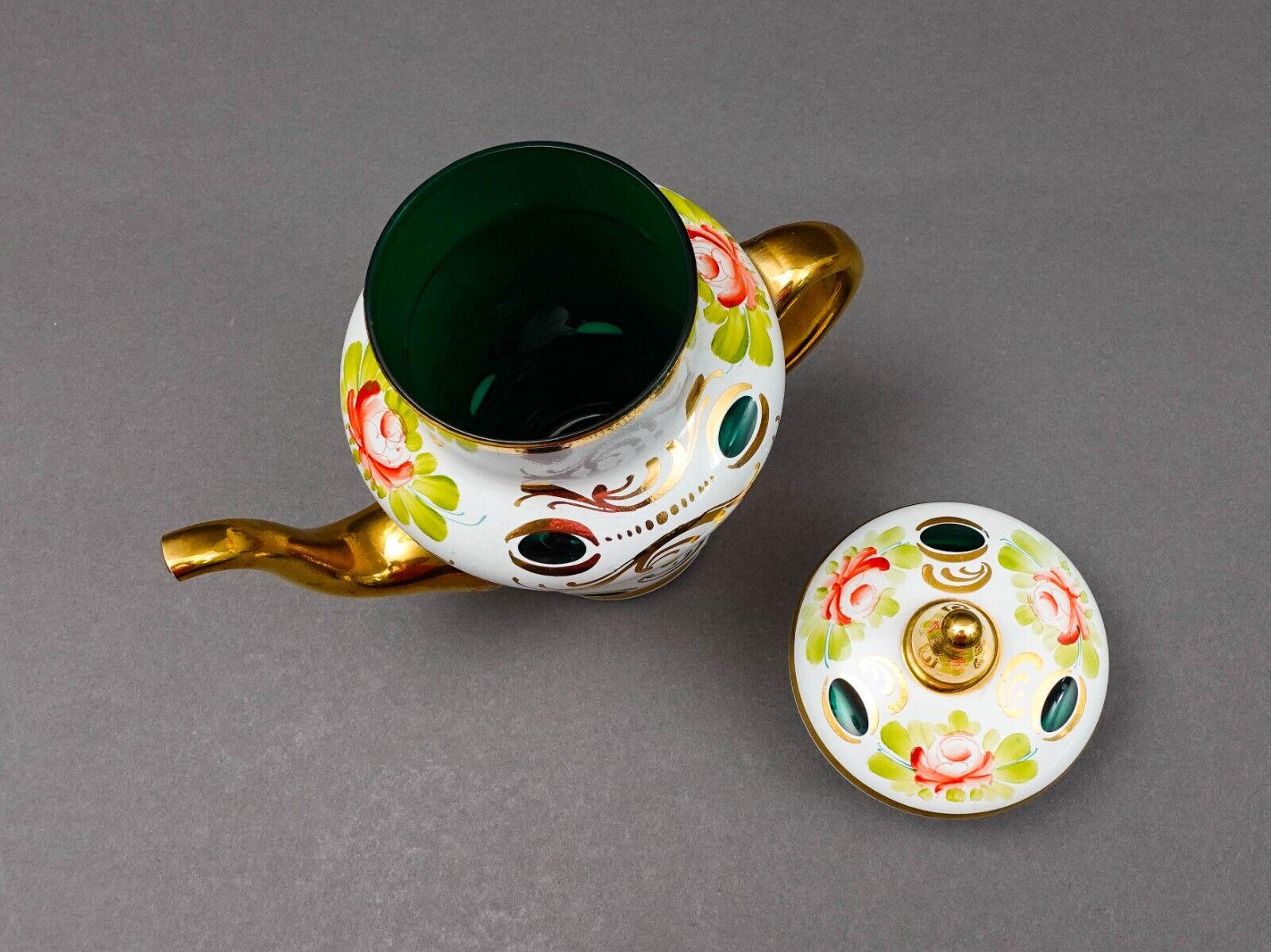 Bohemian Czech White Cut To Green Cased Gold Gilt Hand Painted Floral Tea Pot
