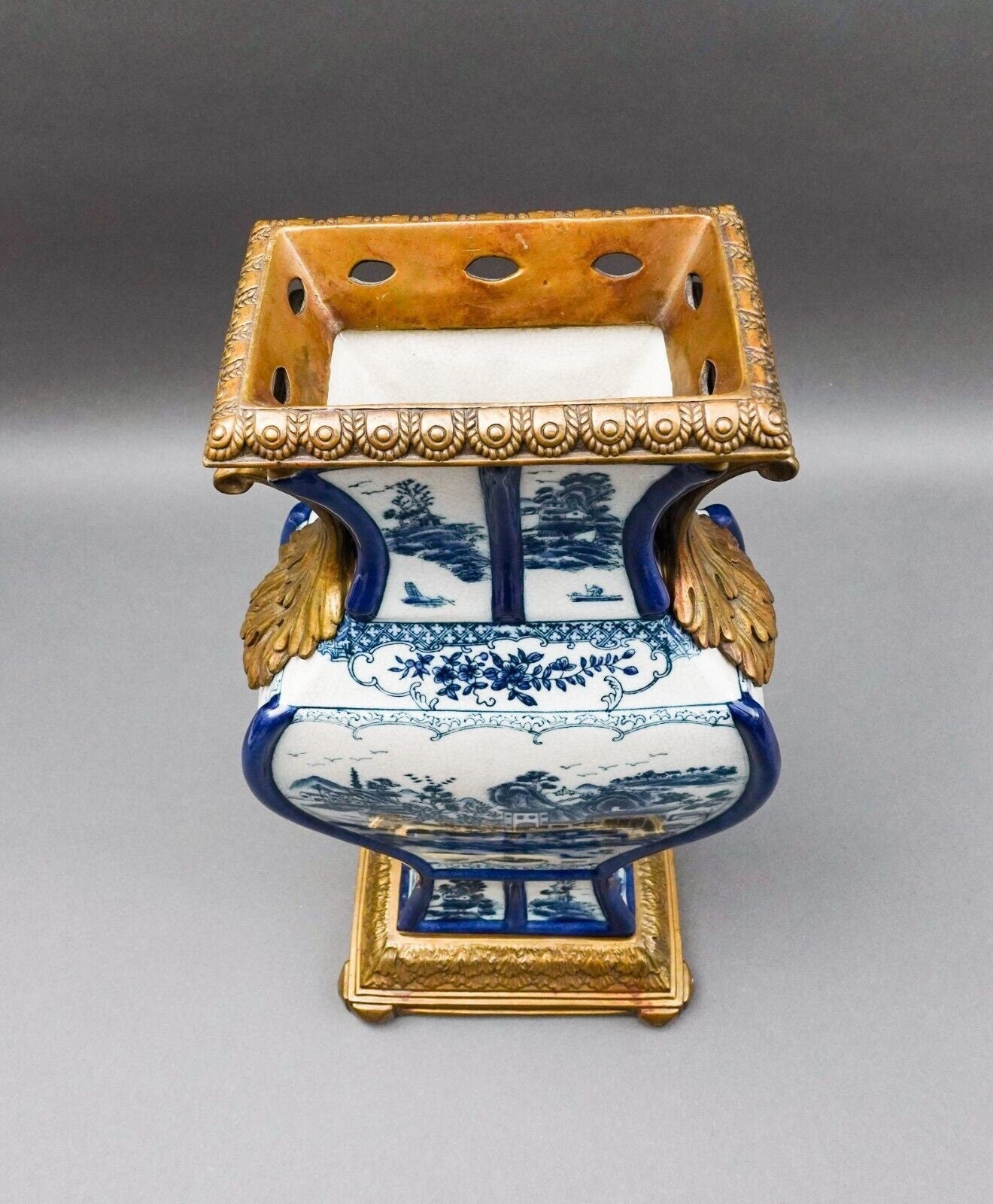Castilian Vintage Chinese Blue White Porcelain Bronze Ormolu Large Urn Vase.