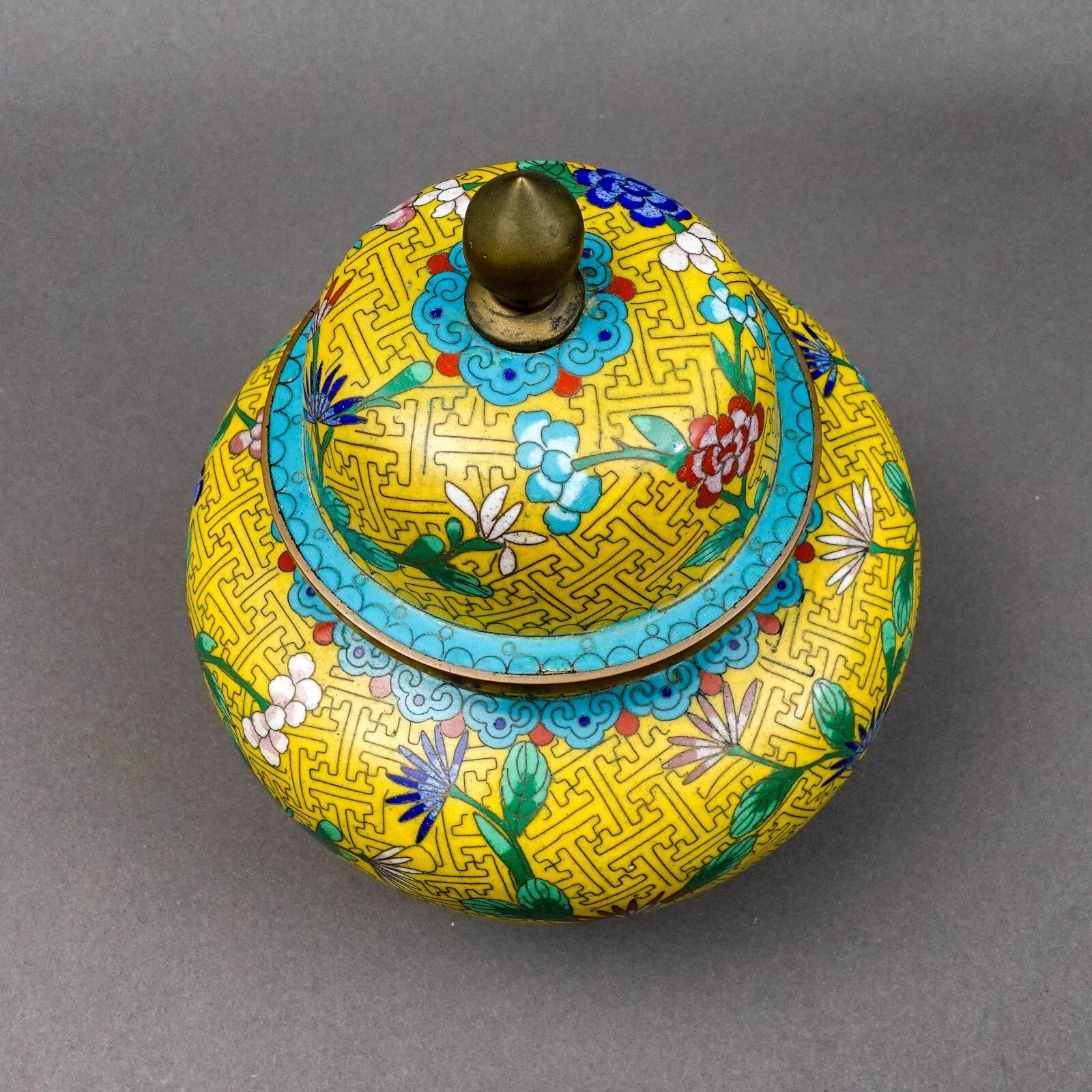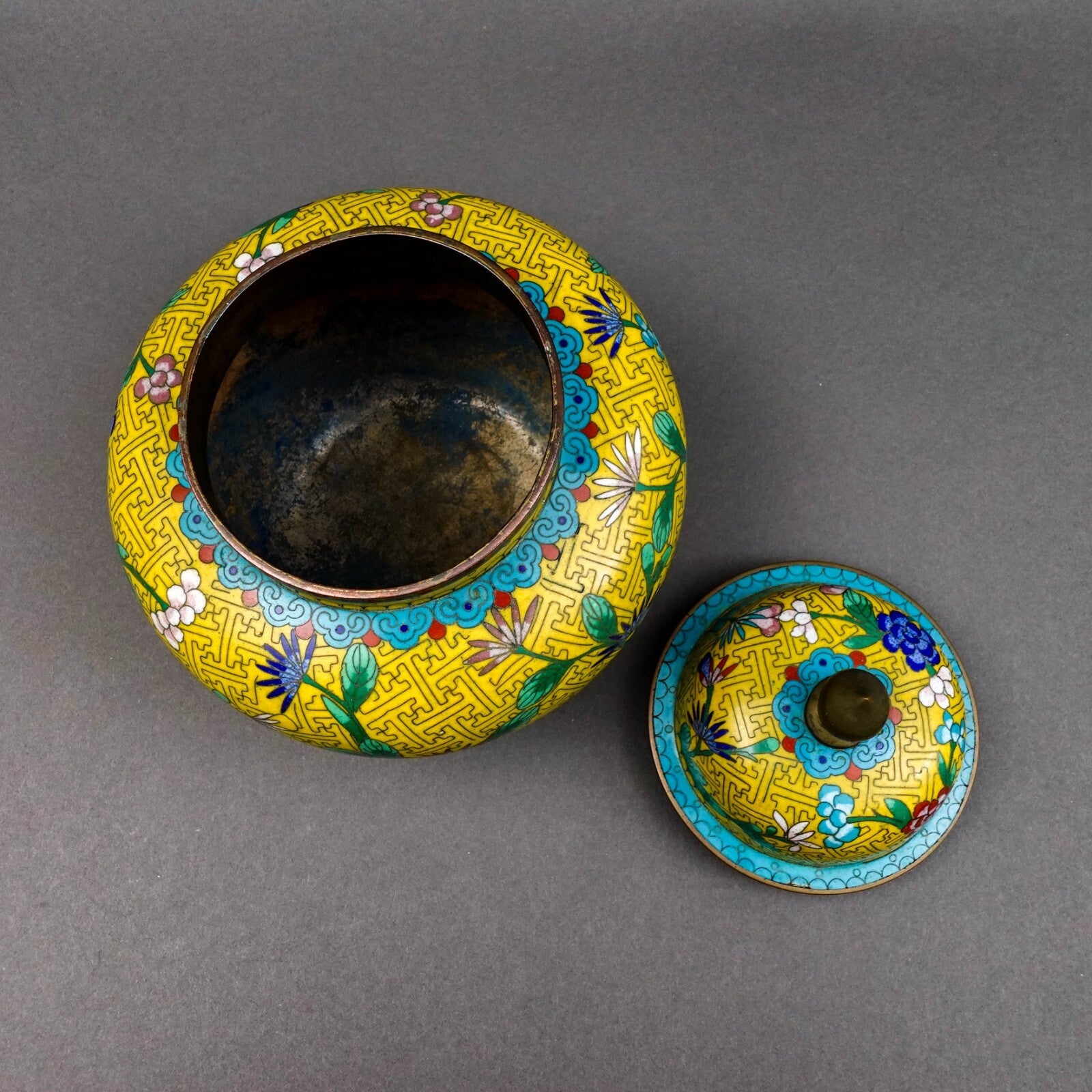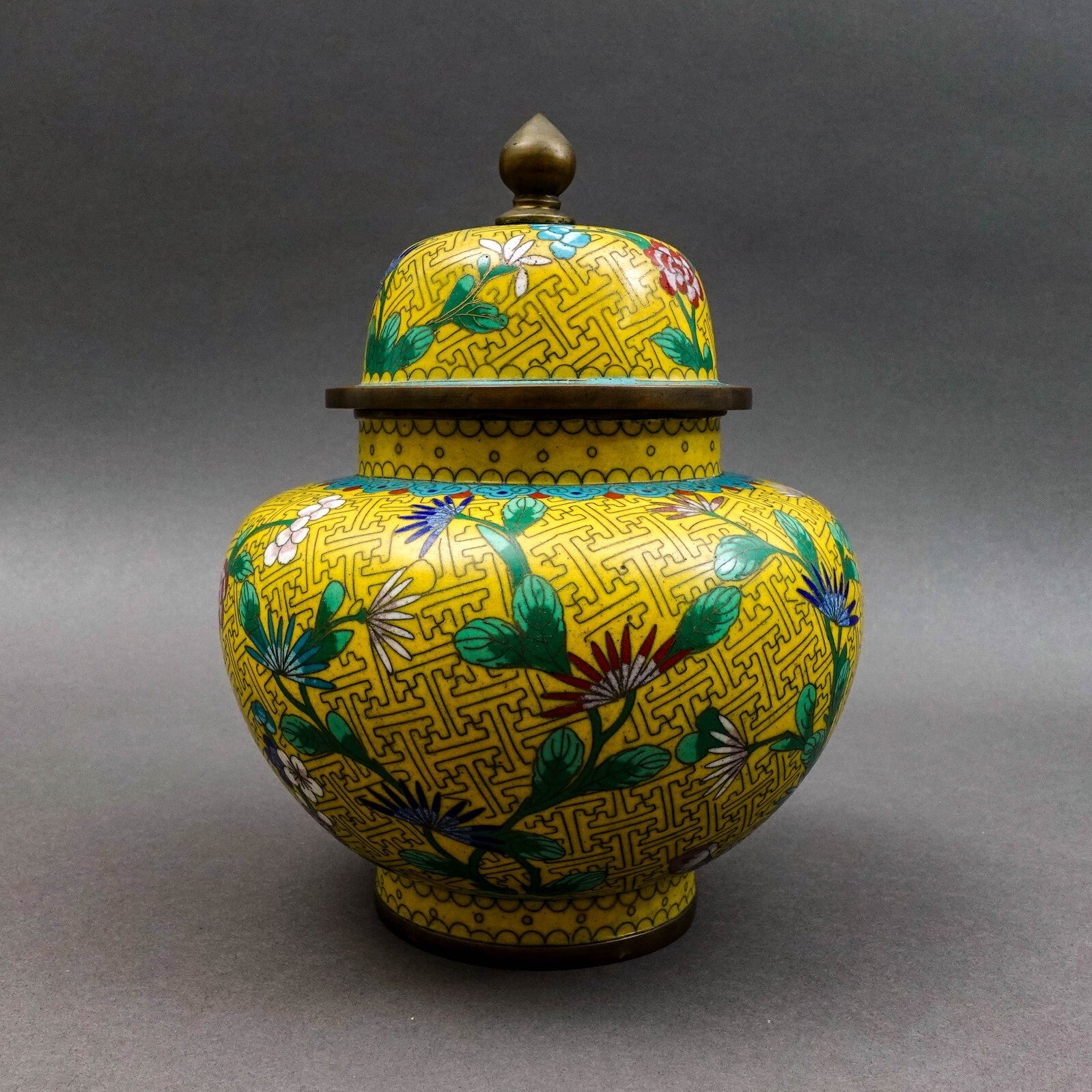 Chinese Cloisonne Yellow Enamel Floral Lidded Ginger Jar.Measures approximately 7" diameter, 9" high with lid, 5 7/8" high without lid.pre-owned condition. Item is being sold as found. No chips, cracks or repairs. Overall fantastic appearance!!!