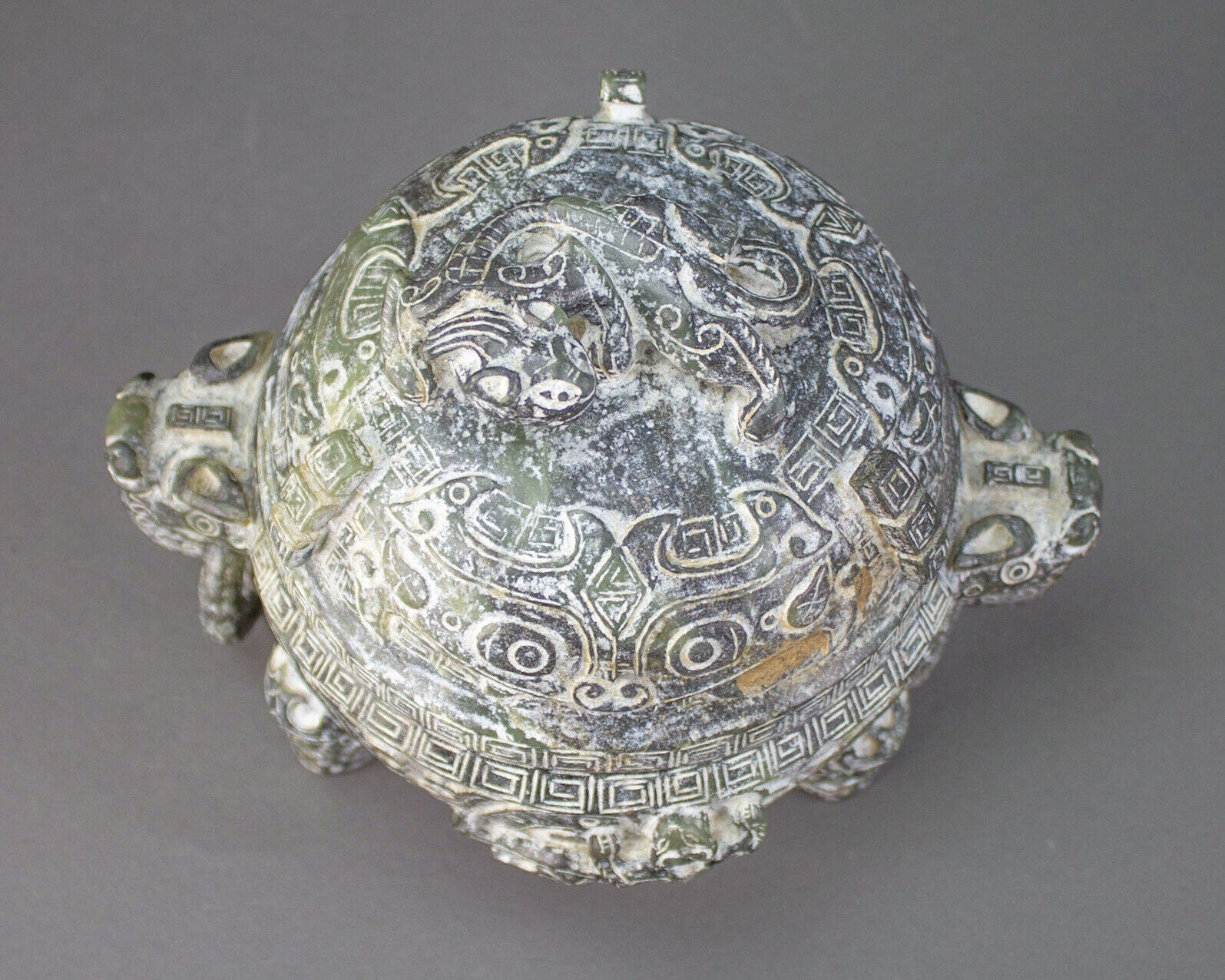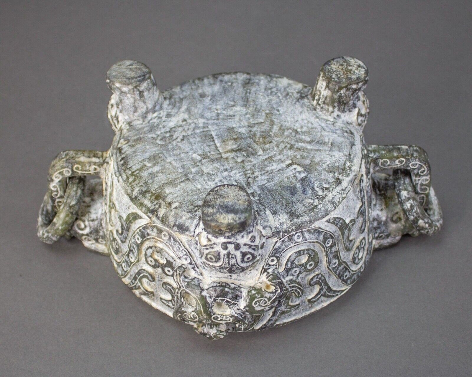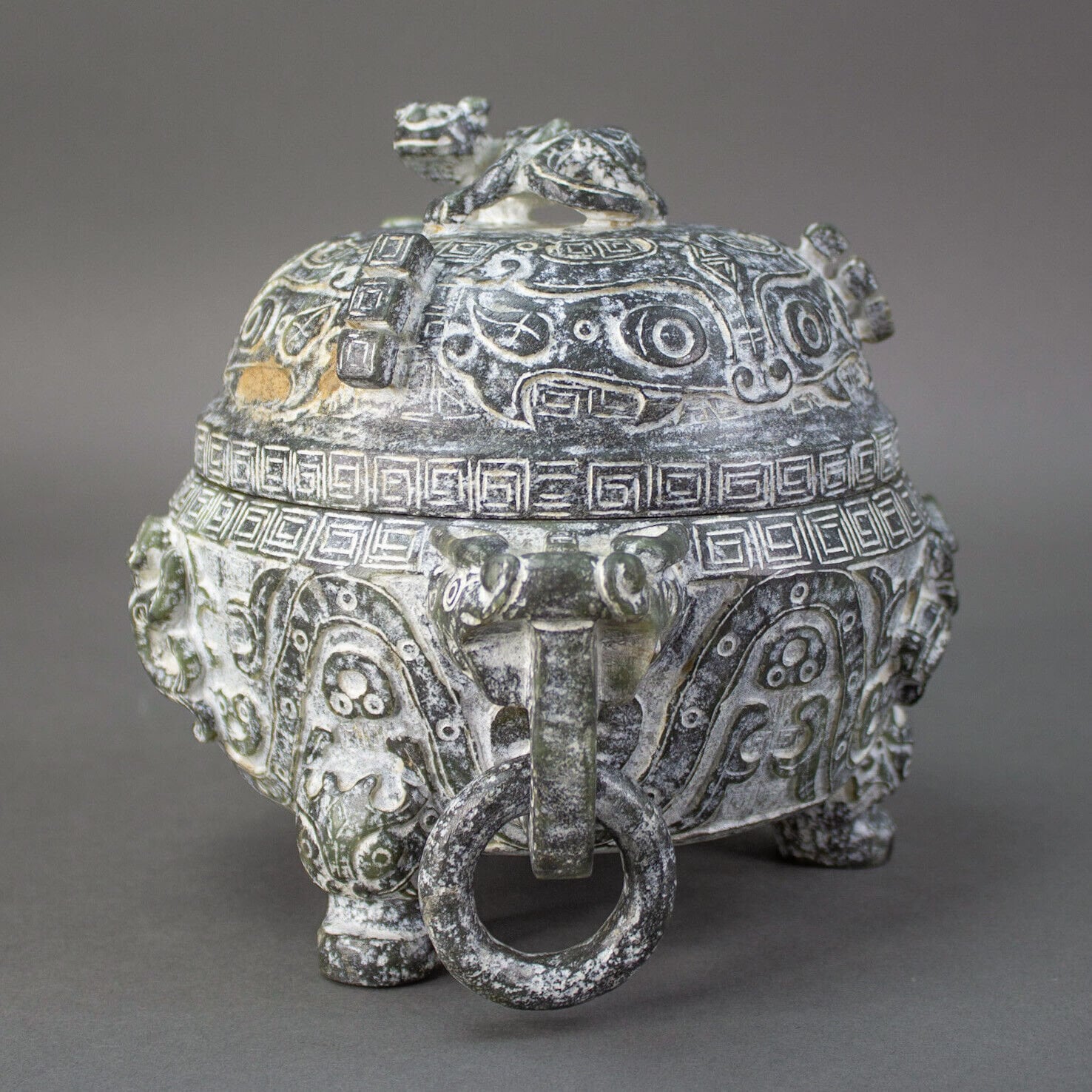 DescriptionChinese Hand Carved Soapstone Dragon Ritual Tripod Lidded Censer Incense Burner. Measures 9 5/8" Long, 7 1/2'' Wide, 7 3/4" High.