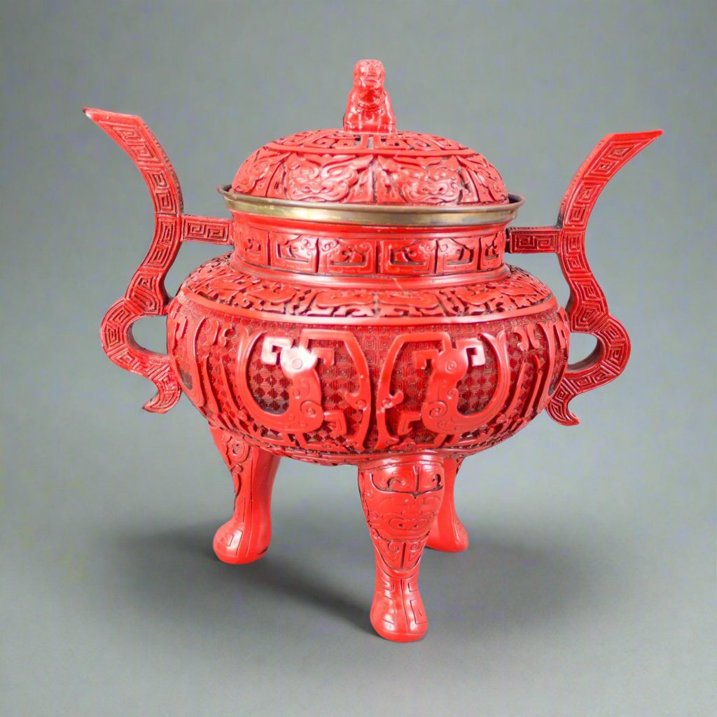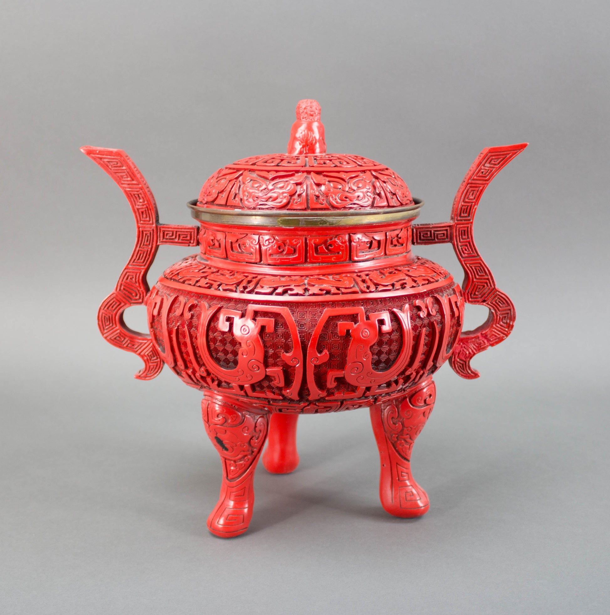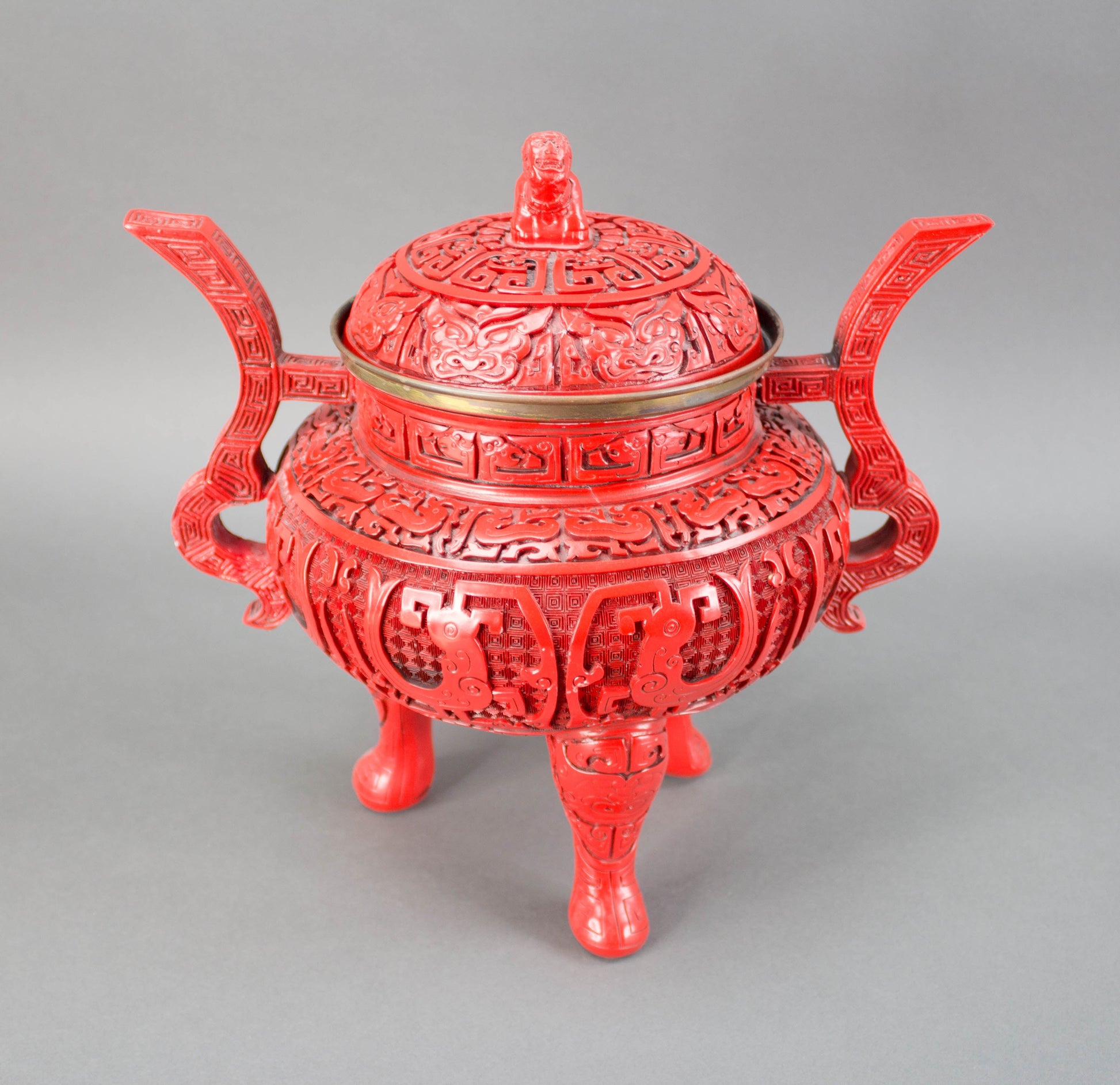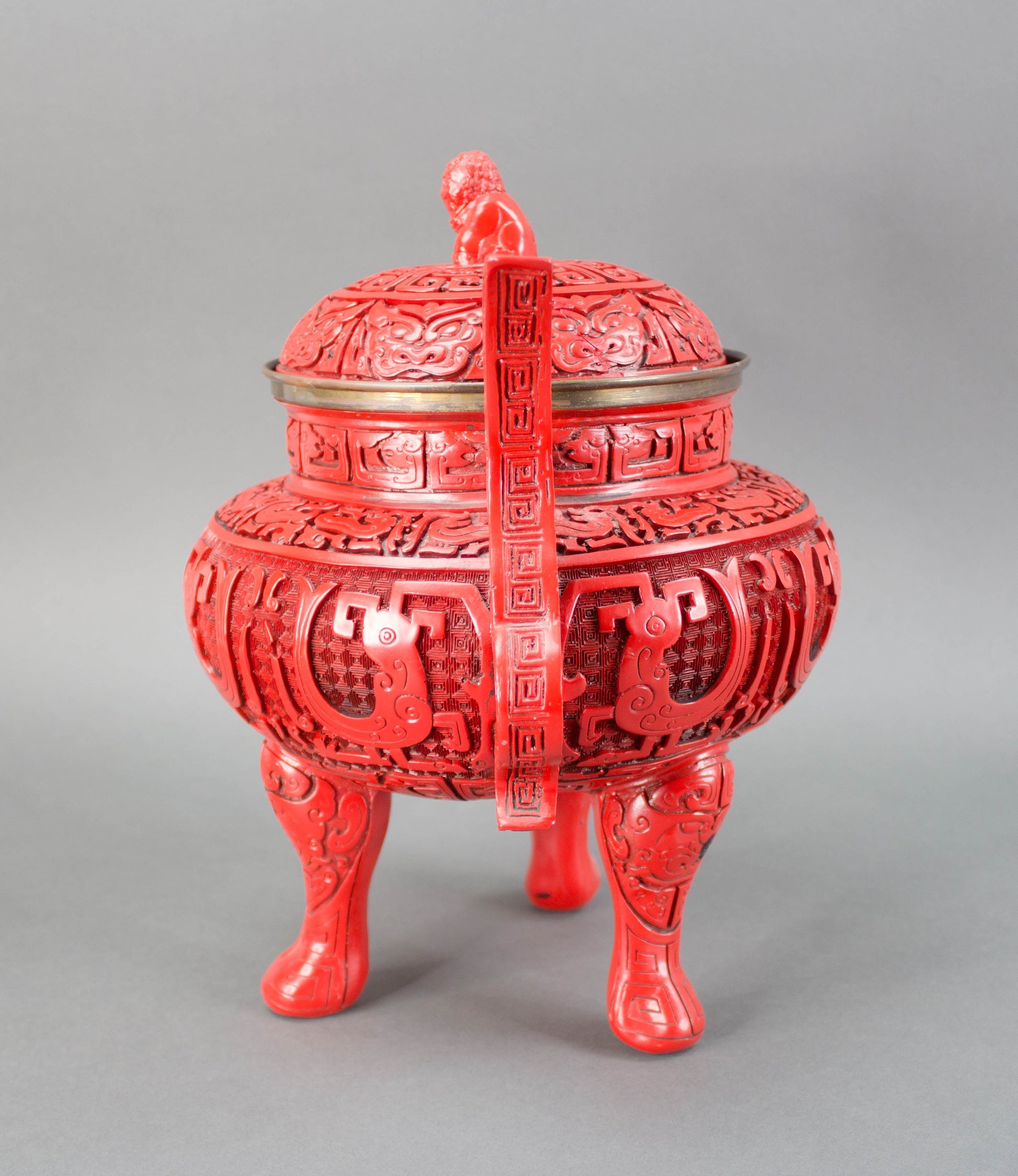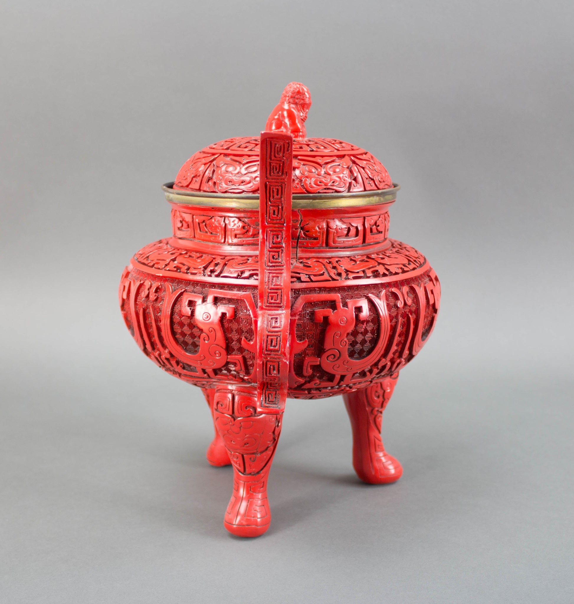 Chinese Republic Large Cinnabar Lacquered Tripod Incense Burner Foo Dog