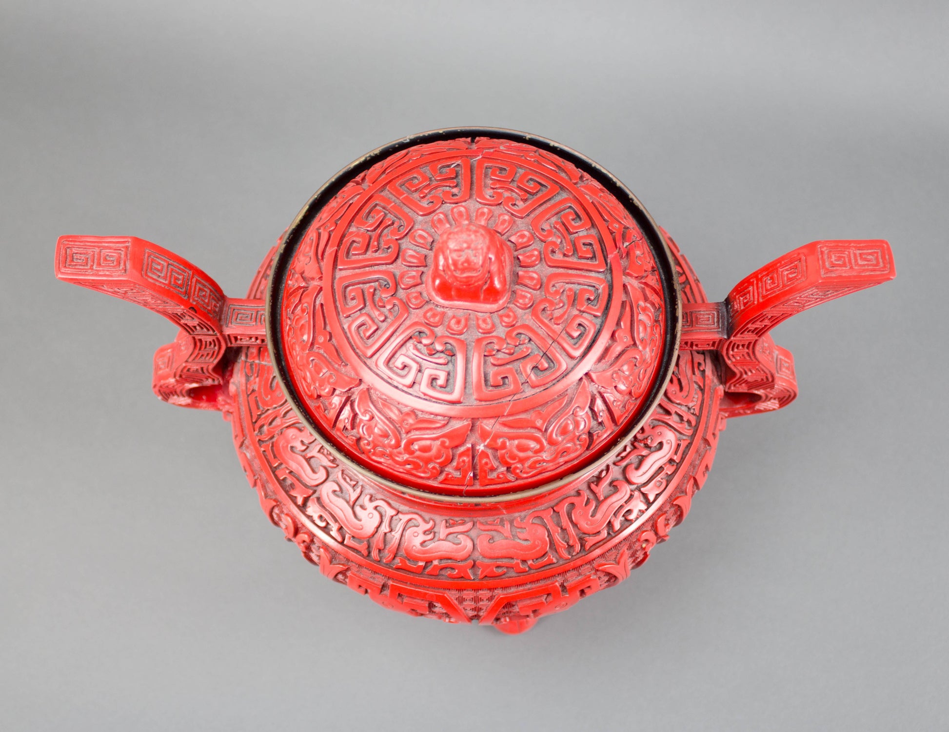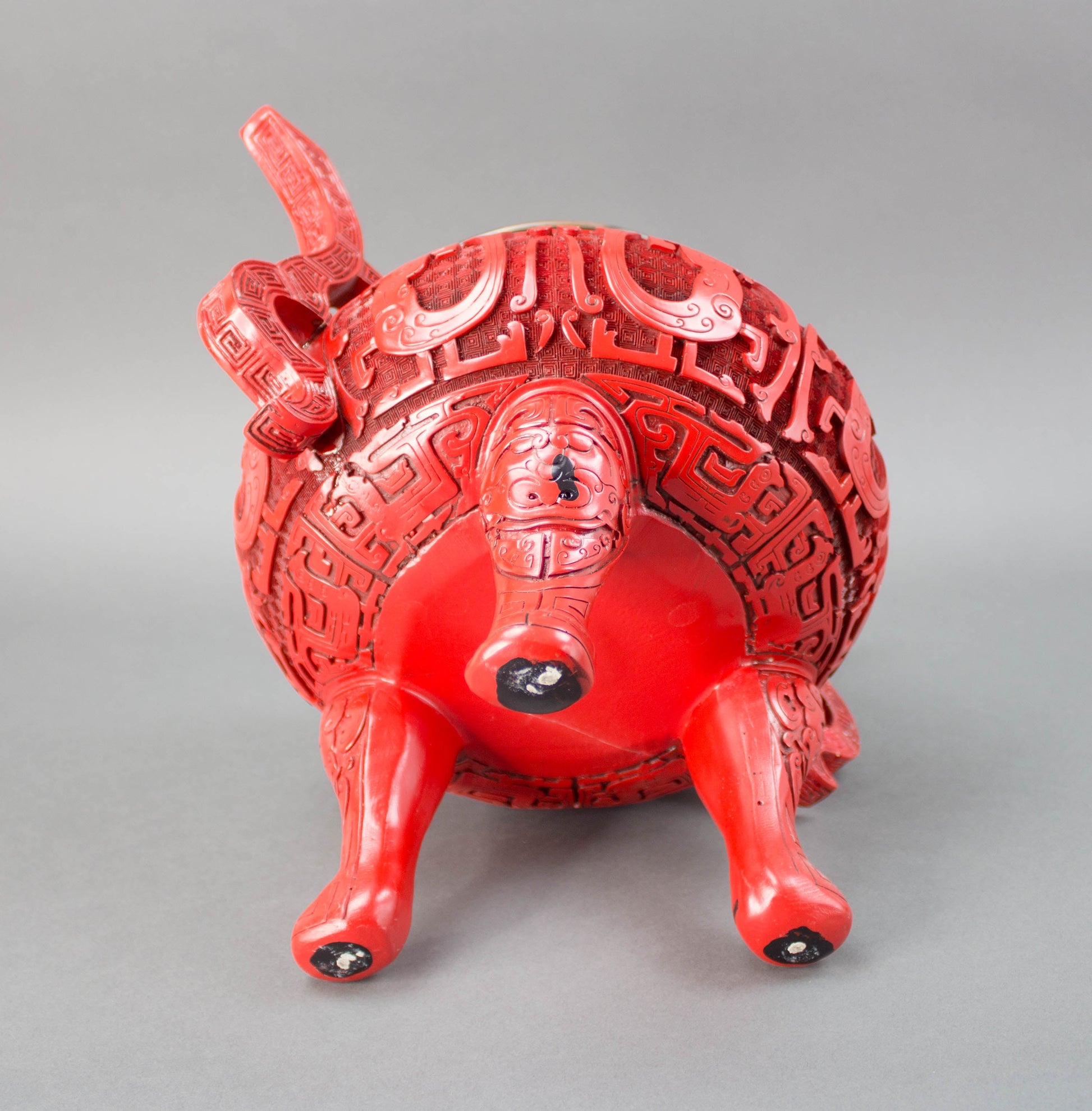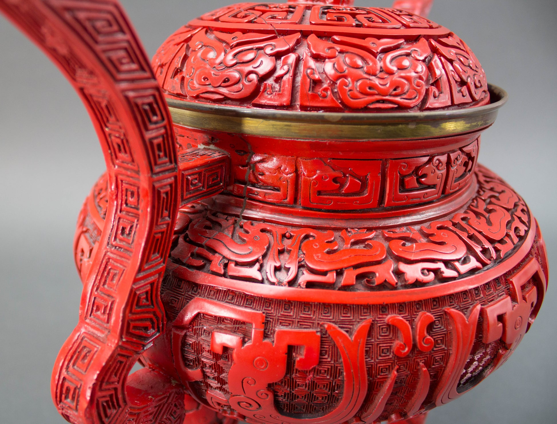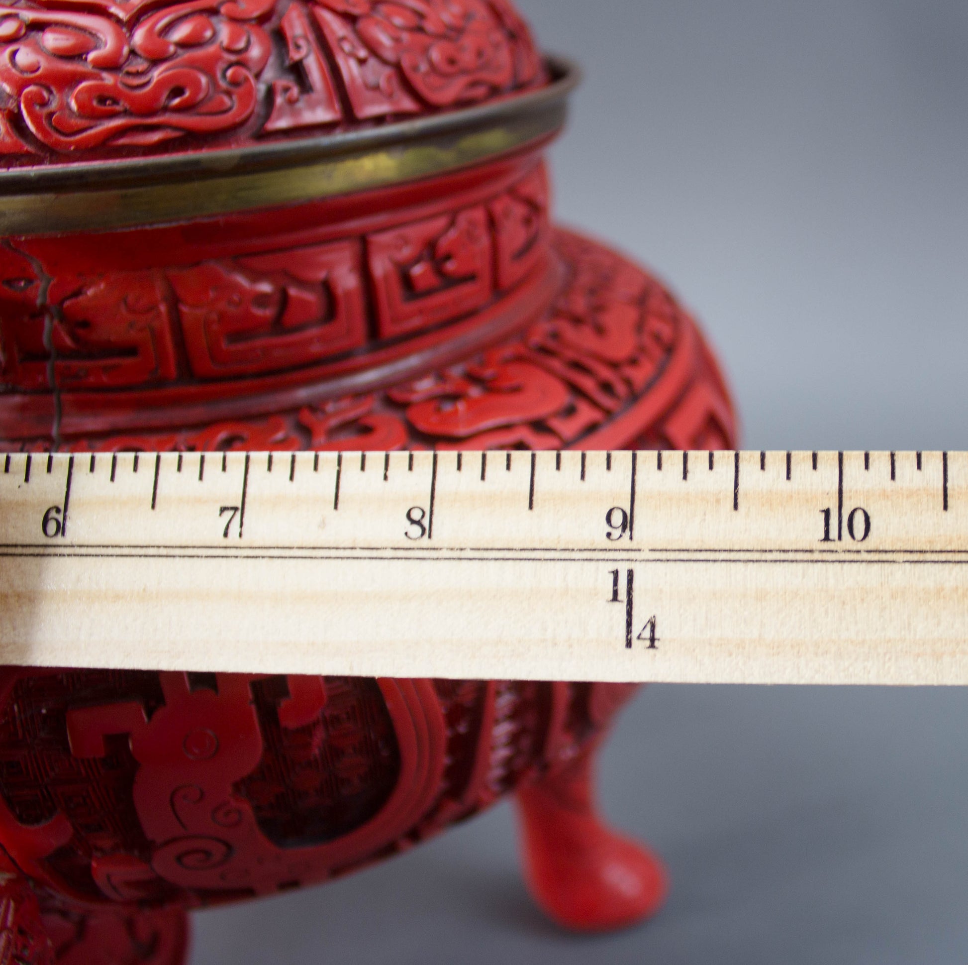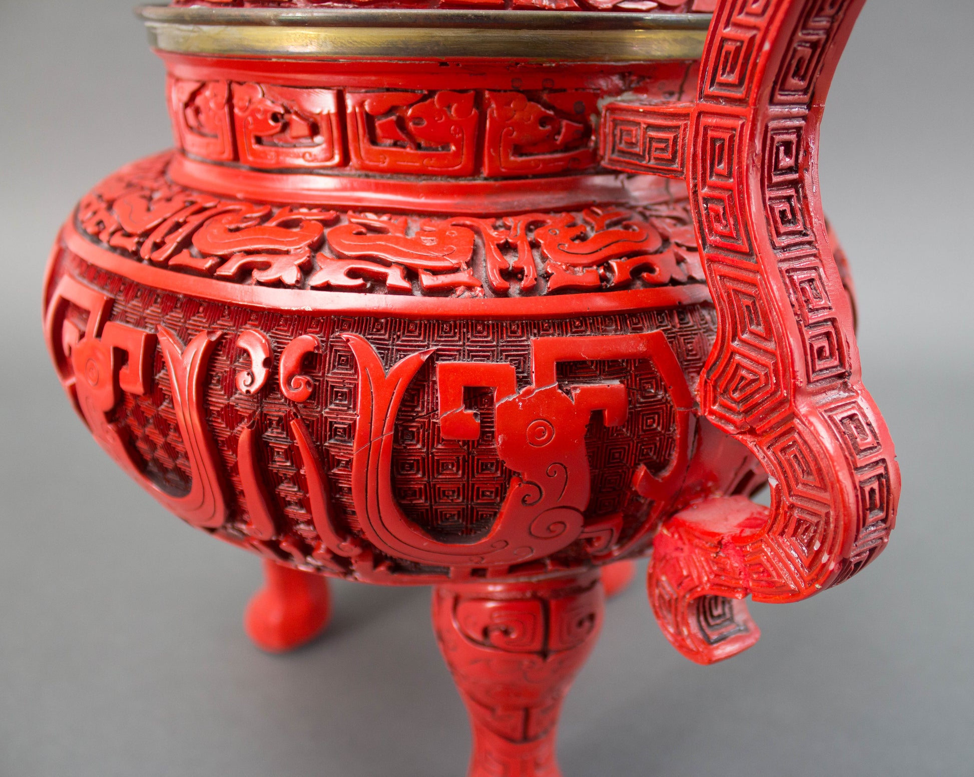 Chinese Republic Large Cinnabar Lacquered Tripod Incense Burner Foo Dog