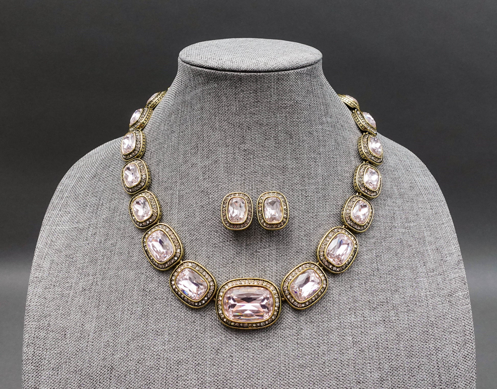 Heidi Daus Signed Exquisite Elegance Pale Gold Tone Pink Crystal Necklace & Earrings Set.