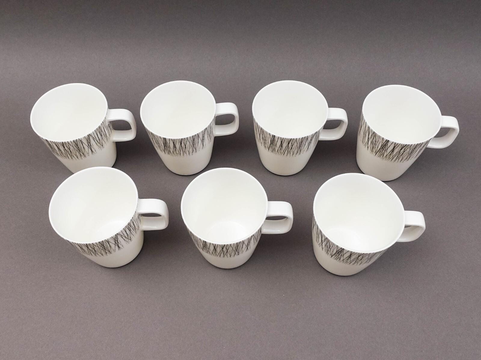 Crate & Barrel ITO Black & White Porcelain Mug Cup Set Of 7.Measures approximately 4 5/8" long, 3 1/2" wide, 4" high.Excellent pre-owned condition. Item is being sold as found. No chips, cracks orrepairs. Overall fantastic appearance!!!