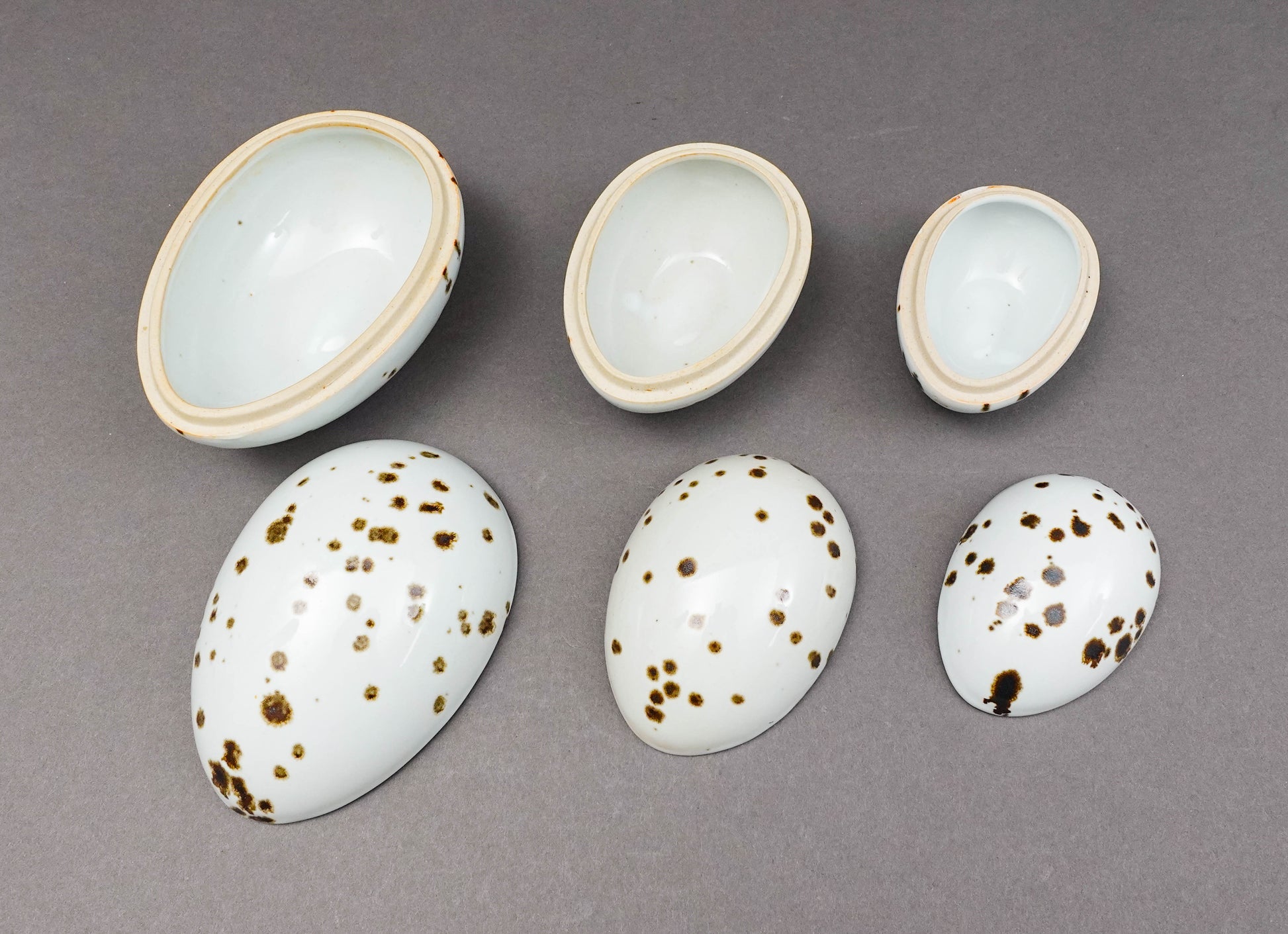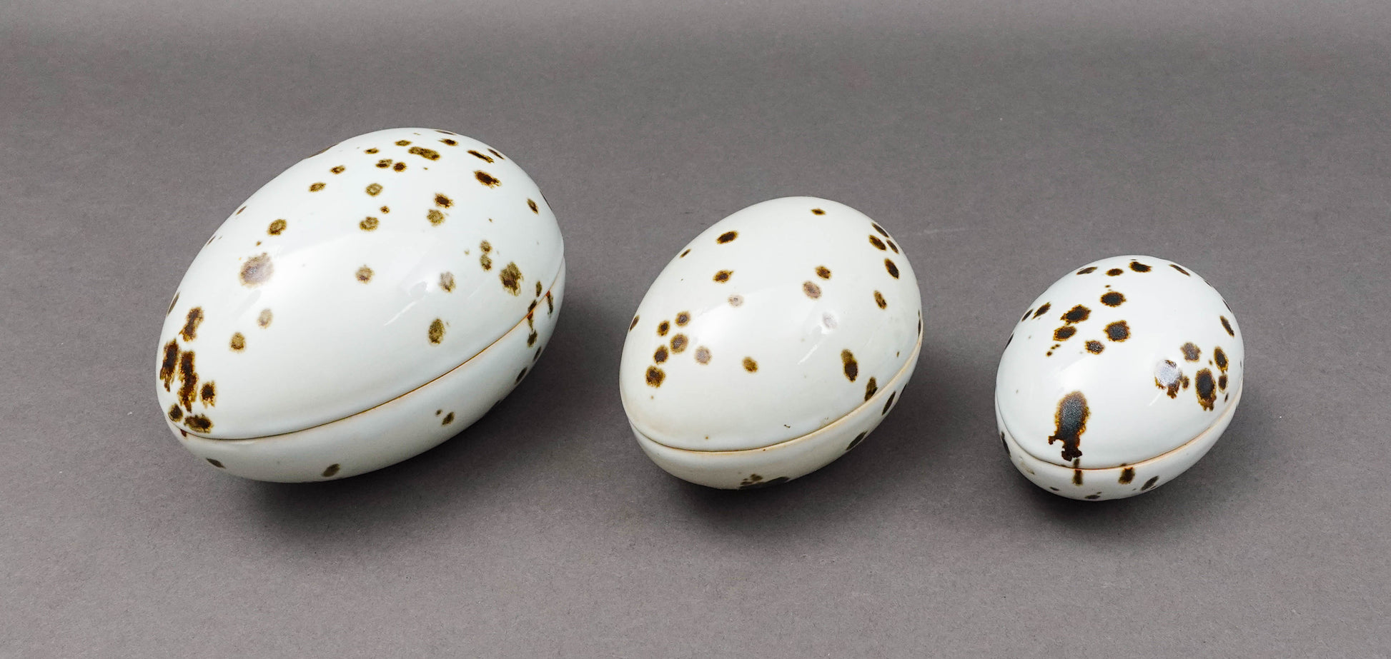 Dansk Denmark Egg Shaped Speckled Stoneware Lidded Trinket Box Dish Set Of 3. No marks.