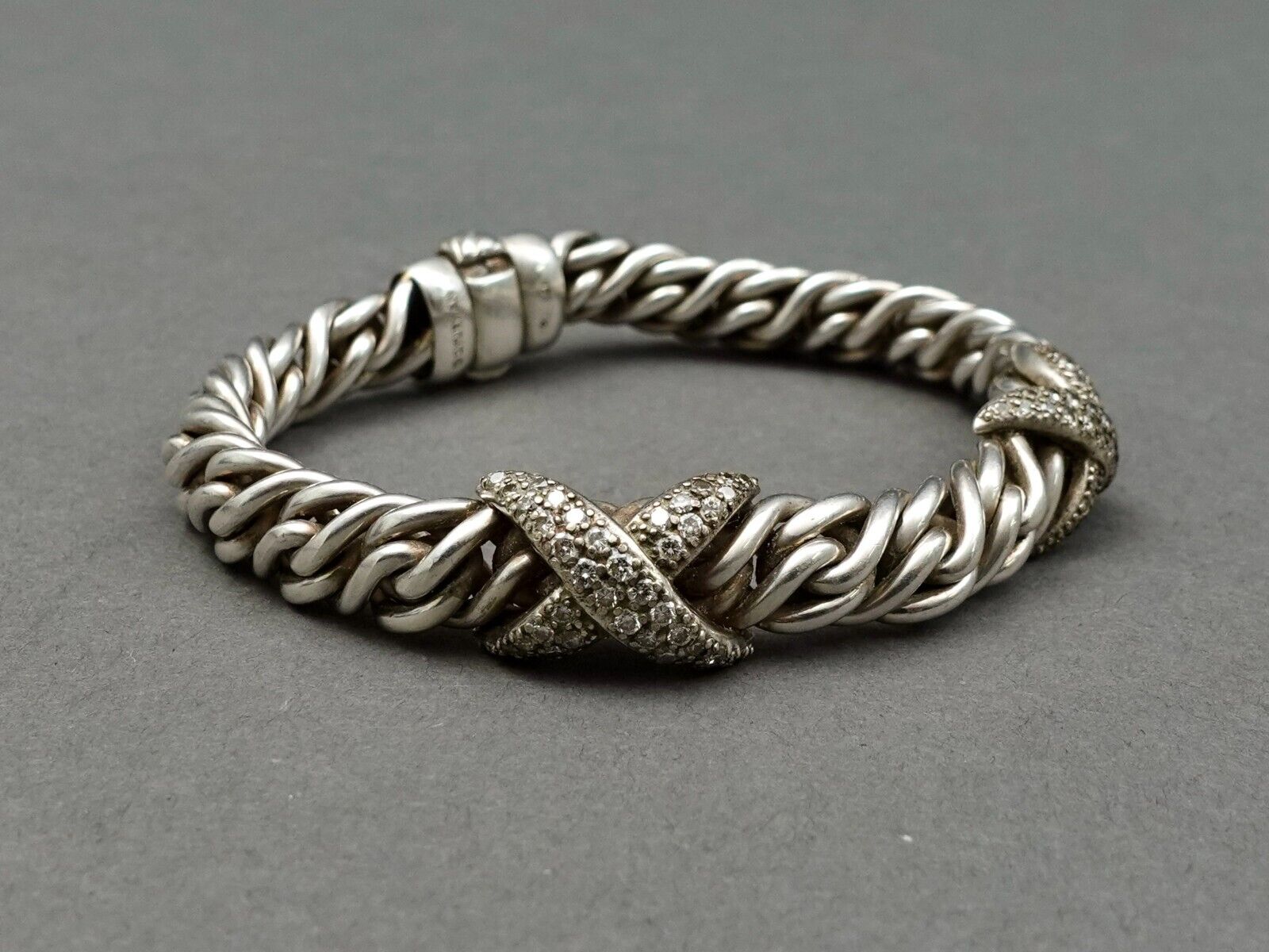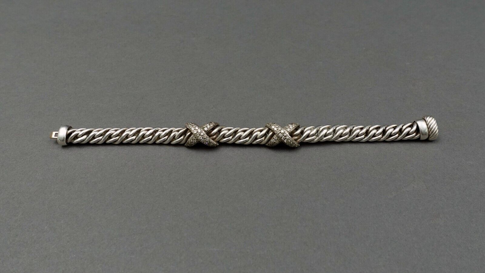 David Yurman Lyrica Double X Pave Diamond Sterling Silver Braided Link Bracelet.Measures approximately 6 3/4" circumference, 3/8" wide. 54.4 grams.Excellent pre-owned condition. Item is being sold as found. Overall fantastic appearance!!!