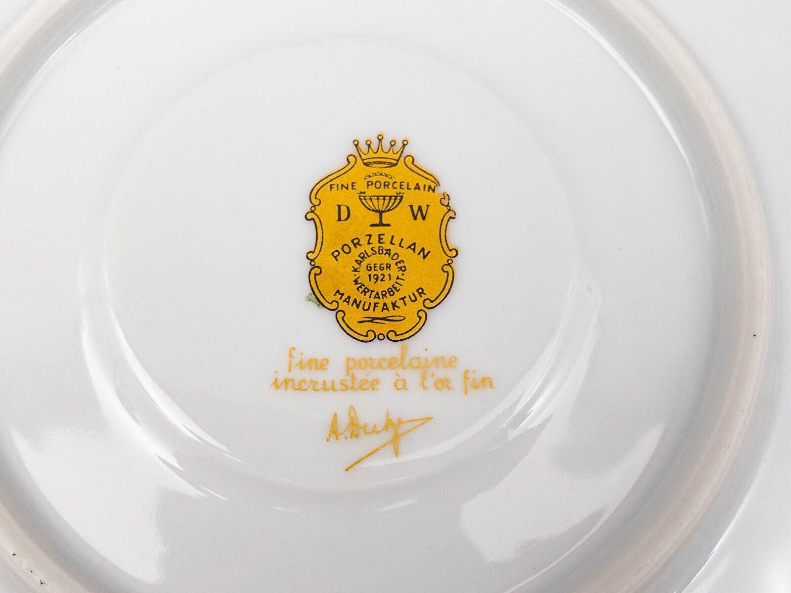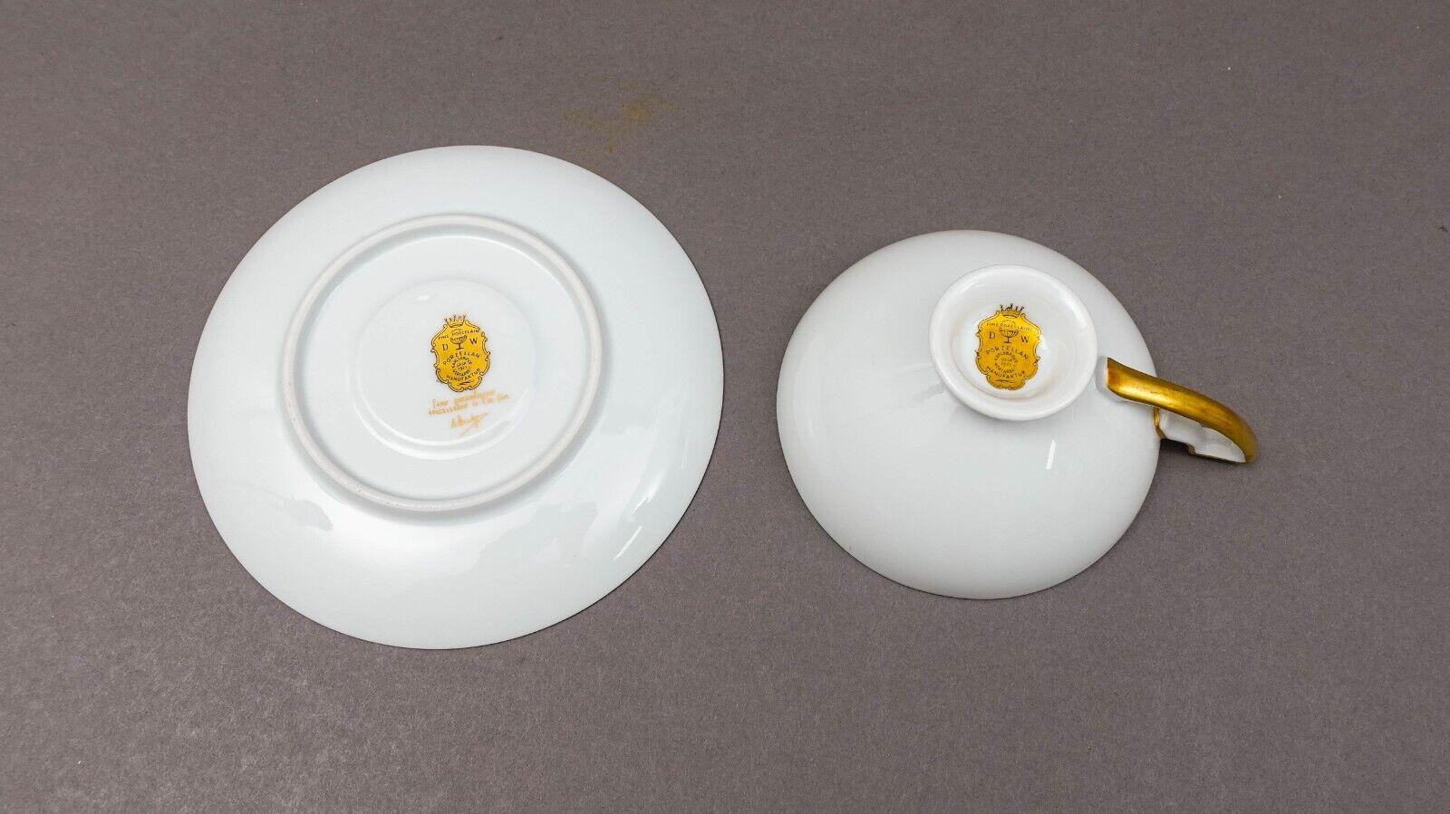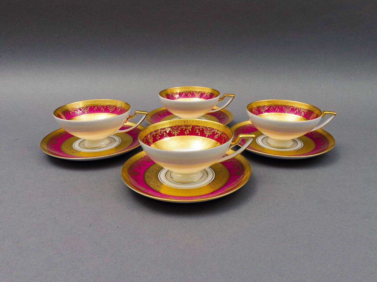 DW Porzellan Karlsbader Wertarbeit Fuchsia Gold Encrusted Cup & Saucer Set Of 4