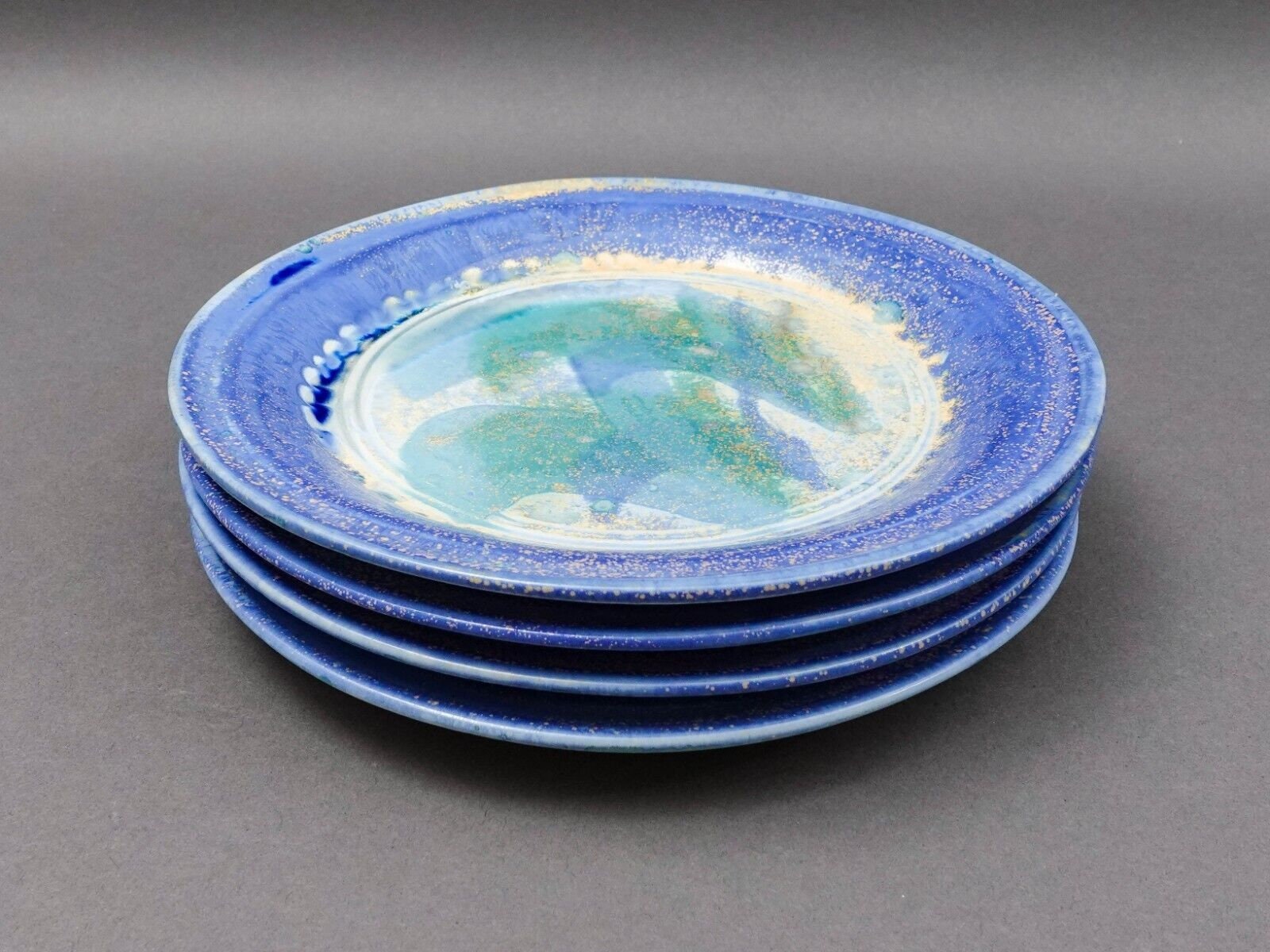 Edgecomb Potters Maine Blue Green Crystalline Glazed Studio Art Pottery Salad Plate Set 4.