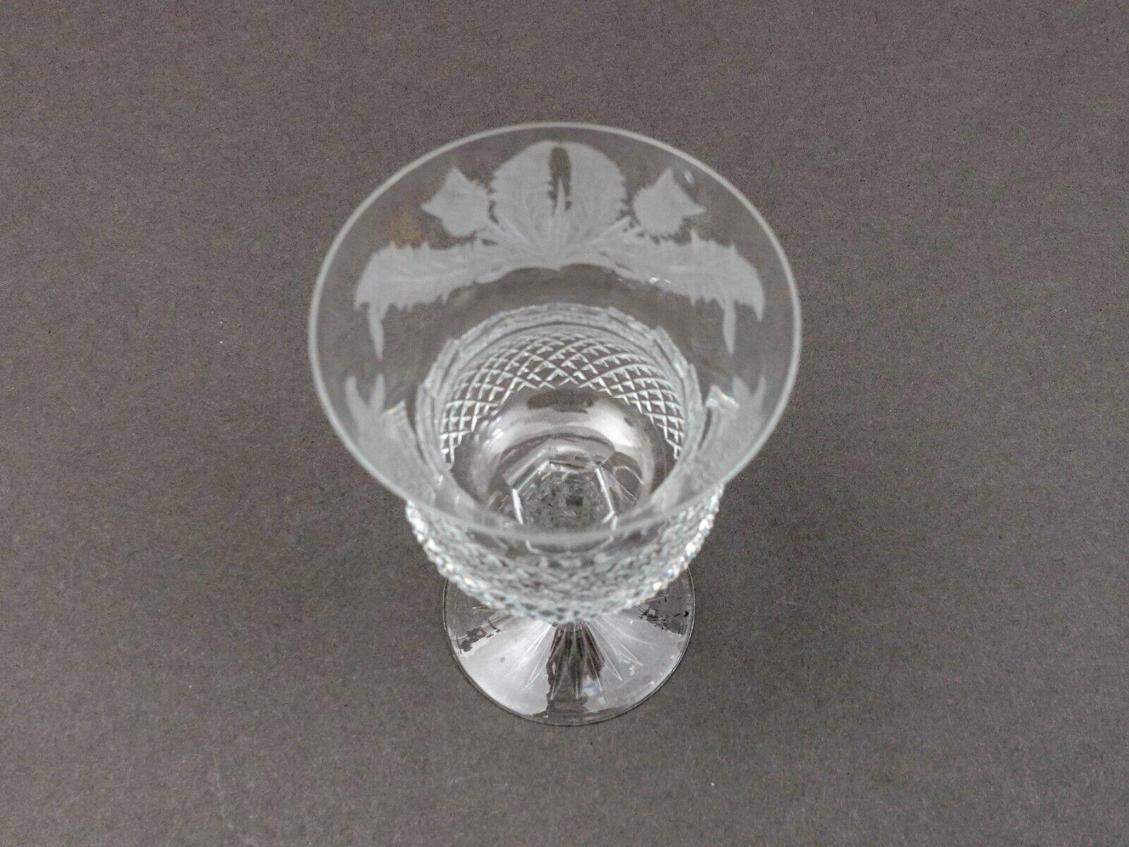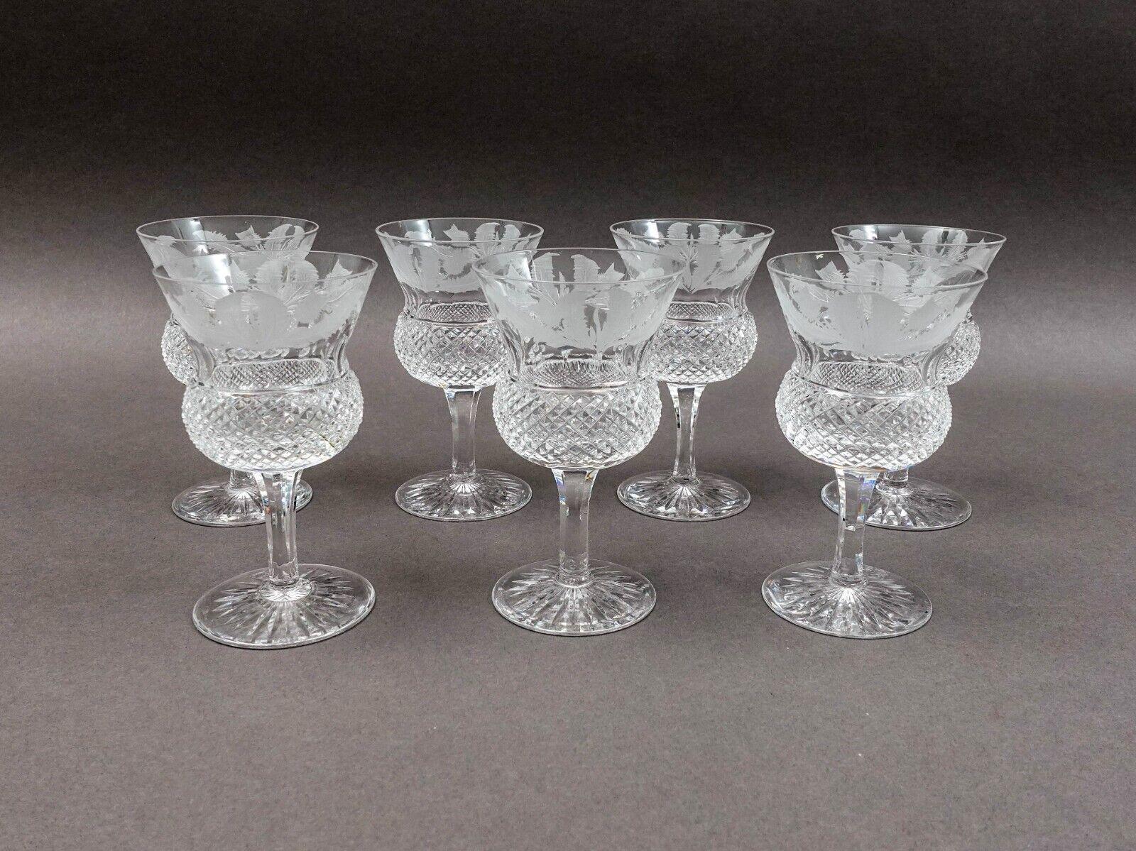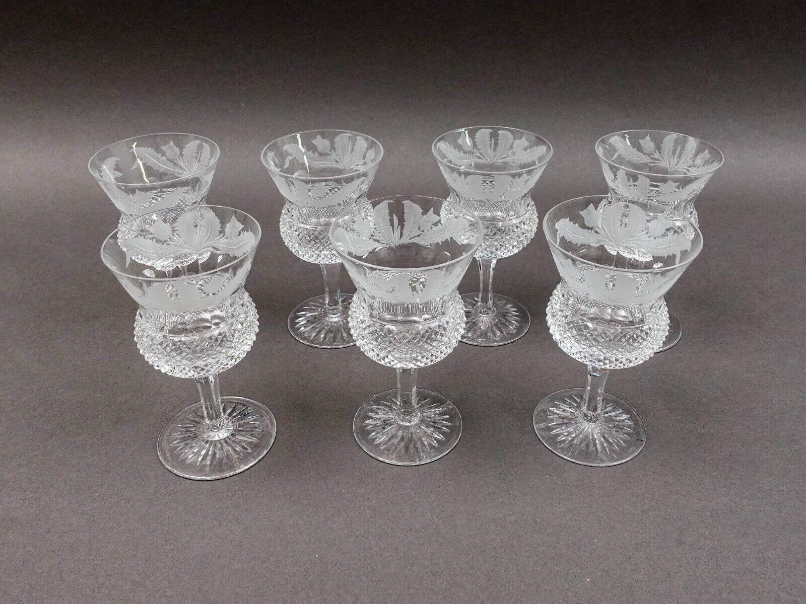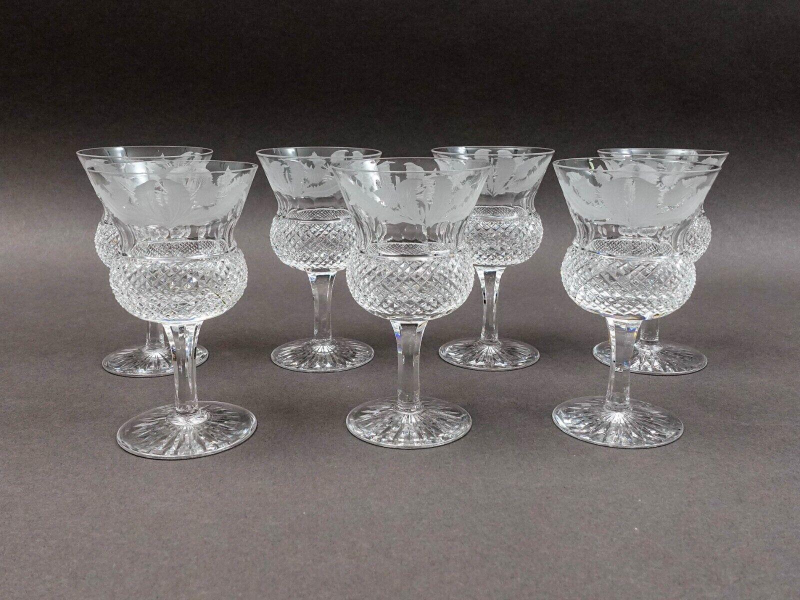 Edinburgh Crystal Scotland Thistle 4 1/4" Sherry Glasses Set Of 5.Measures approximately 2 3/8" diameter, 4 1/4" high.Great pre-owned condition. Item is being sold as found. No chips, cracks or