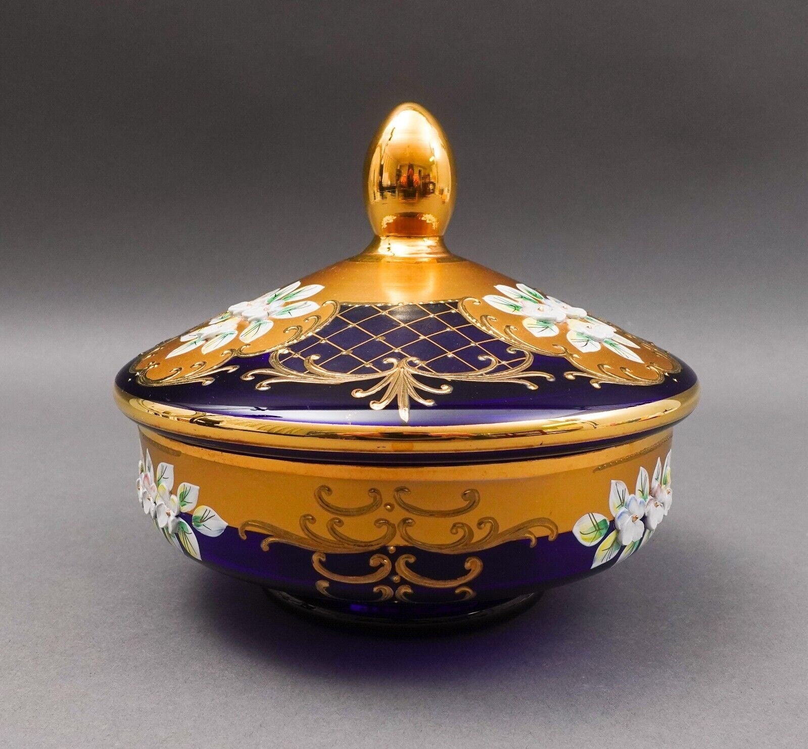 Egermann Czech Bohemian Cobalt Blue 24K Gold Enamel Lidded Bowl Dish Trinket Box.