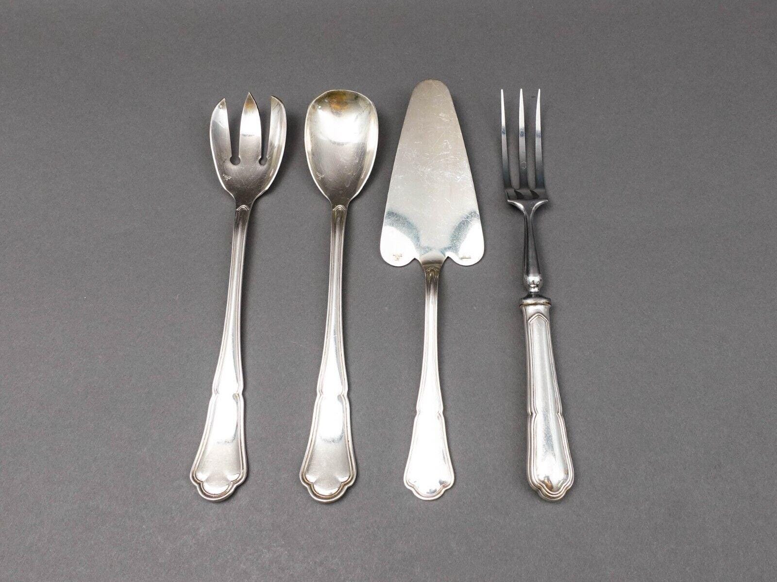 Set.Measures approximately Salad Fork Server 10 1/4" long Salad Spoon Server 10 1/8" long Pie Cake Server 10 1/2" long Meat Fork Server 10 1/4" longVery good pre-owned condition. Item is being sold as found. No chips, cracks or repairs. Some use scratches and patina.