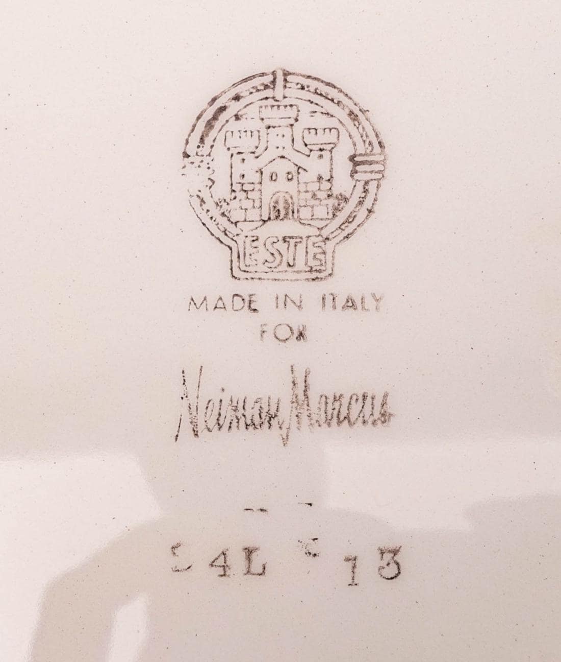 Este Italy Neiman Marcus Orange Sponge Charger Service Plate Set Of 4Measures approximately 12 7/8" diameter.Good pre-owned condition. Item is being sold as found. No cracks or repairs. One has two tiny flakes to border to one area, one has tiny flake to edge and