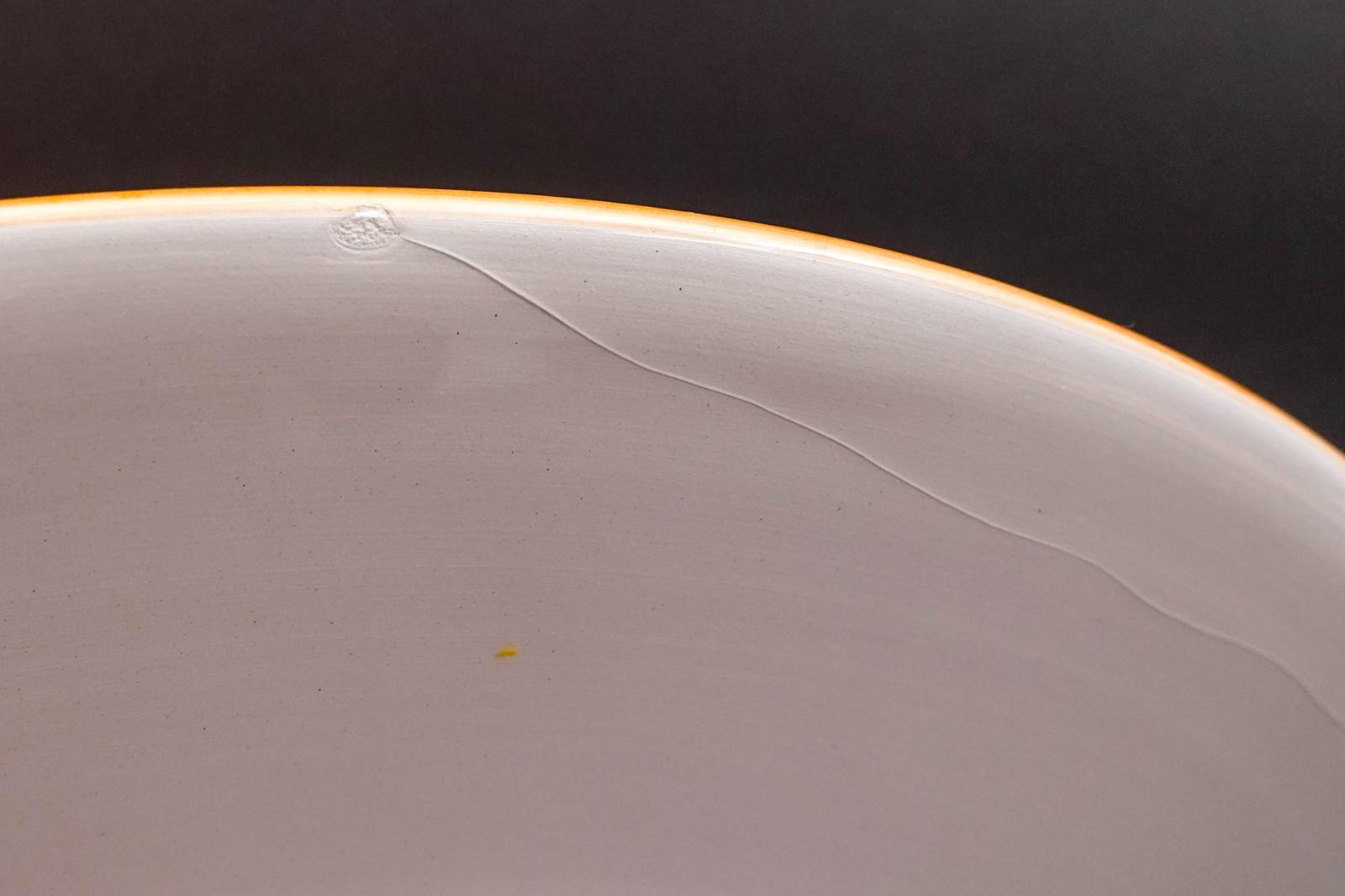 utensil scratches, one has two flakes to bottom edge and a crazing line to underside, one is excellent