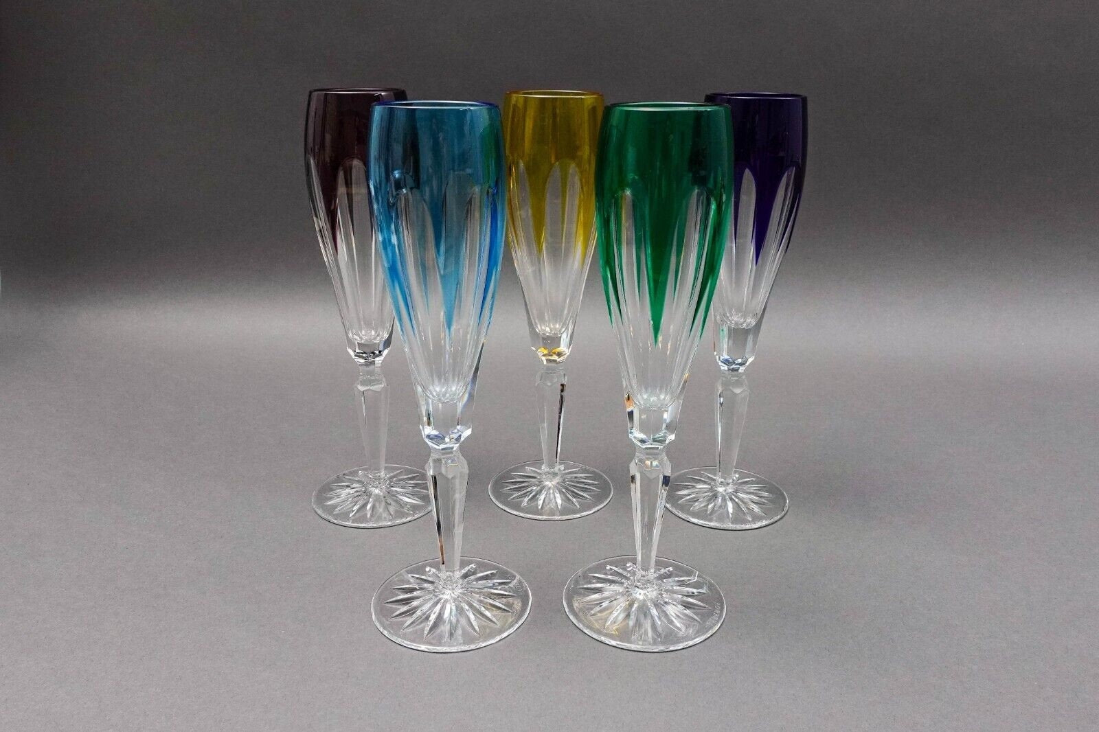 Faberge Crystal Lausanne Multicolored Champagne Flute Glasses Set Of 5.