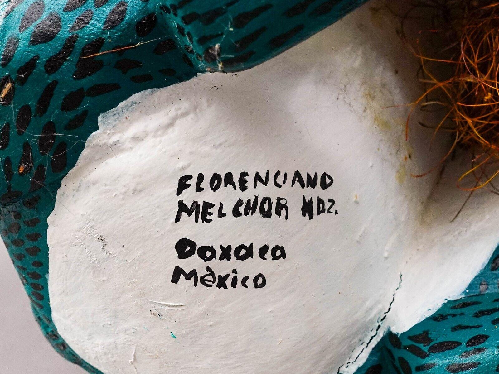 Florenciano Melchor Mdz. Oaxaca Mexico Wood Carving Lion Cat Art Sculpture.Measures approximately 18 1/2" long, 8 3/4" wide, 10 1/2" high.Excellent pre-owned condition. Item is being sold as found. No chips, cracks or