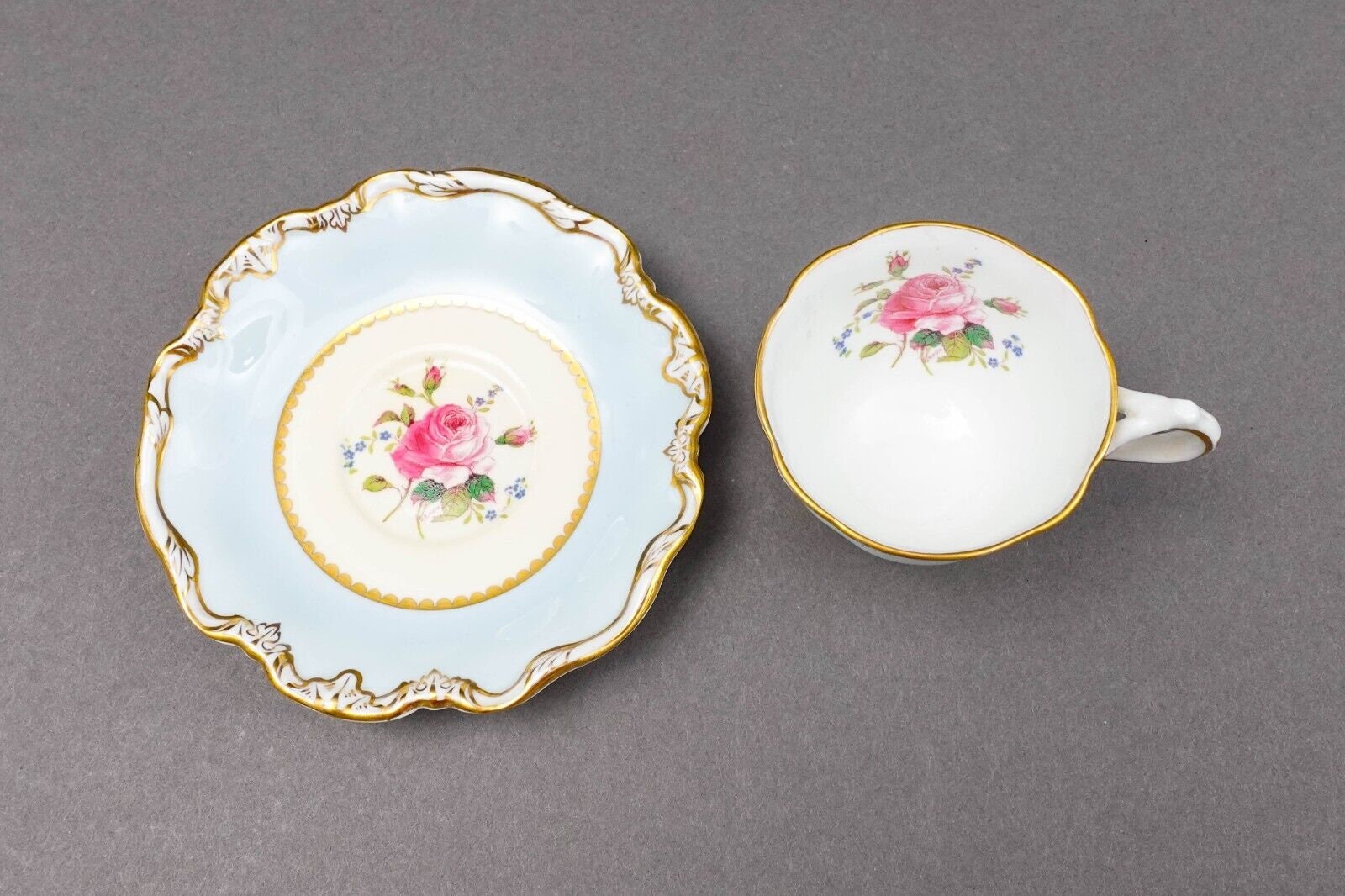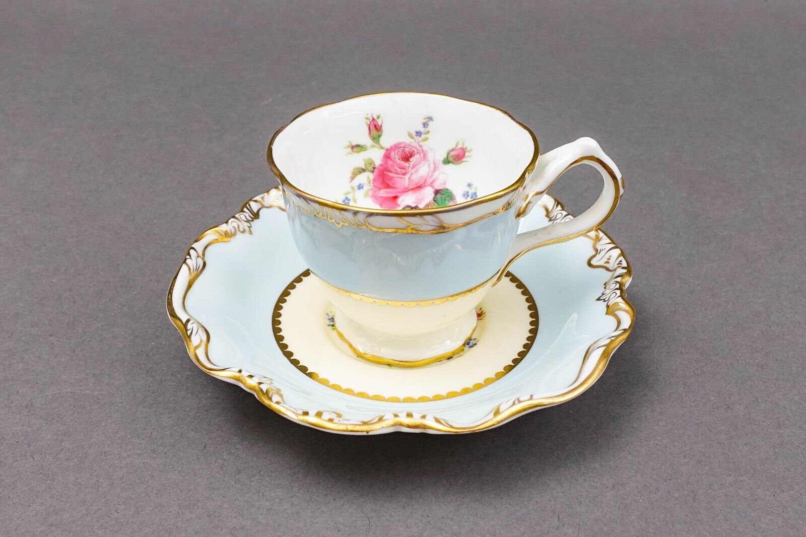 George Jones Crescent England Rose Floral Blue Gold Demitasse Cup & Saucer