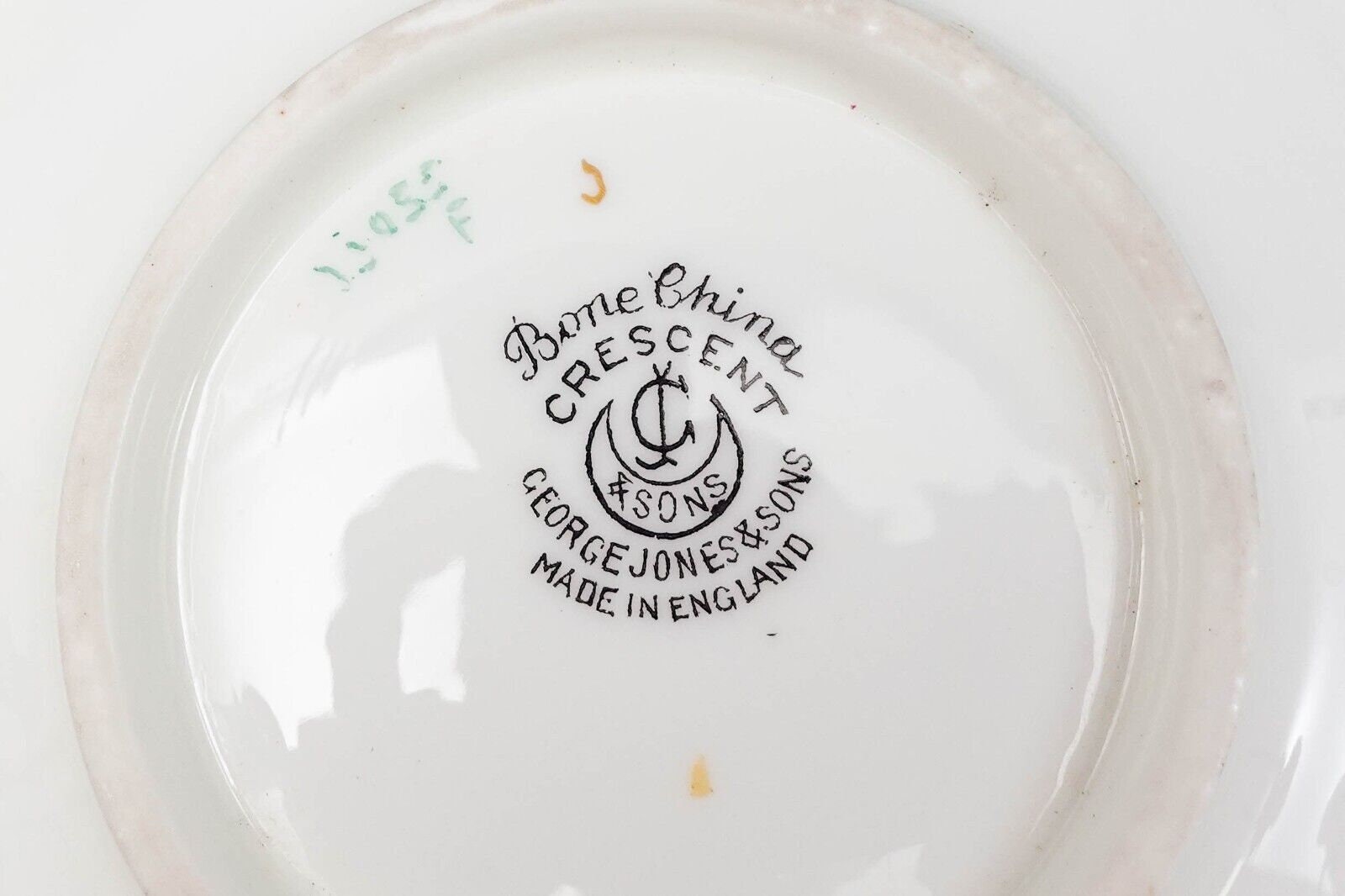 George Jones & Sons Crescent England Pink Rose Floral Blue & Gold Bone China Demitasse Cup & Saucer.