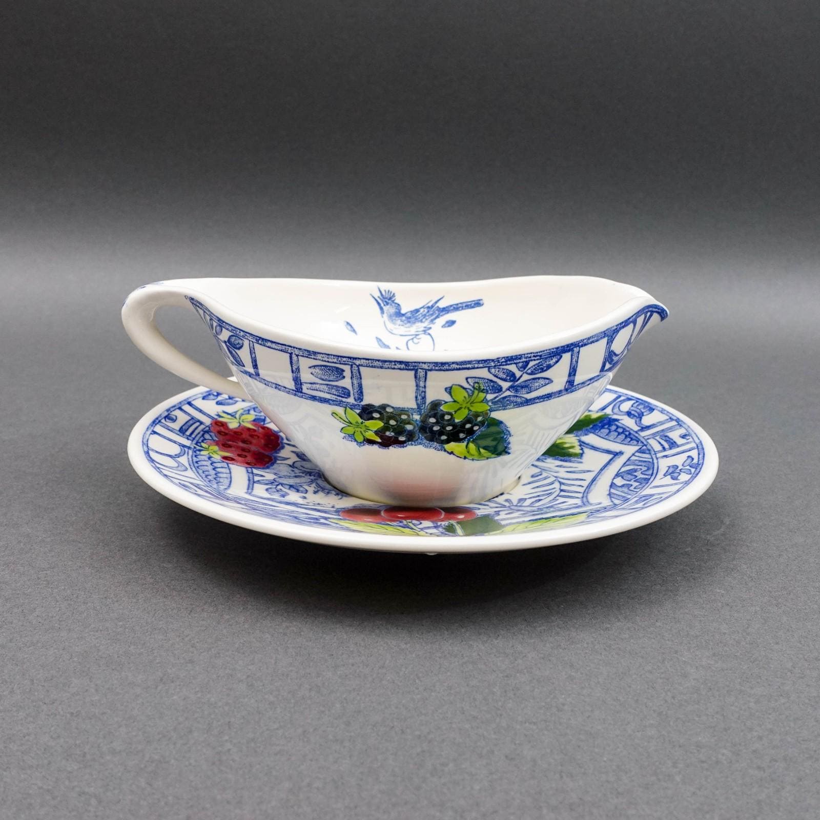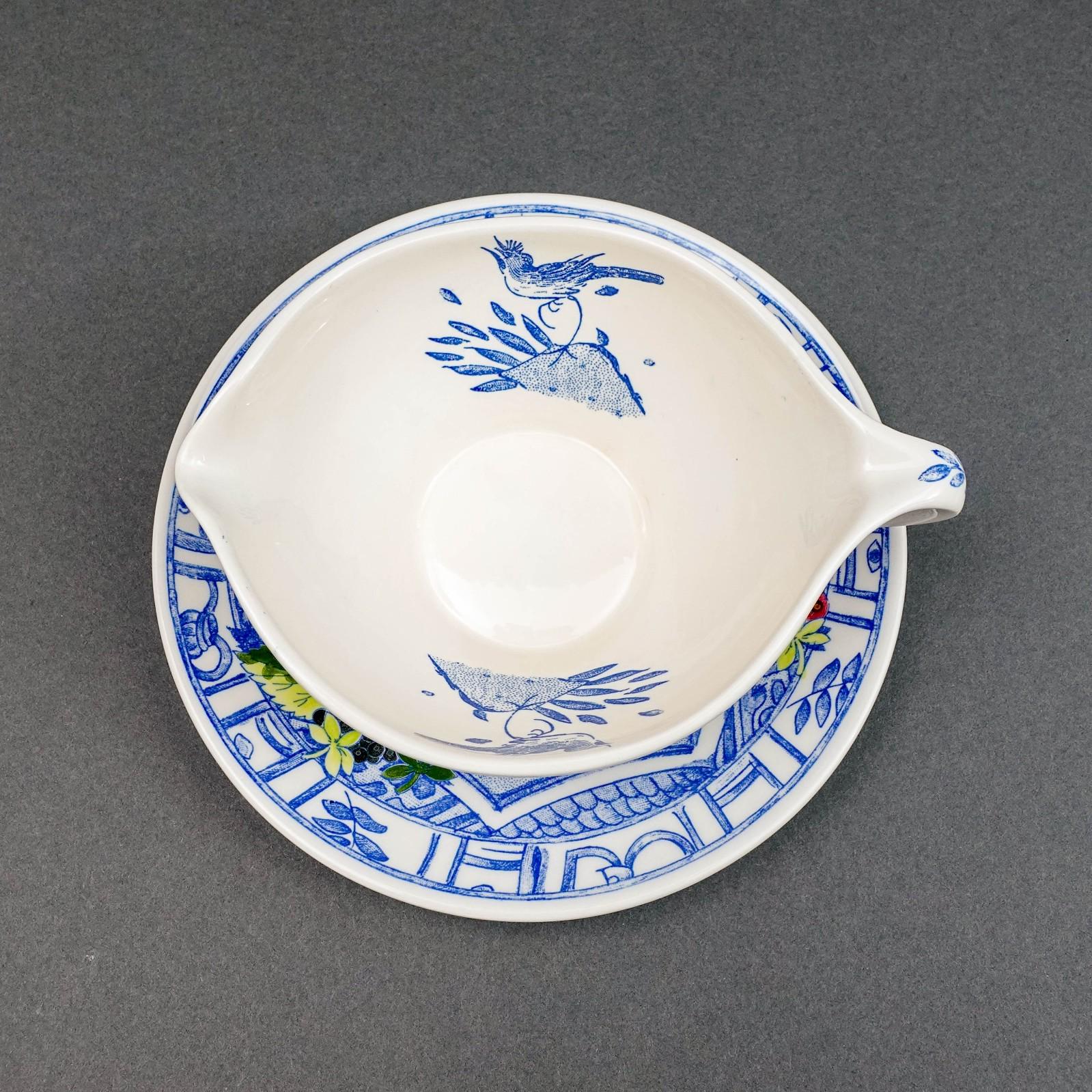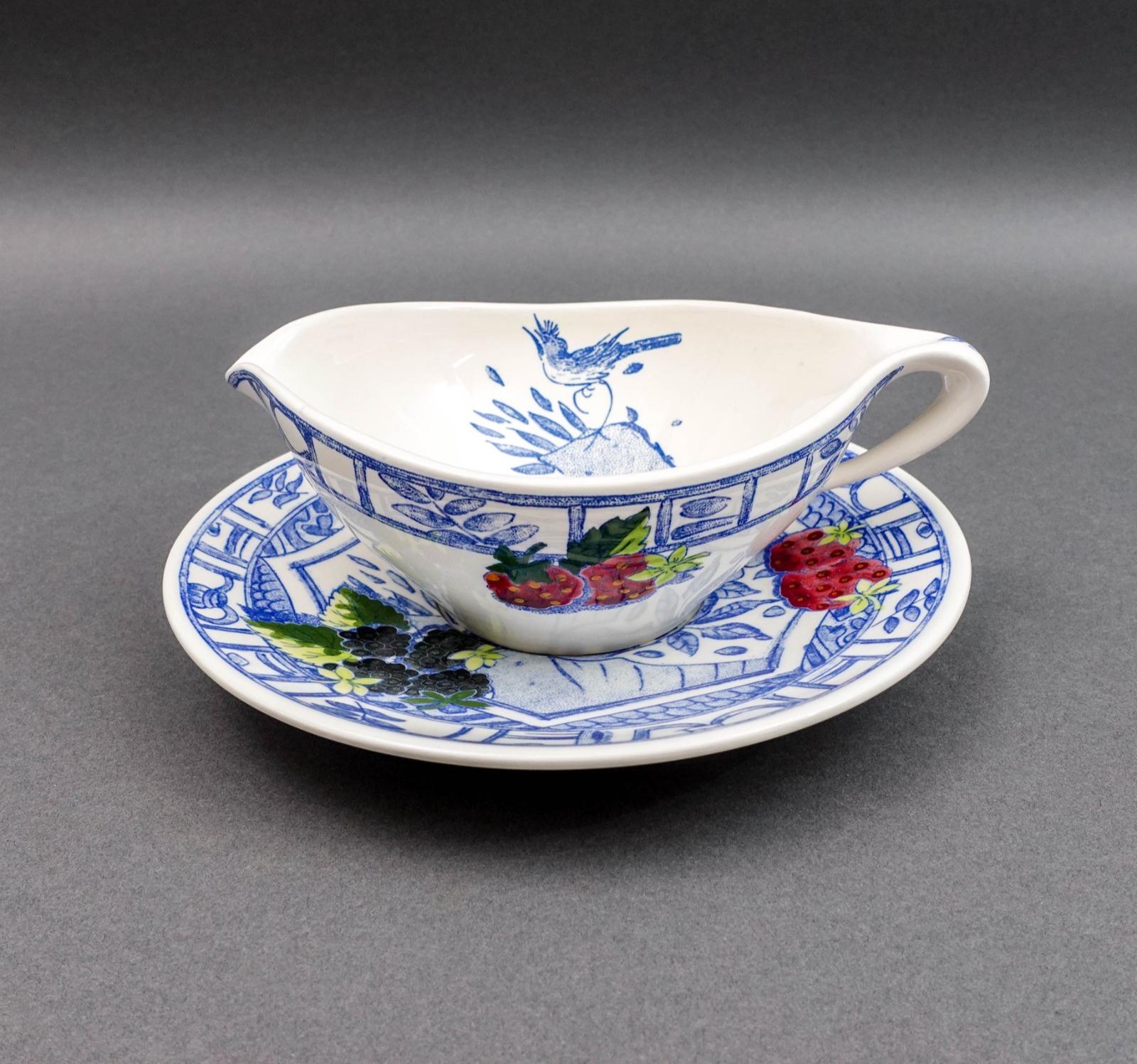 Gien France Oiseau Bleu Birds Fruits Gravy Sauce Boat & Underplate