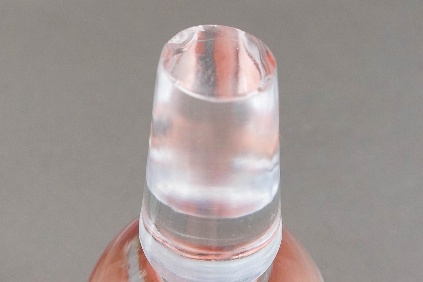 without stopper. Very good pre-owned condition. Item is being sold as found. No chips, cracks or repairs. Bottom of stopper has chips and a scuff where stopper sits on decanter opening.