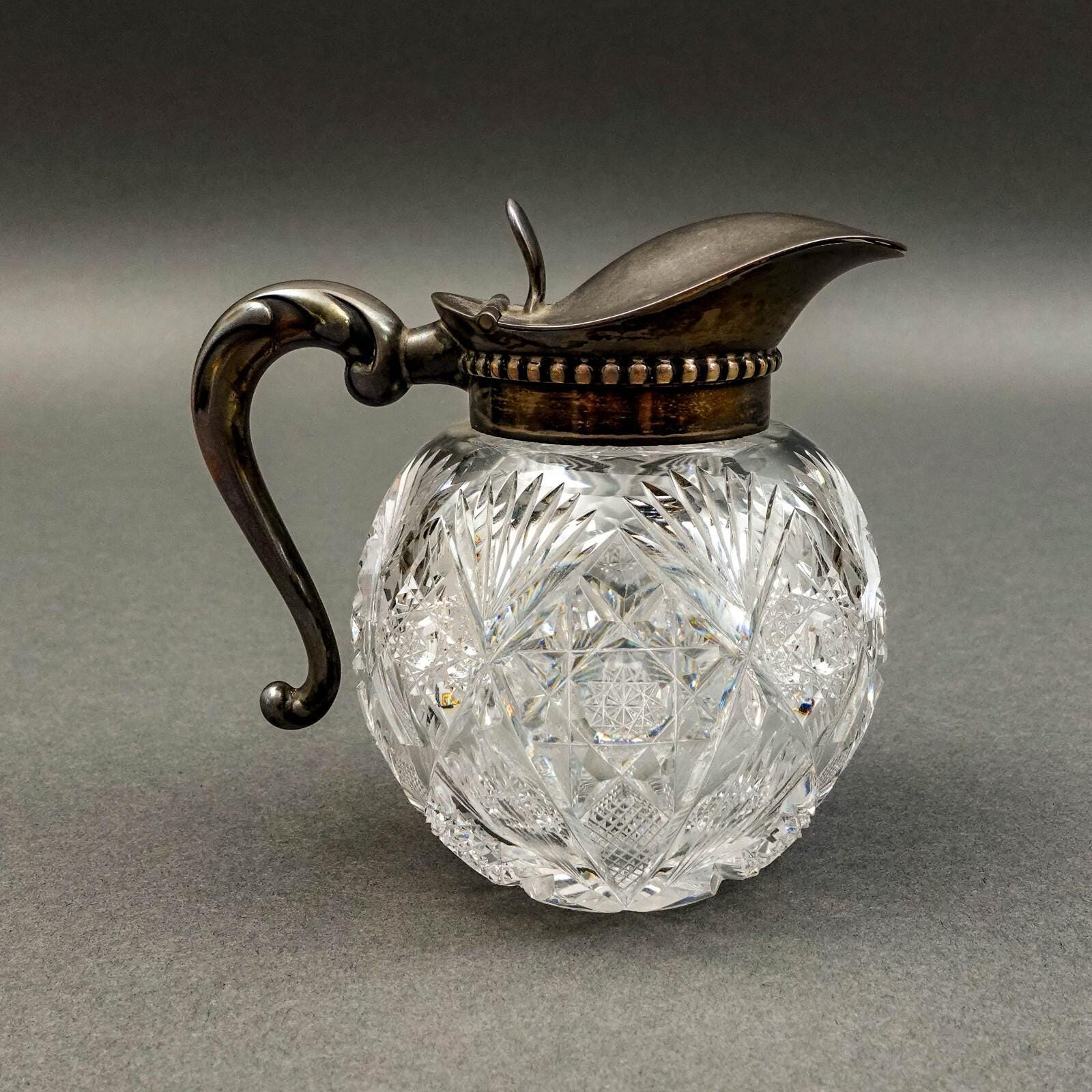 Hawkes NY Signed Sterling Silver Brilliant Cut Crystal Glass Syrup Jug Pitcher