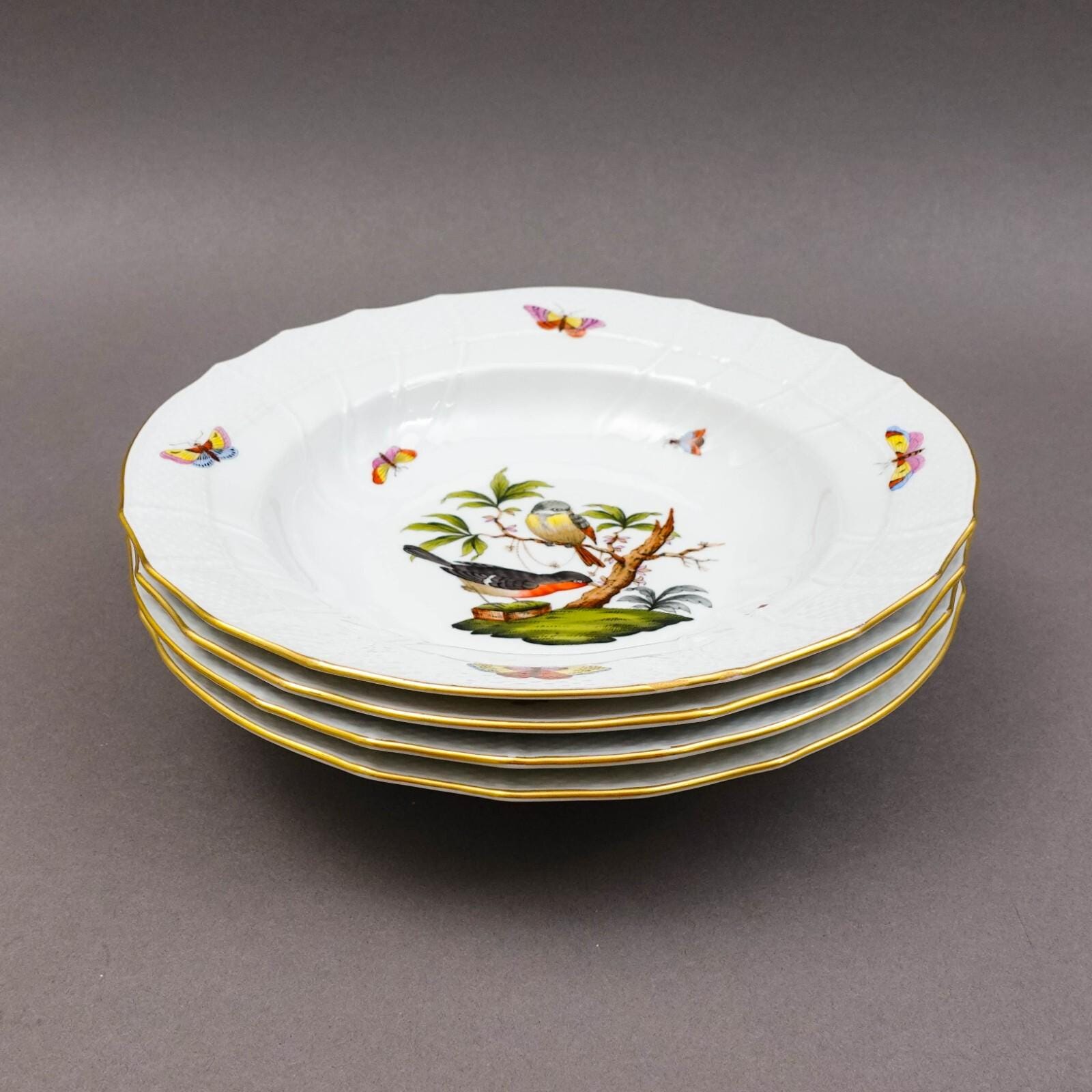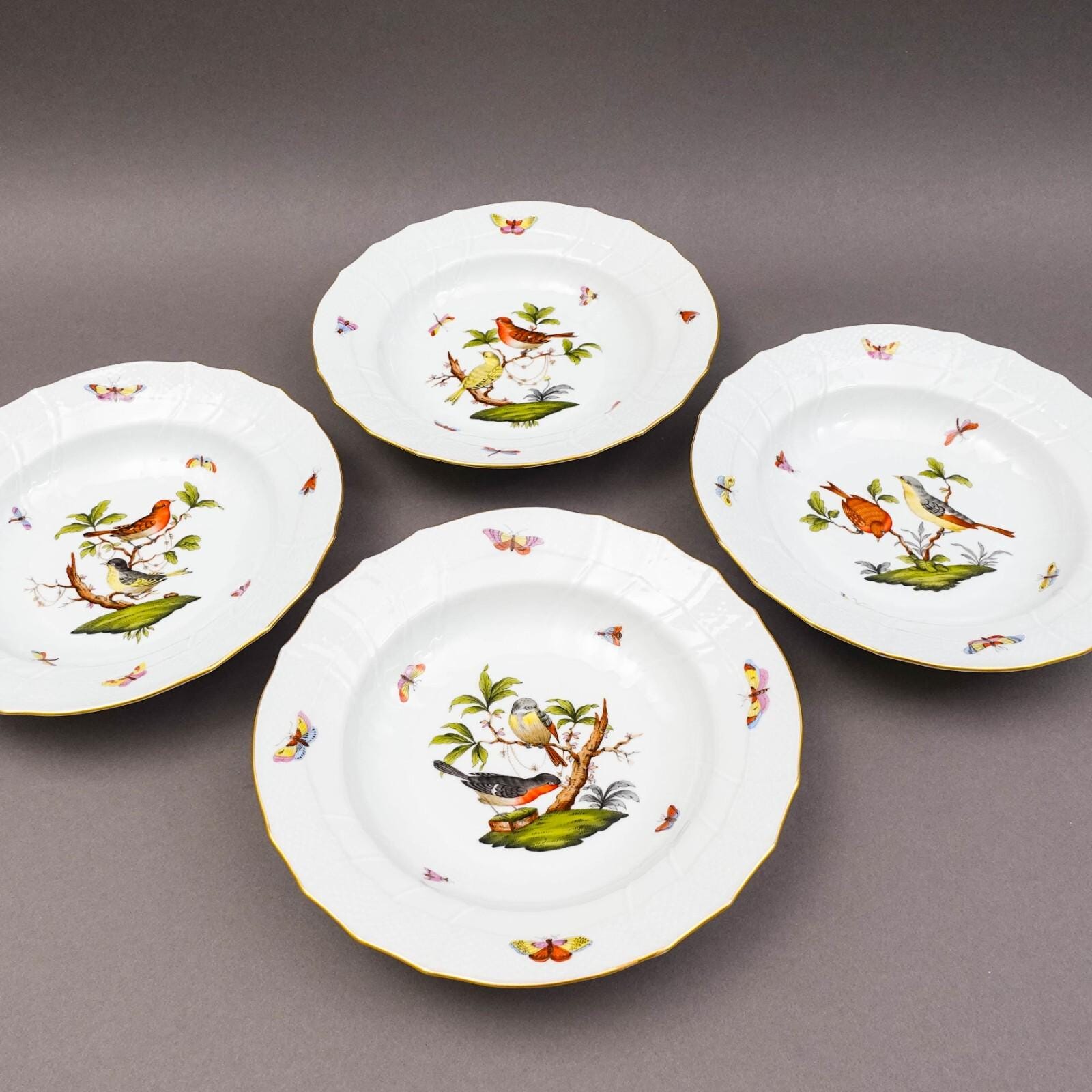 Herend Hungary Rothschild Bird 1501 Rimmed Soup Bowl Set Of 4.Measures approximately 9 1/2" diameter, 1 3/4" high.Excellent pre-owned condition. Item is being sold as found. No chips, cracks or