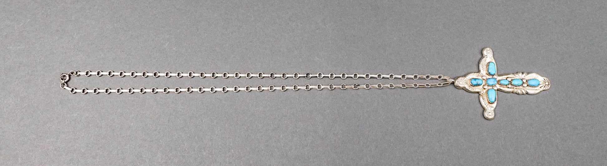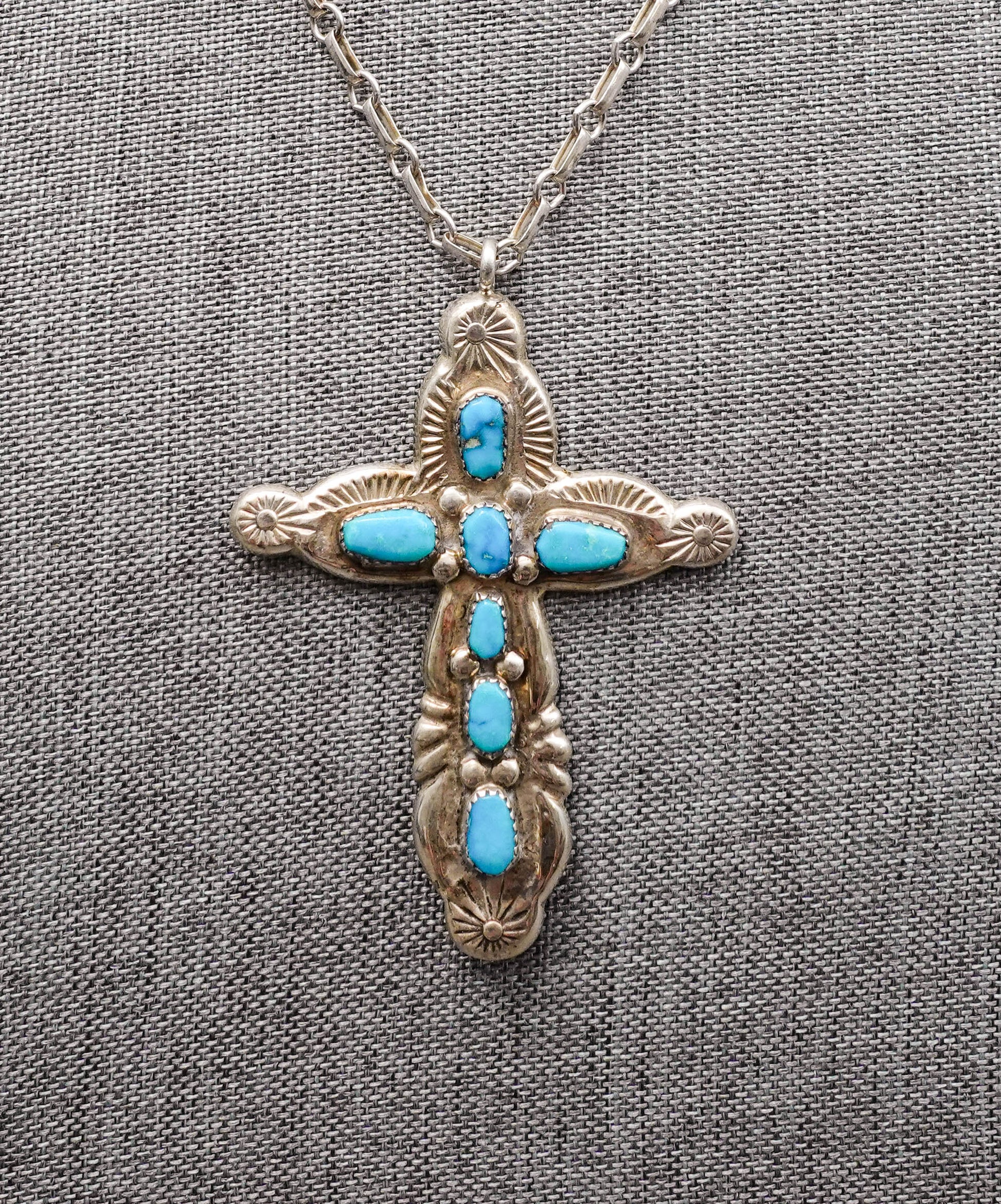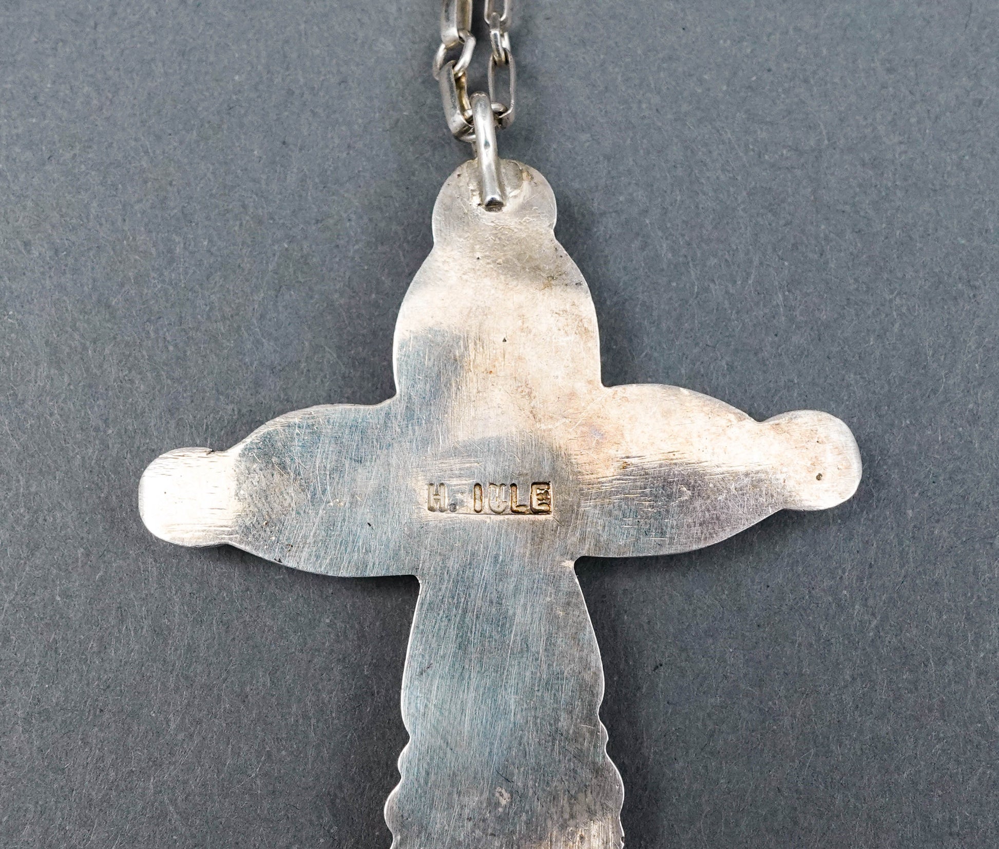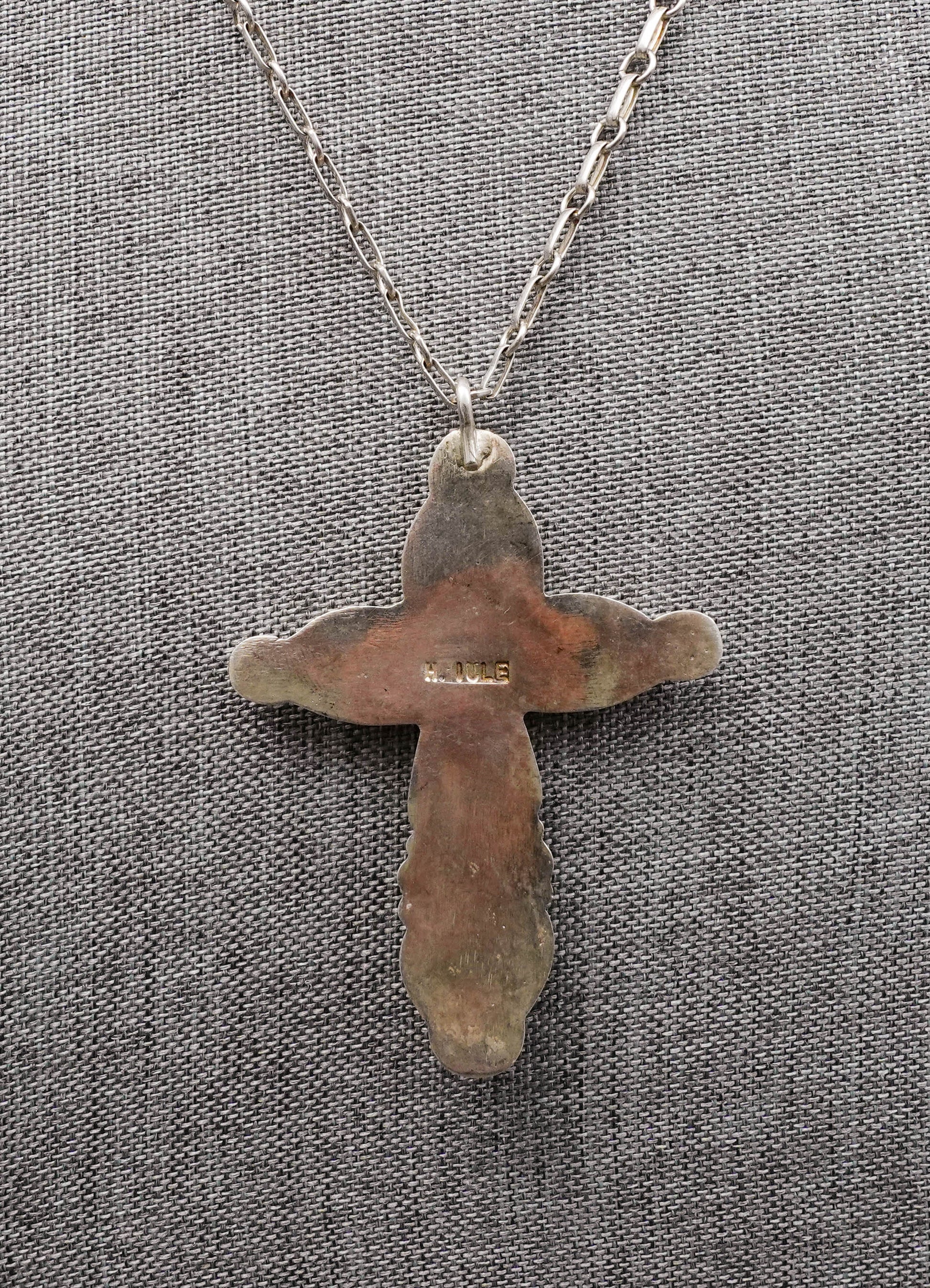 Horace Iule (1901-1978) Signed Native American Zuni Old Pawn Master Artist Sterling Silver Turquoise Cross Pendant With Chain Necklace.