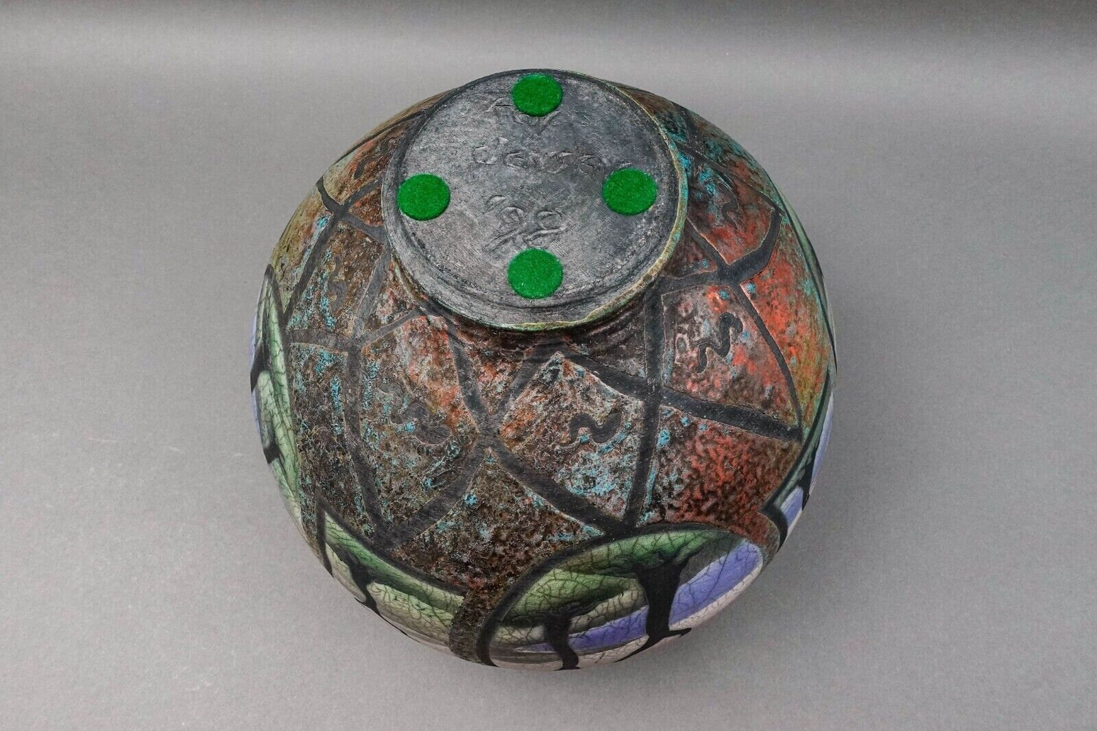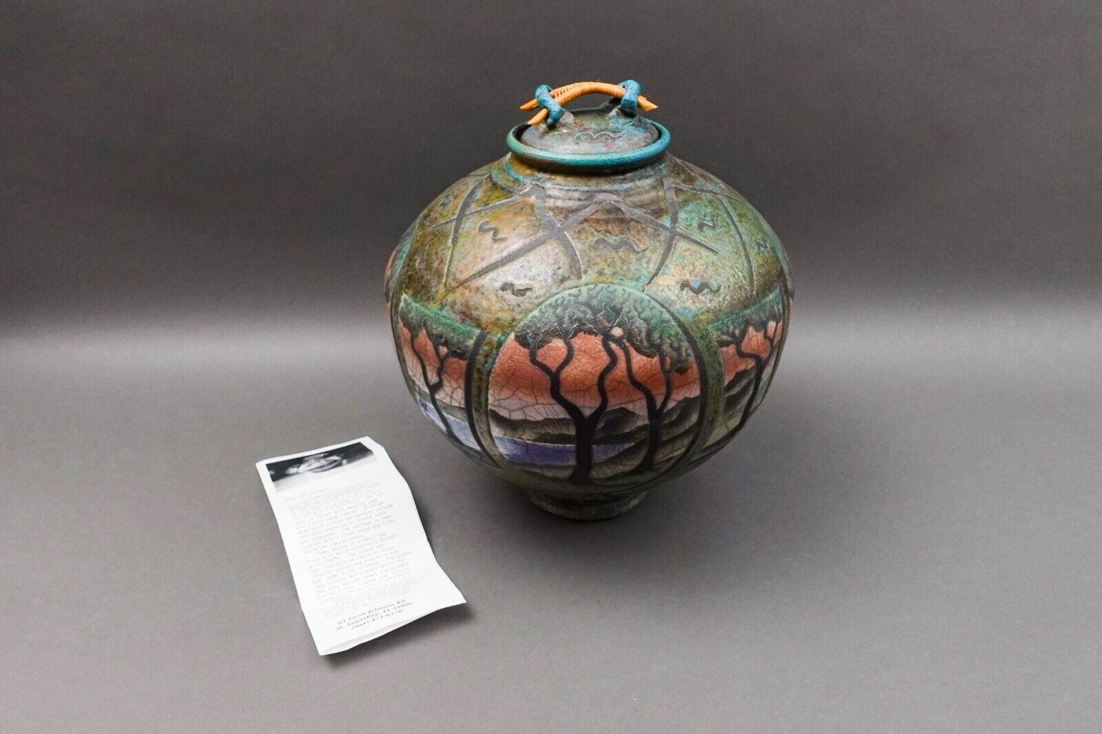 Gorgeous Ken Jensen 1998 Signed Large Landscape Scene Raku Studio Art Pottery Covered Vessel Pot Jar.