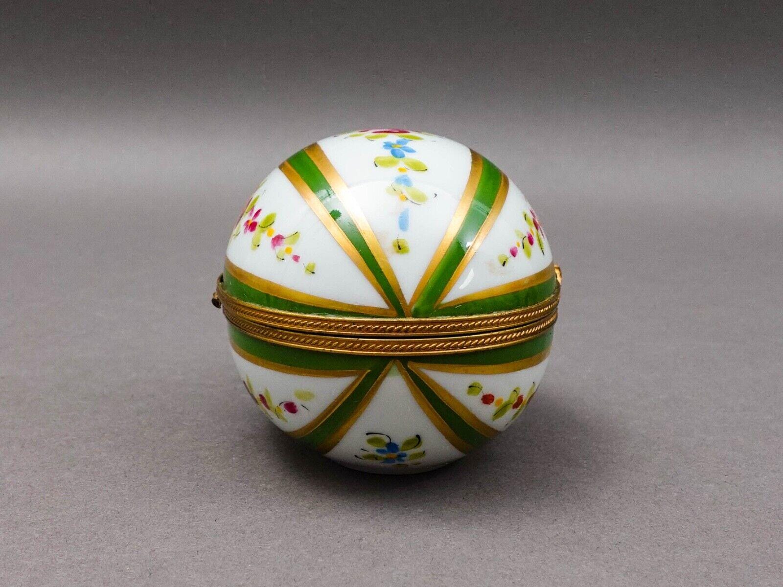 Limoges France Decor Main Hand Painted Green & Gold Floral Porcelain Egg Hinged