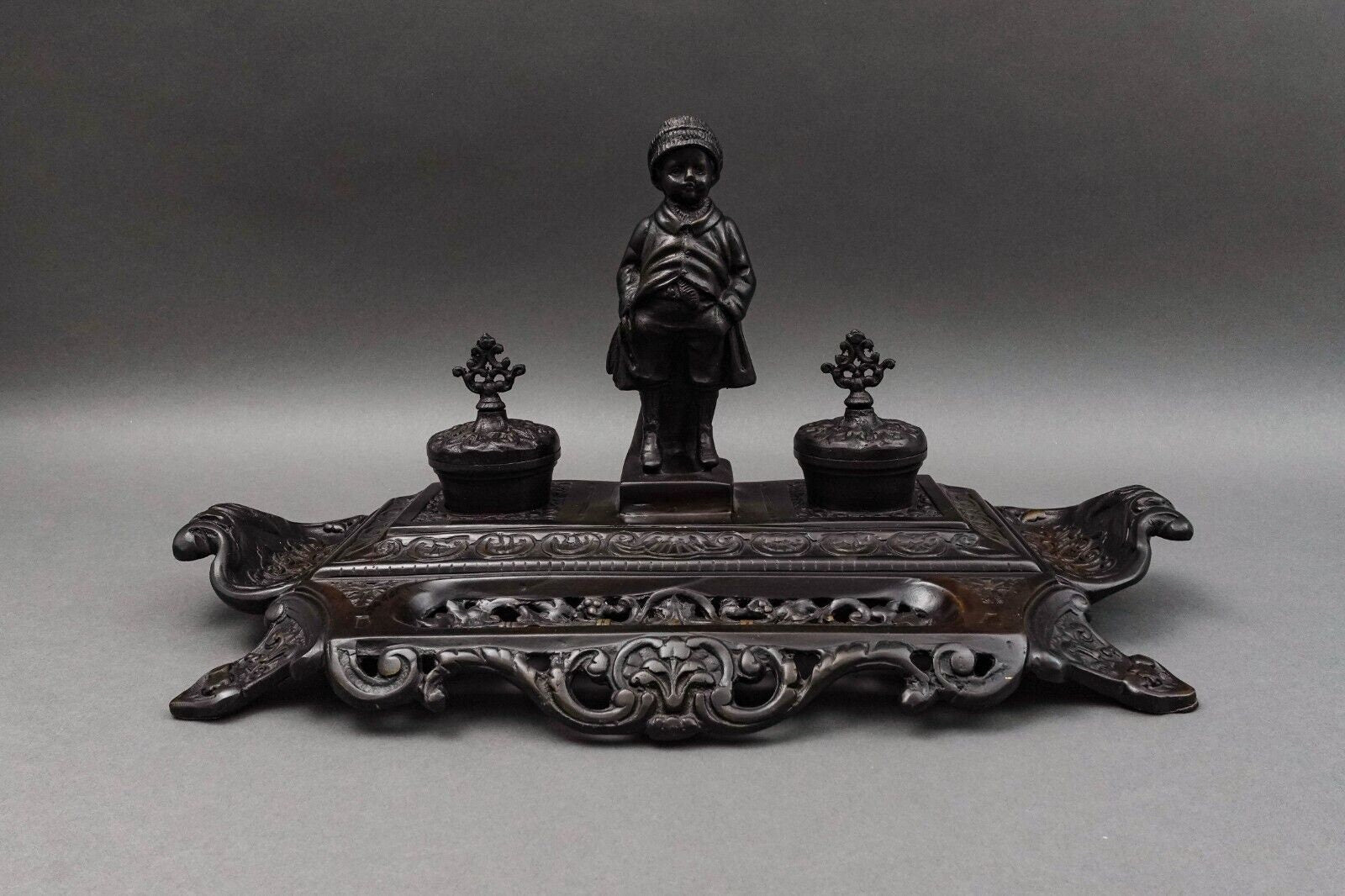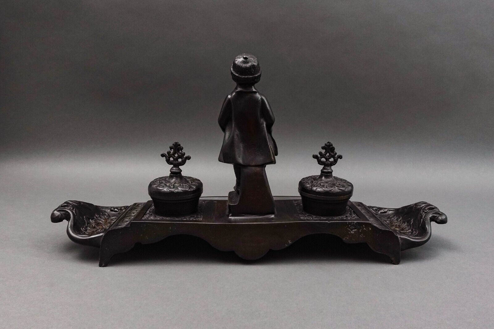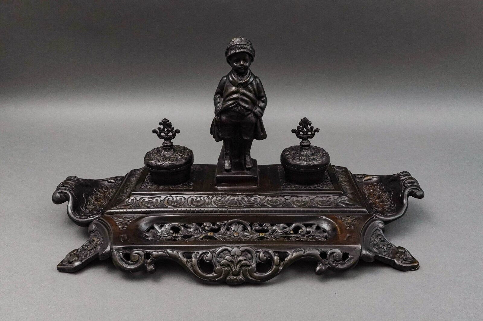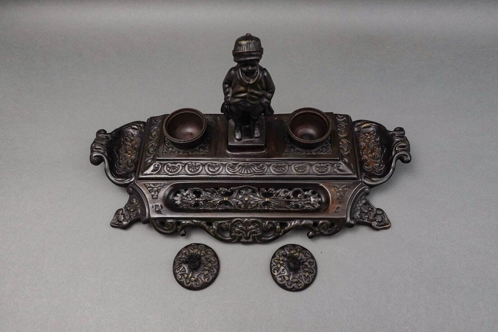 Maitland Smith Vintage Ornate Heavy Cast Bronze Desk Double Ink Well With Child.