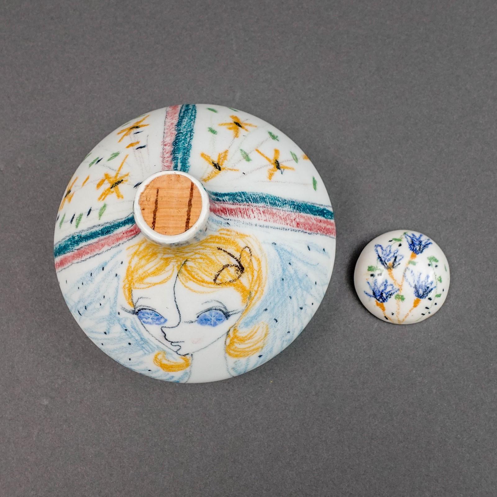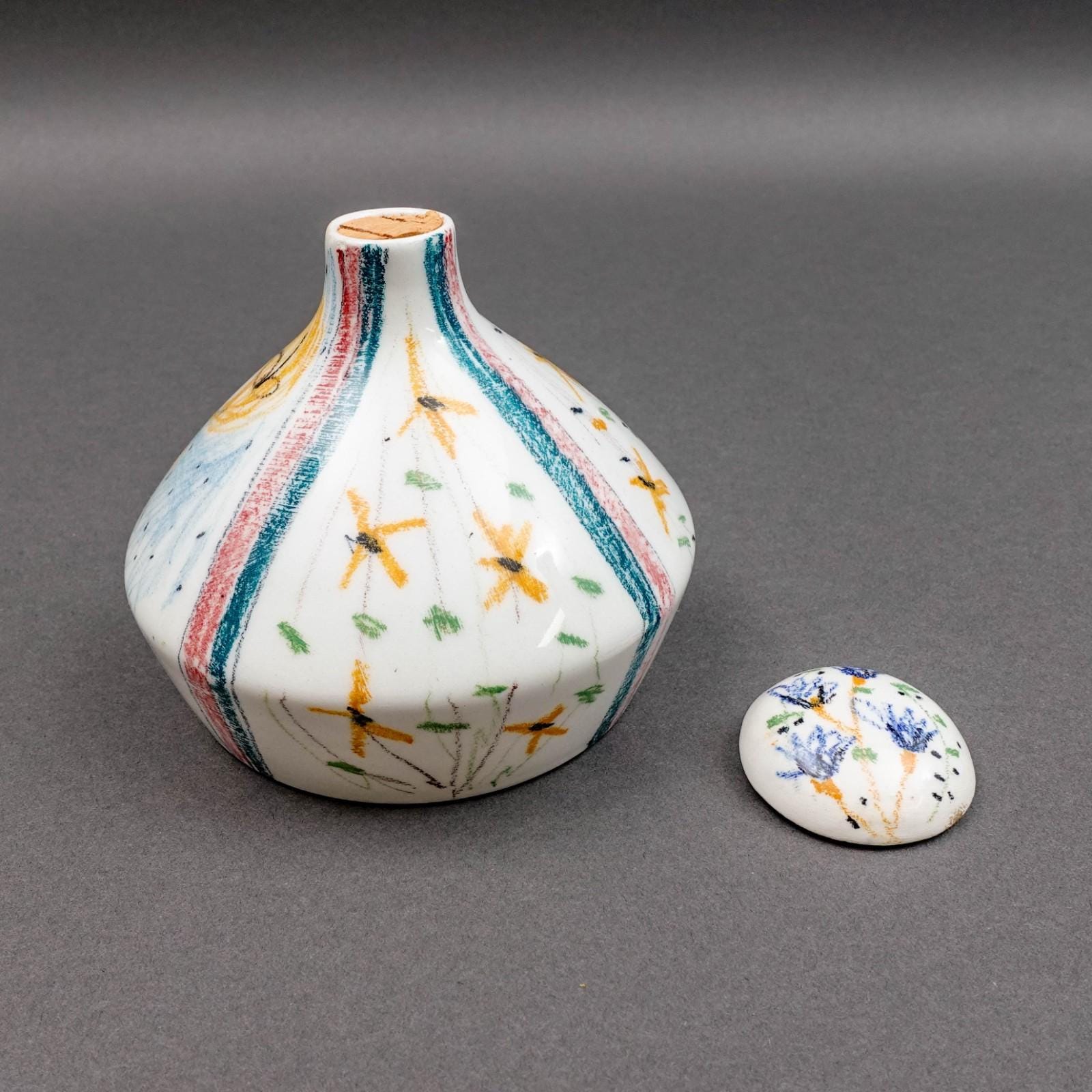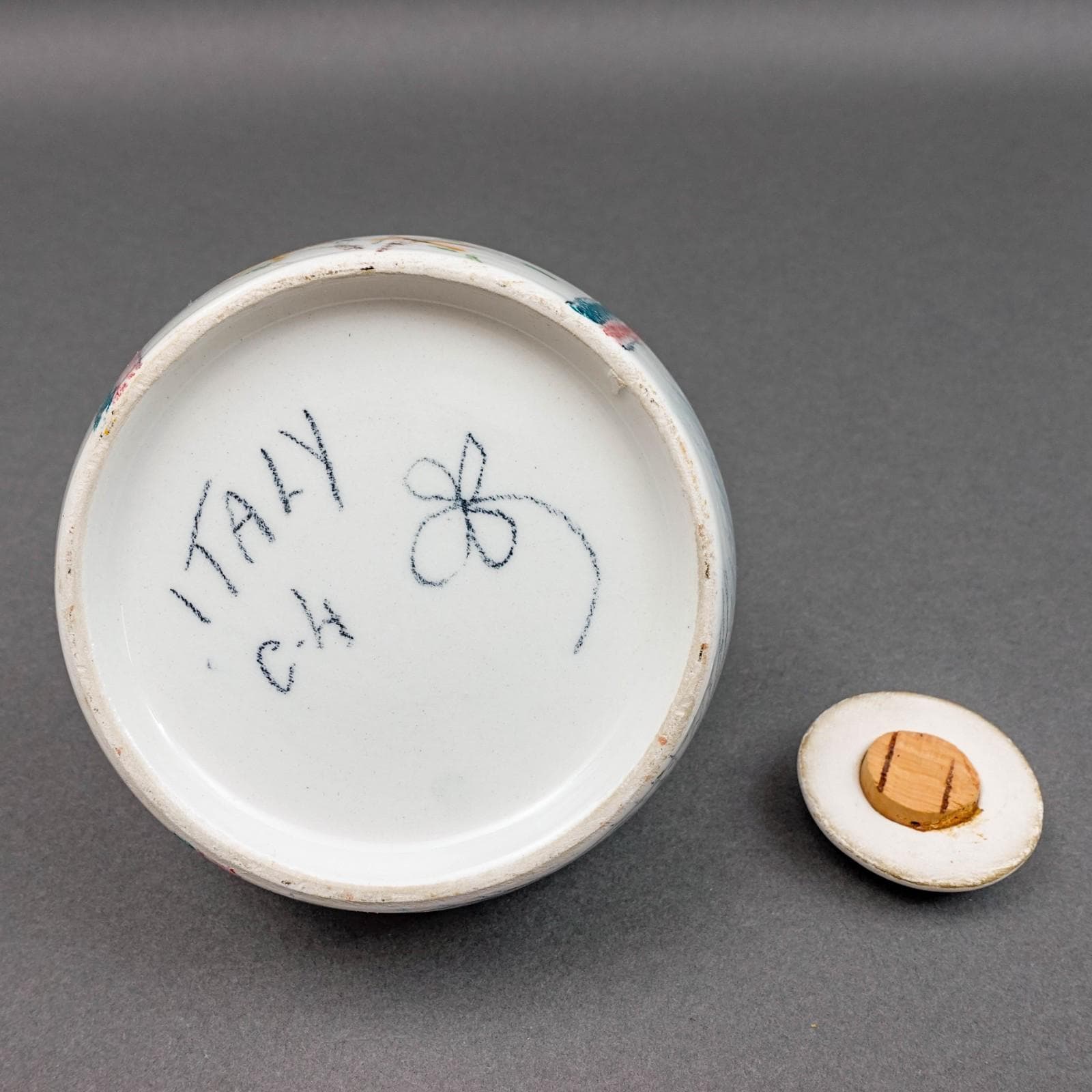 Milvia Quadrifoglio Italy Vintage Hand Painted Pottery Bottle (Read).Measures approximately 4 1/2" diameter, 3 7/8" high.Pre-owned condition. Item is being sold as found. No chips, cracks or repairs. Cork is broken can be professionally replaced and imperfection to stopper edge
