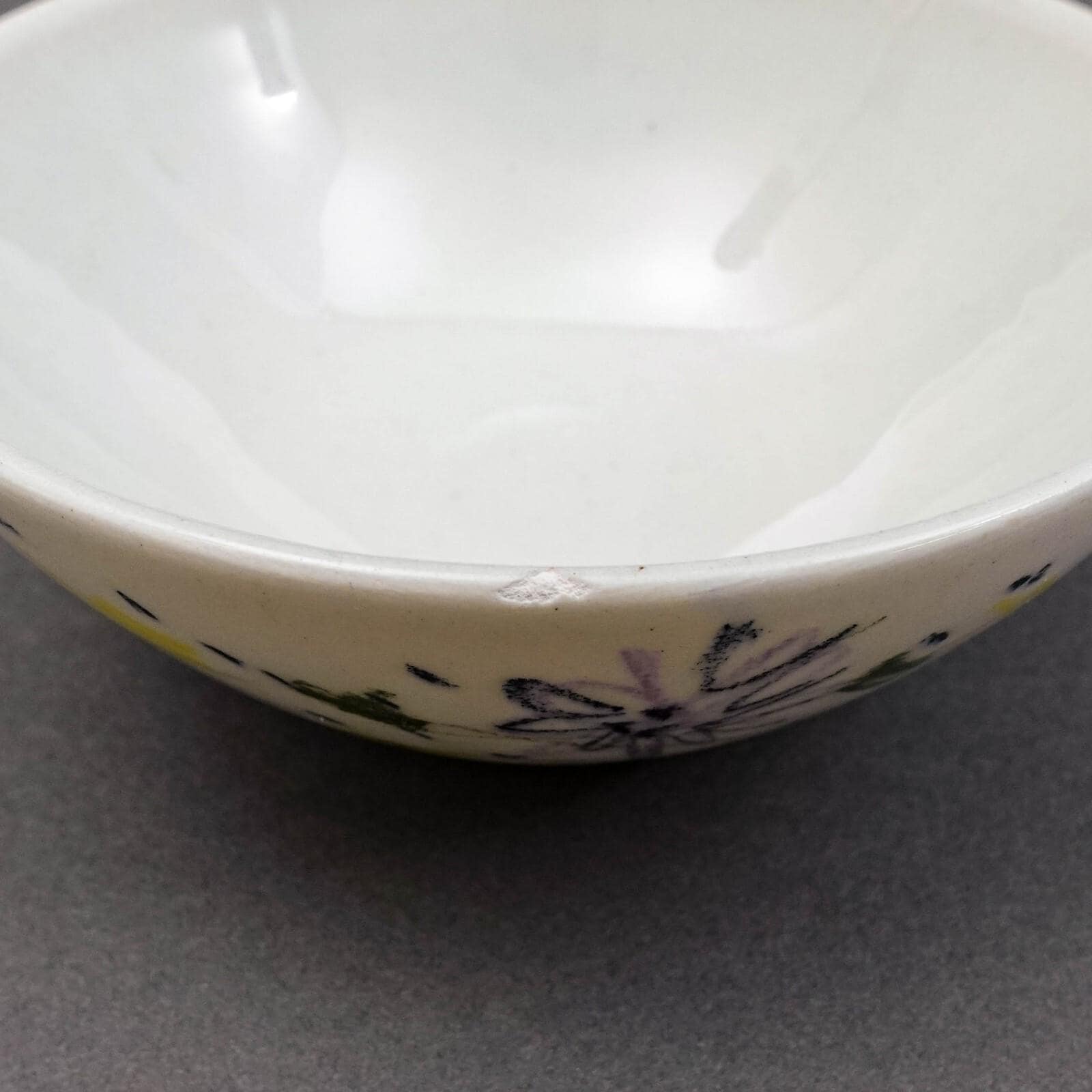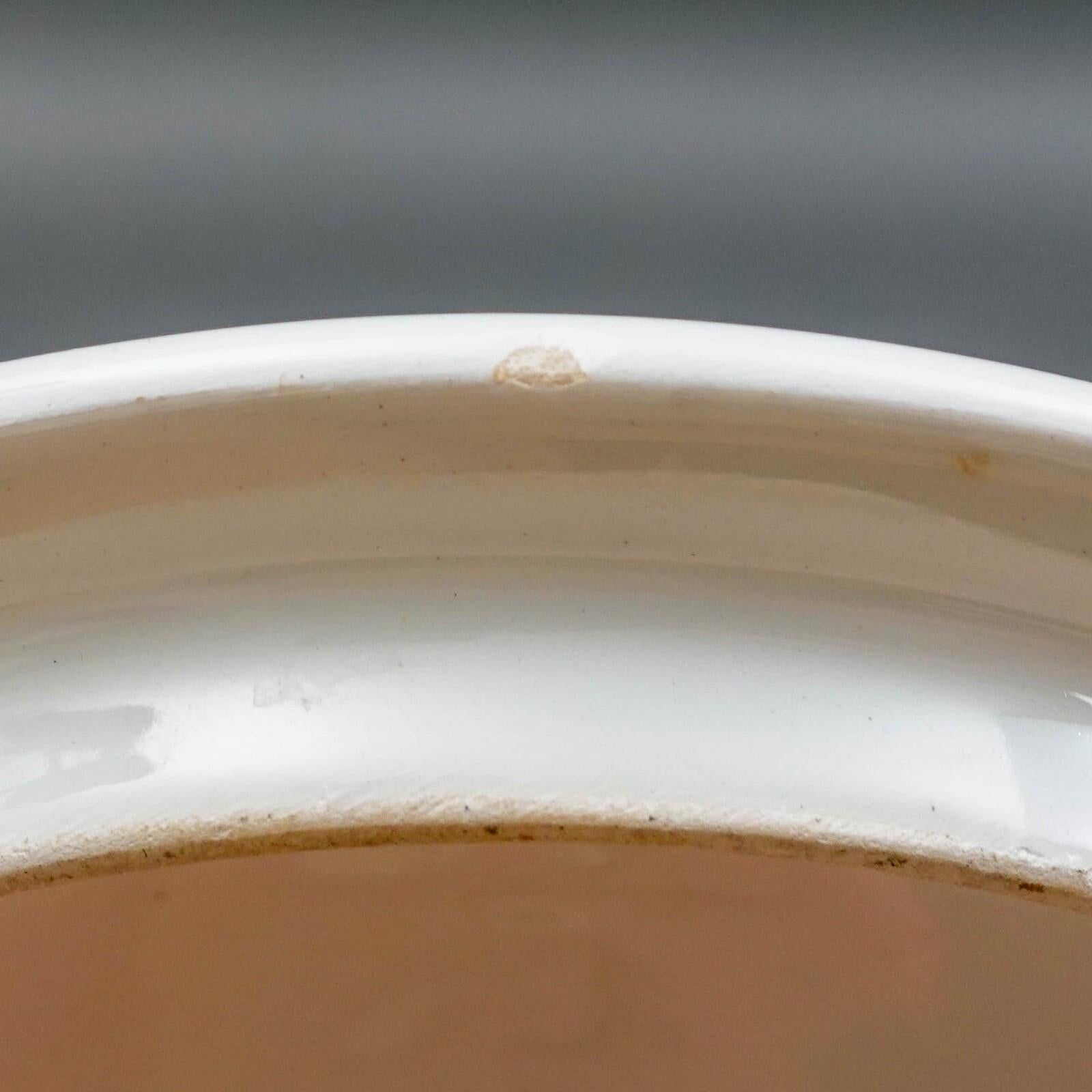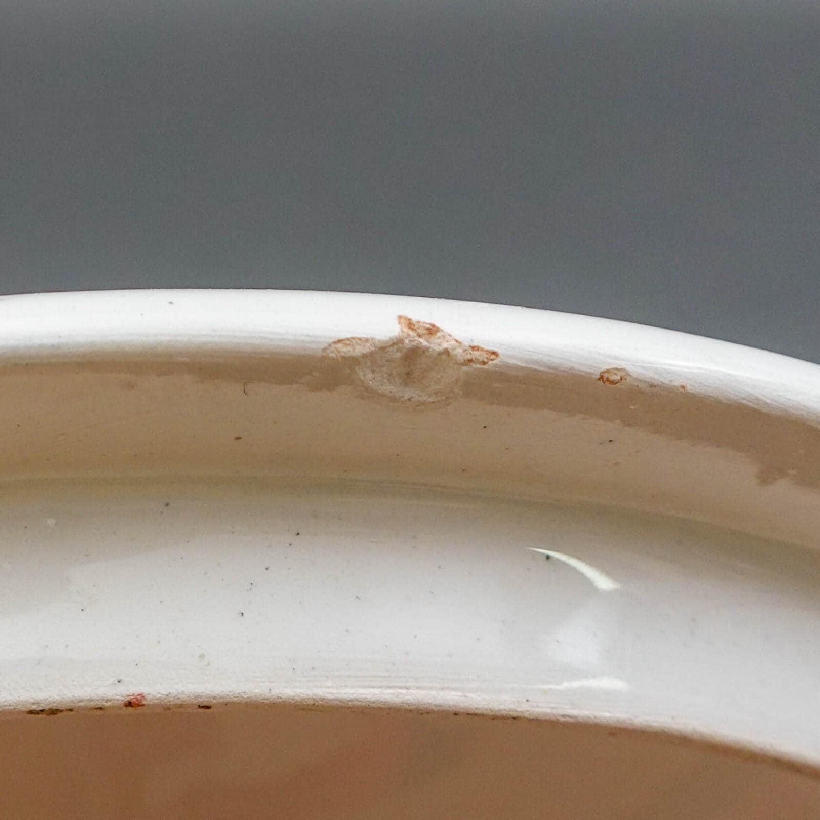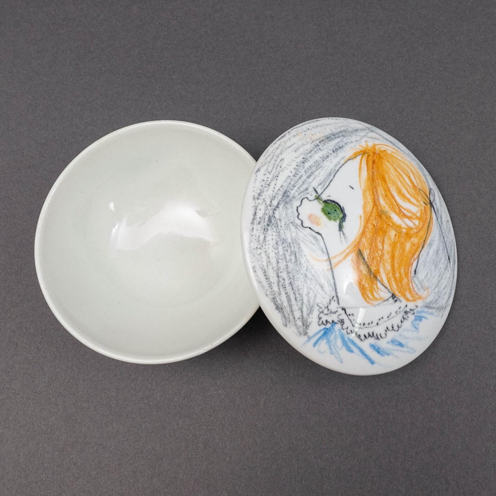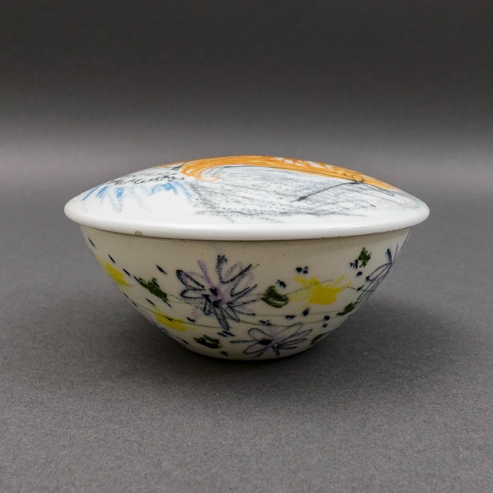 Box.Measures approximately 4 7/8" diameter, 2 3/4" high.Good pre-owned condition. Item is being sold as found. No chips, cracks or repairs. Bowl has a nick flake to outer edge of one area and lower lid has a chip nick and a flake.