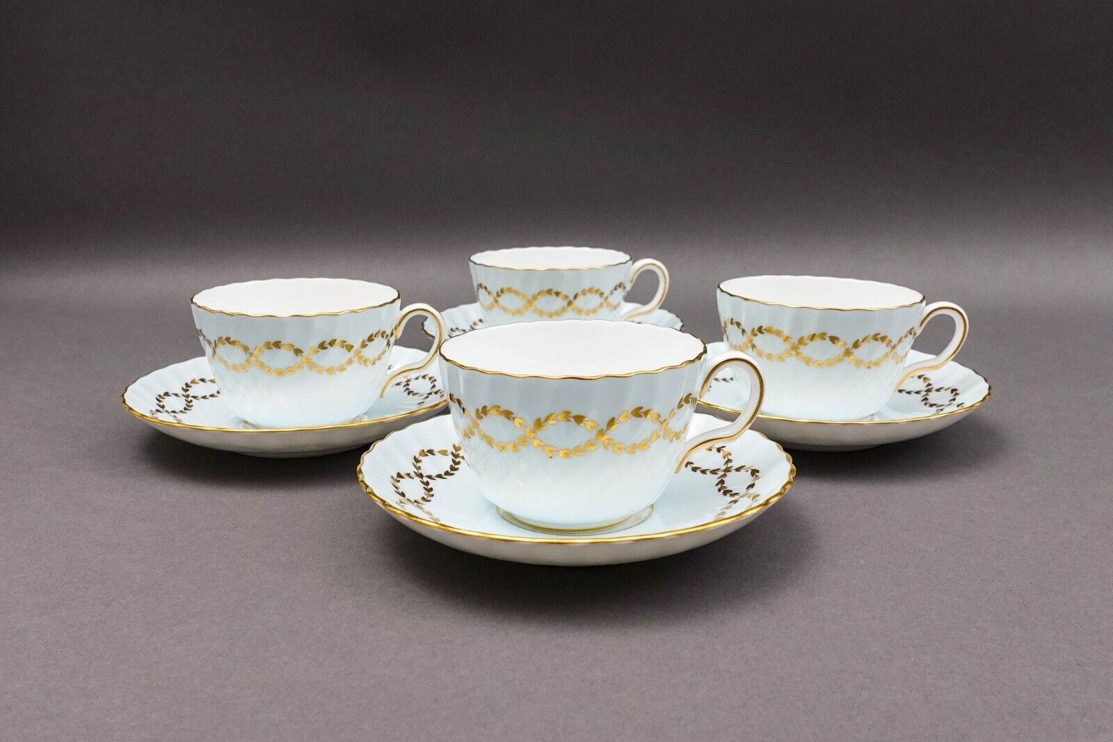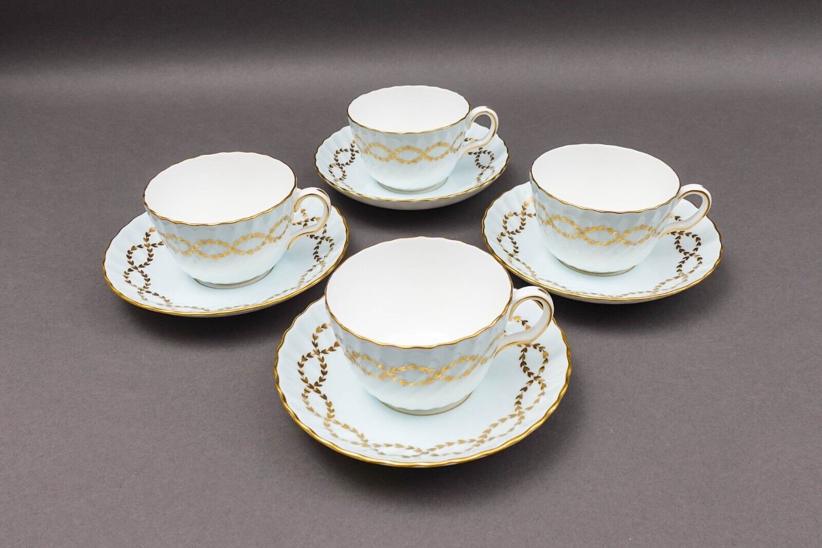 Minton England S600 Intertwined Gold Laurel Leaves Light Blue Swirl Tea Cup & Saucer Set Of 4.