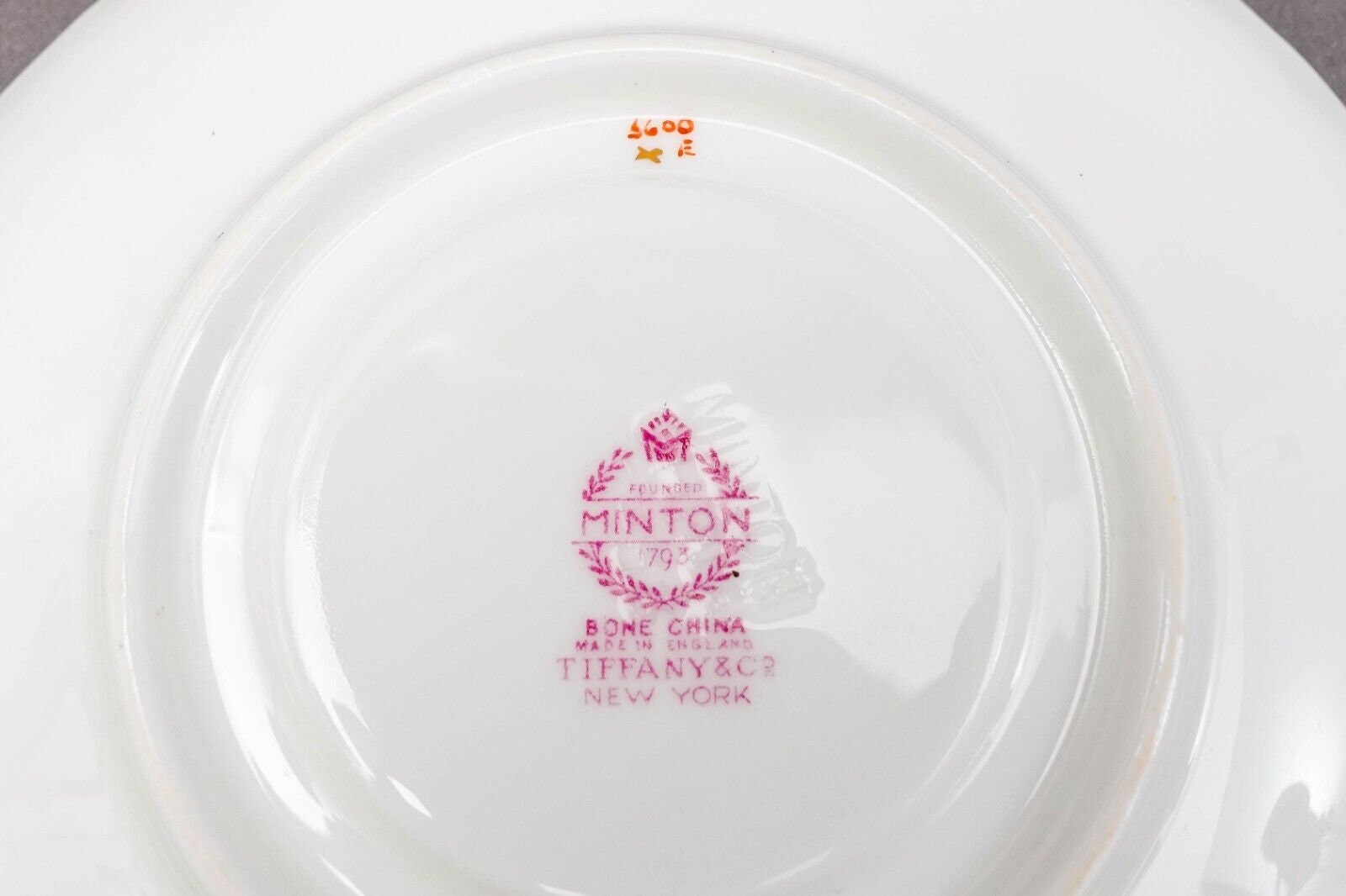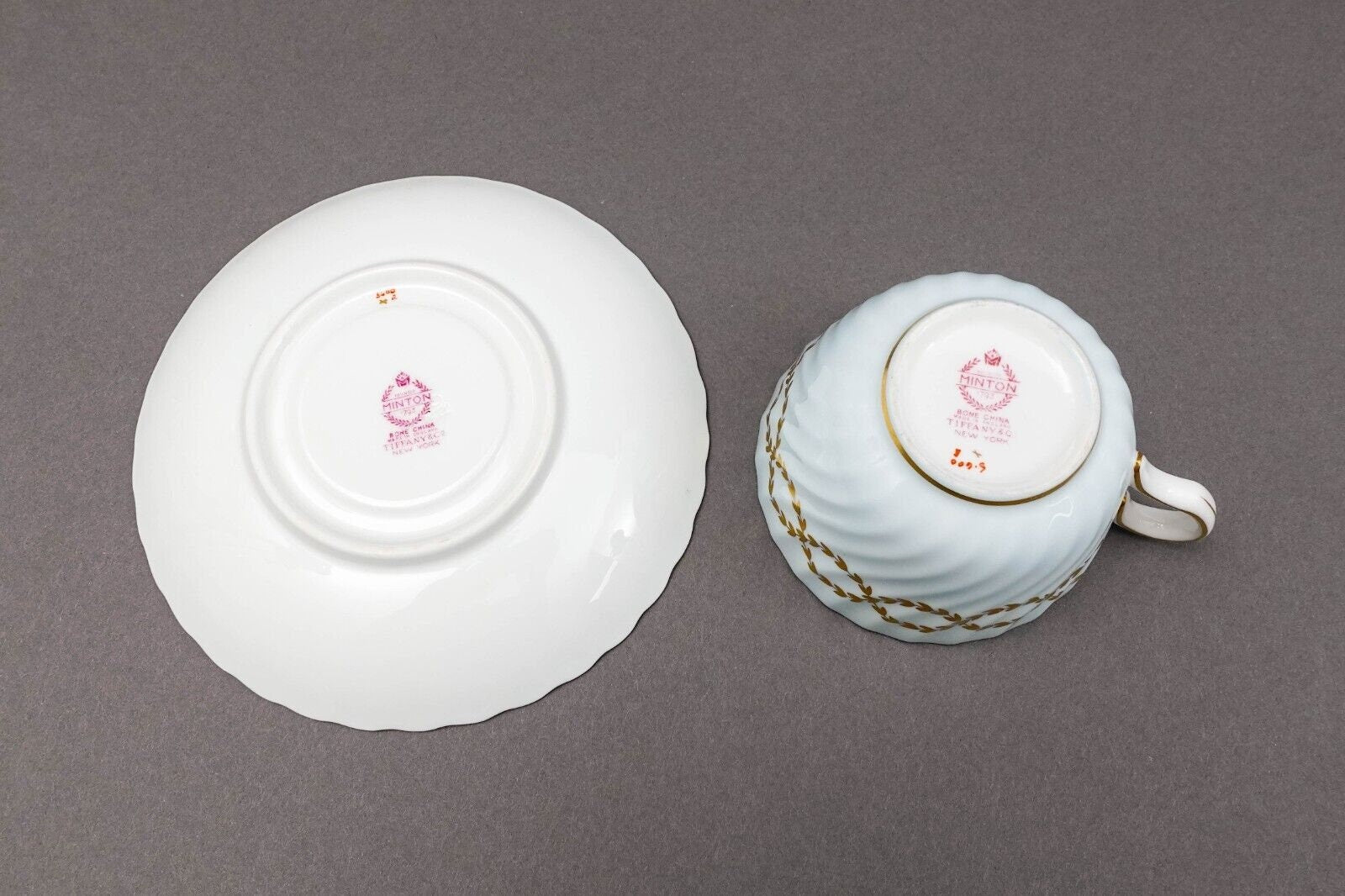 Three of the four cups and one saucer have a Tiffany pink backstamp, the rest have a gold backstamp. Measures approximately Cup: 4 1/2" long, 3 3/8" wide, 2 1/8" high. Saucer: 5 5/8" diameter.