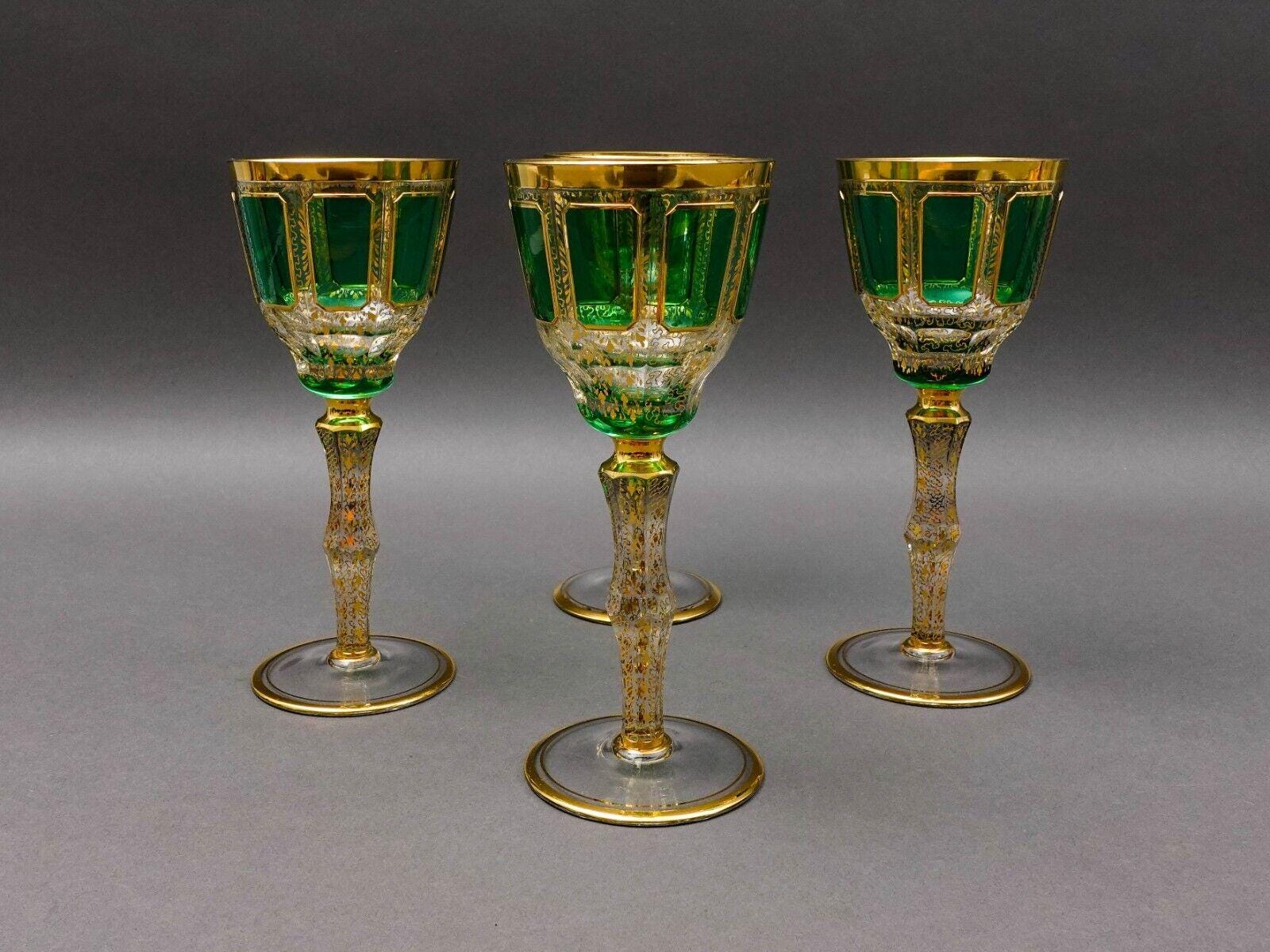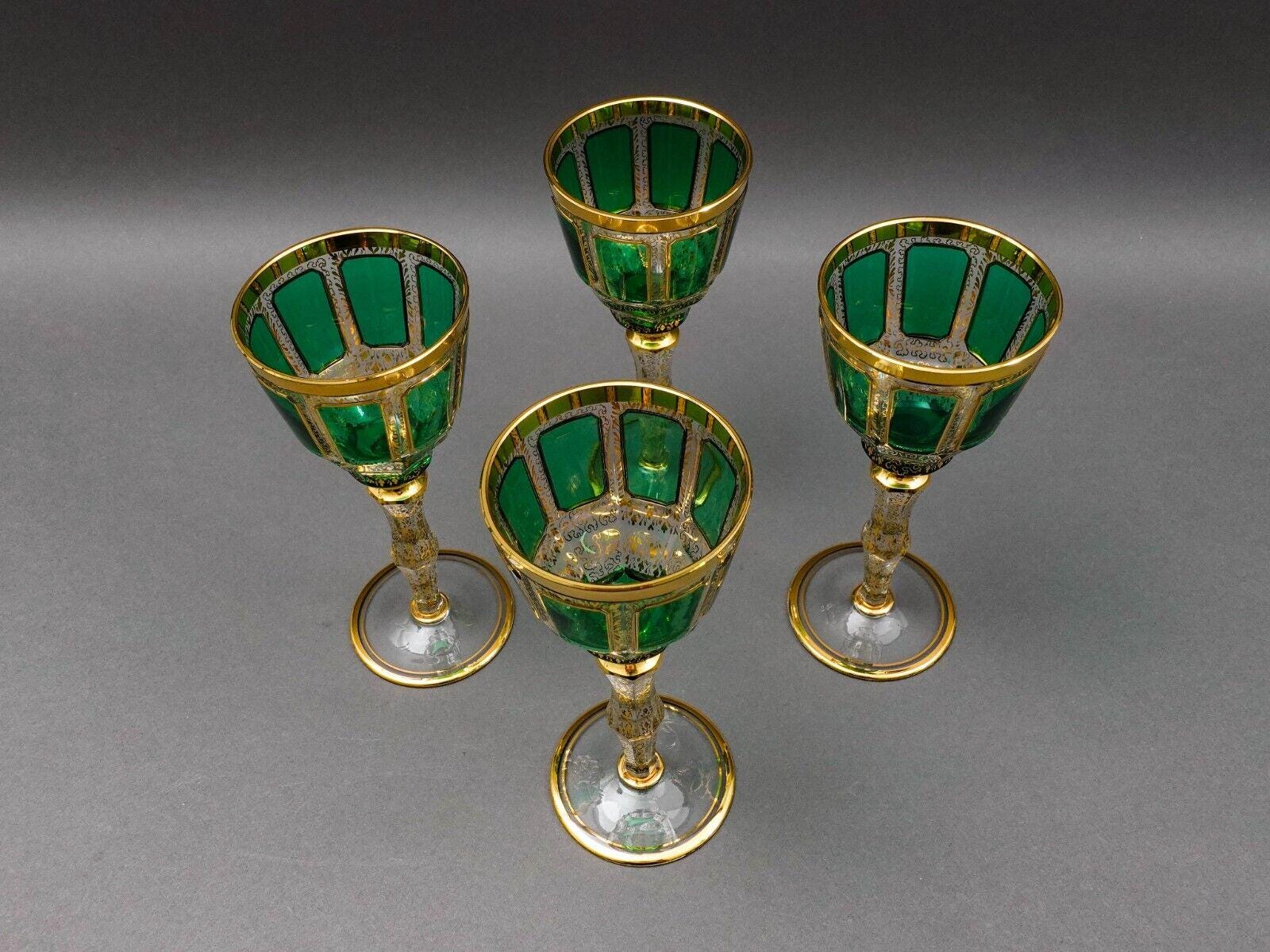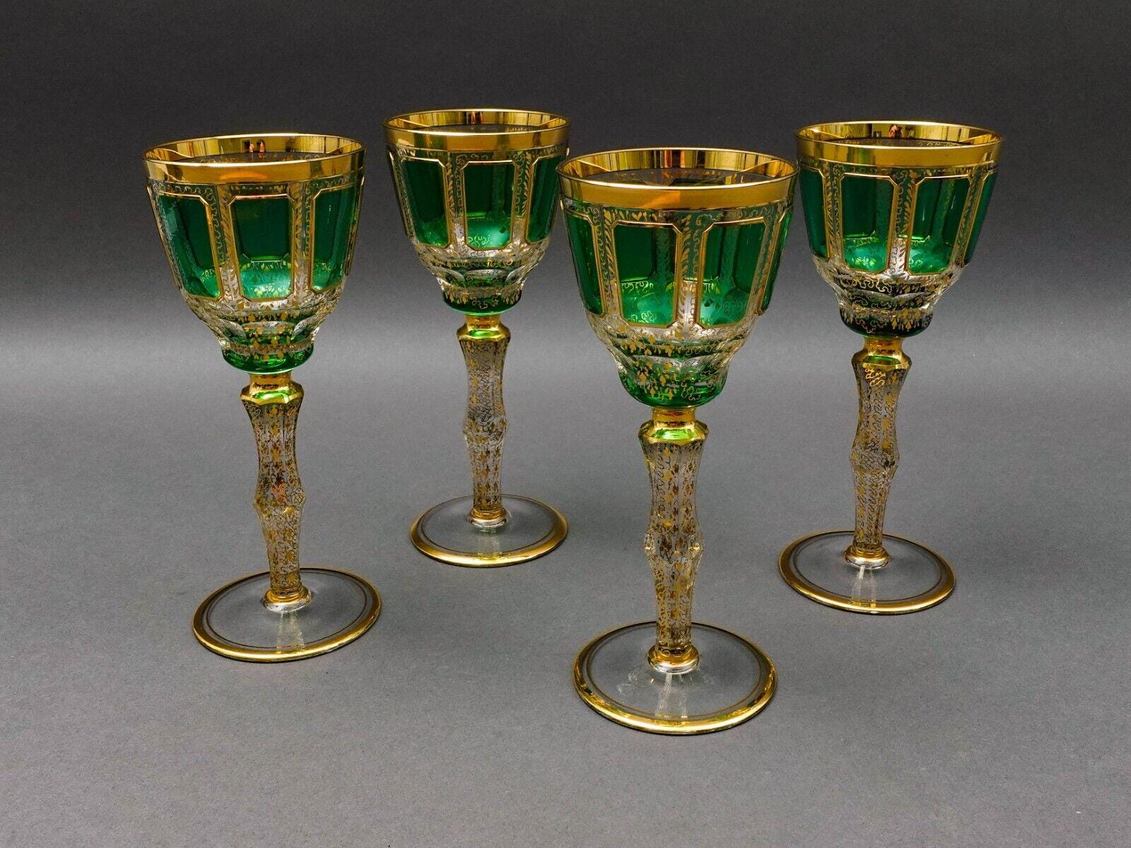 Moser Bohemian Emerald Green Gold Gilded Panel 8 1/4" Wine Glass Goblet Set Of 4