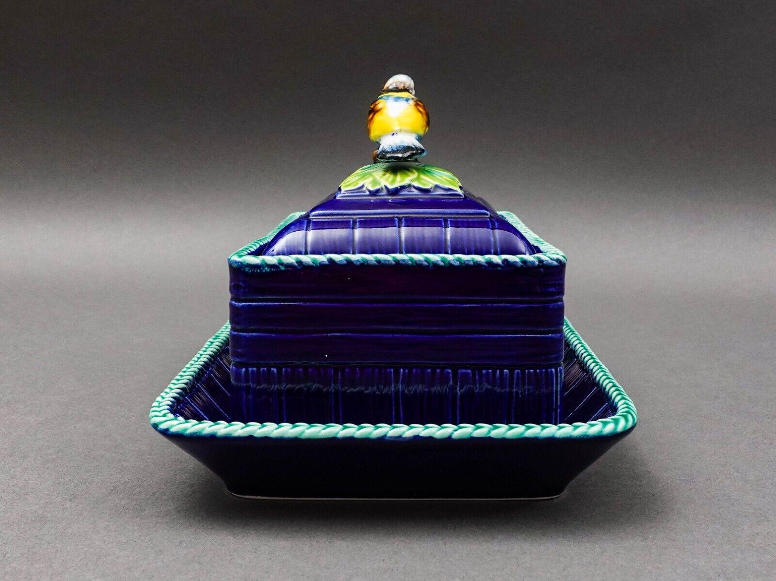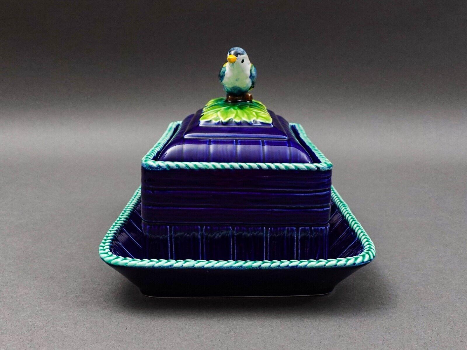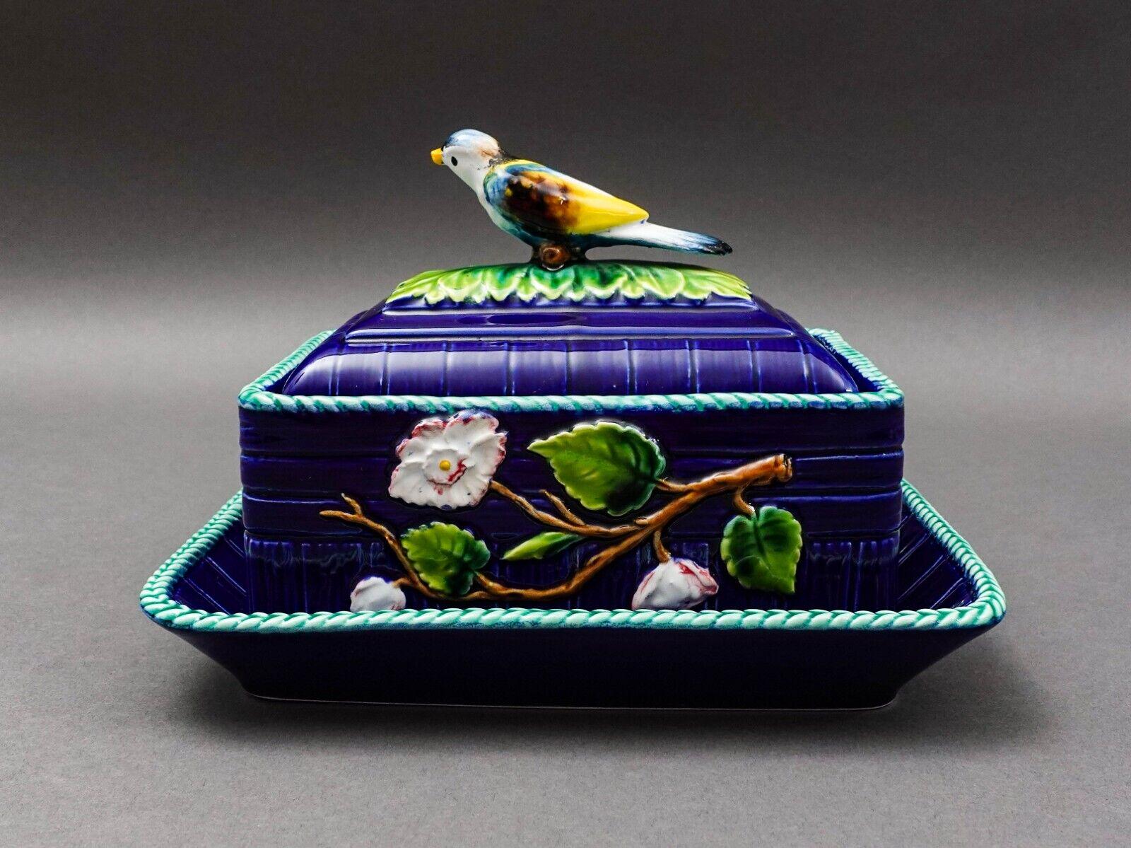 Mottahehedeh Italy Majolica Cobalt Floral Bird Finial Covered Dish With Tray