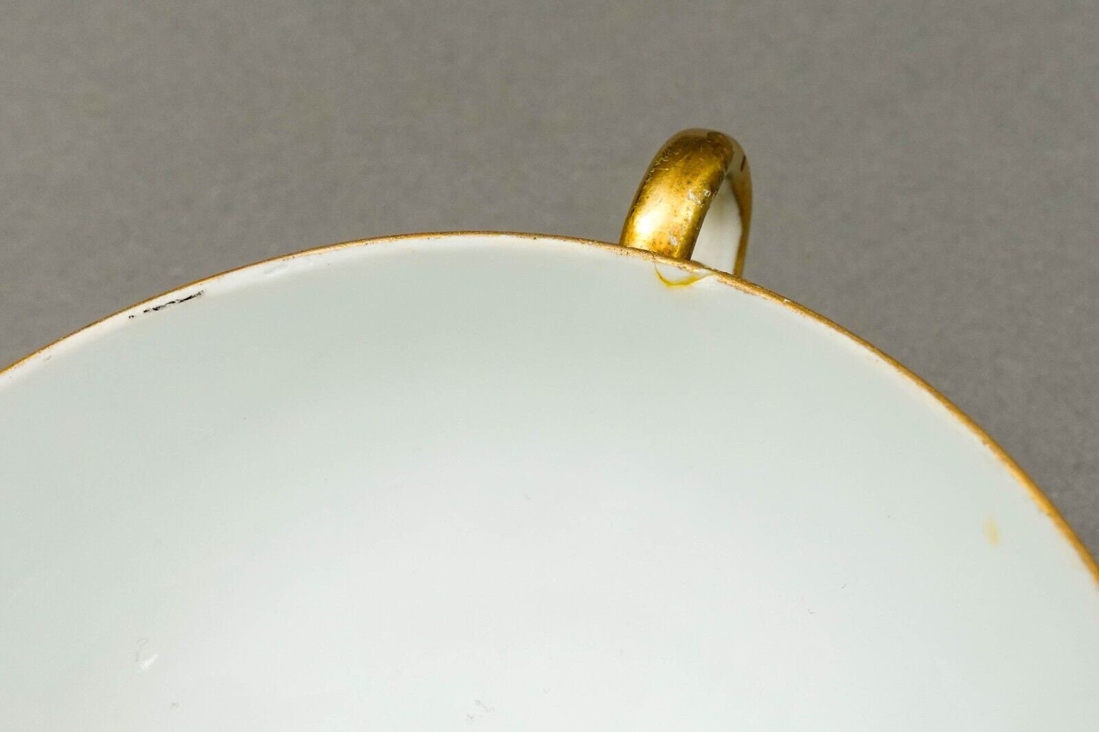 Some enamel loss to set, imperfections and one teacup has a repaired chip to rim.