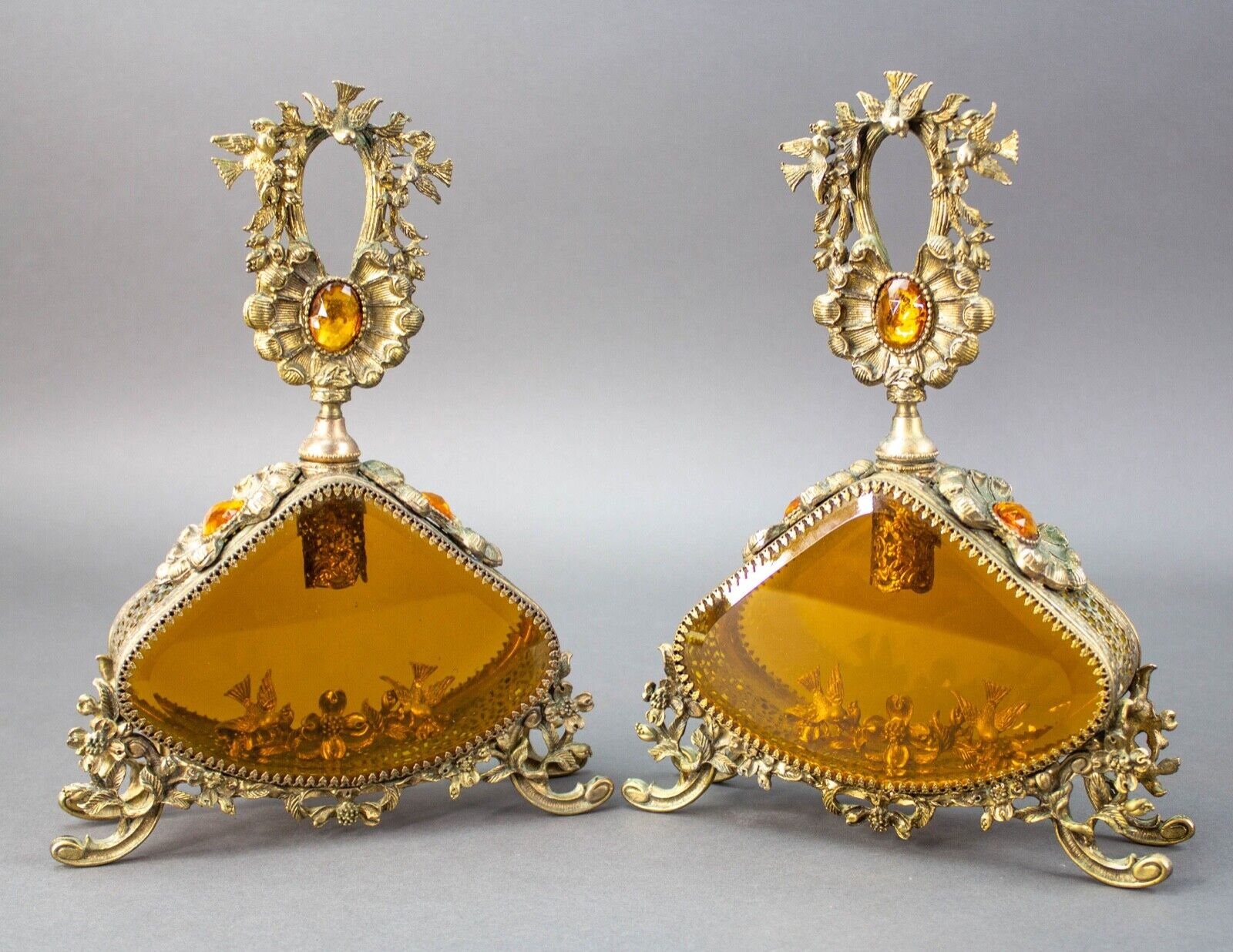 Pair Of Vintage Large Jeweled Ornate Ormolu Gold Gilt Metal Filigree Perfume Bottles Amber Glass Vanity.