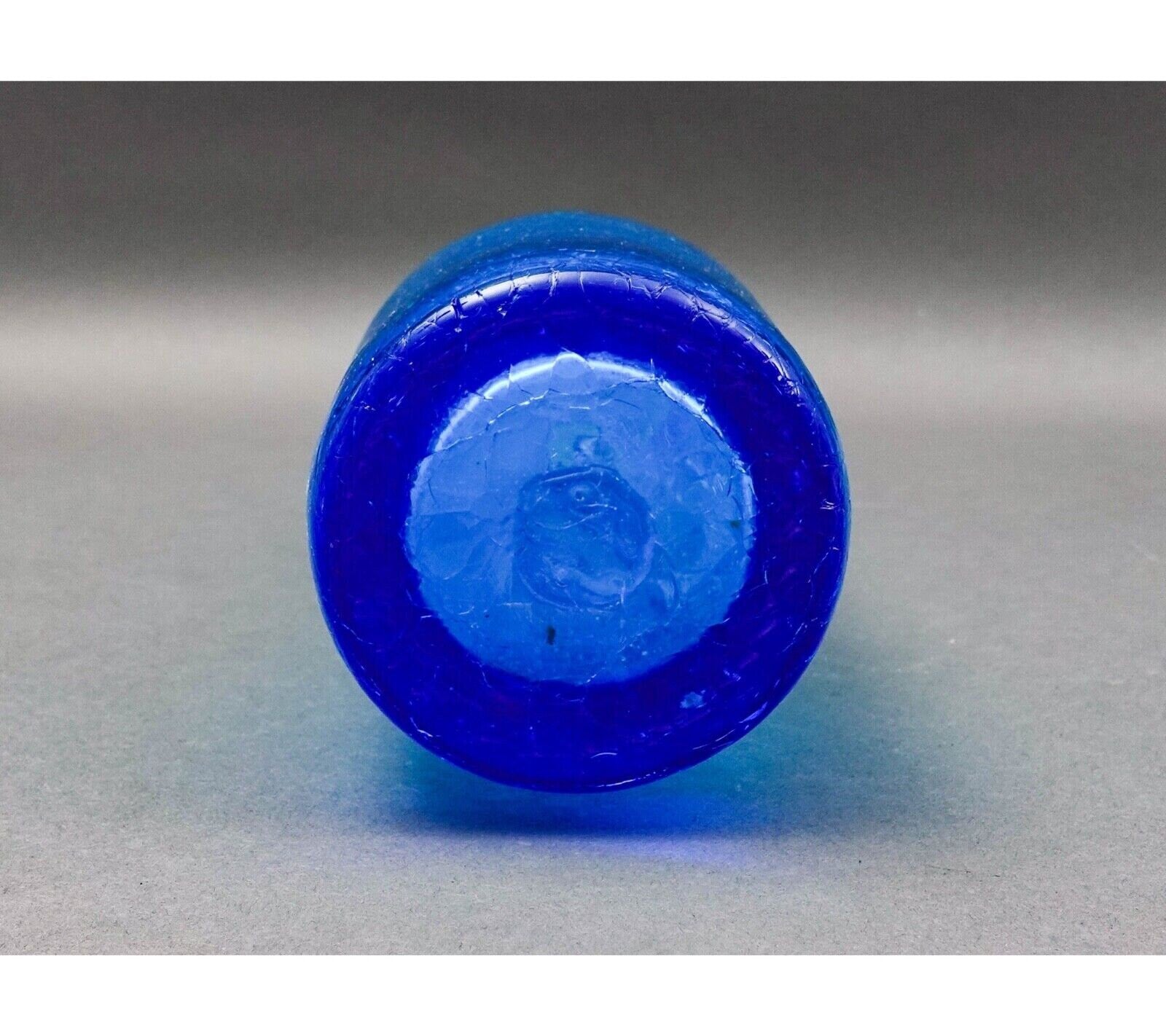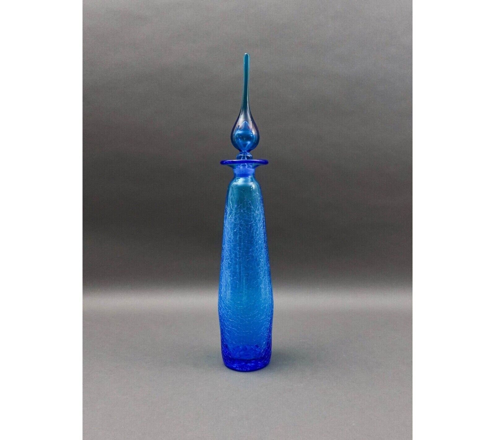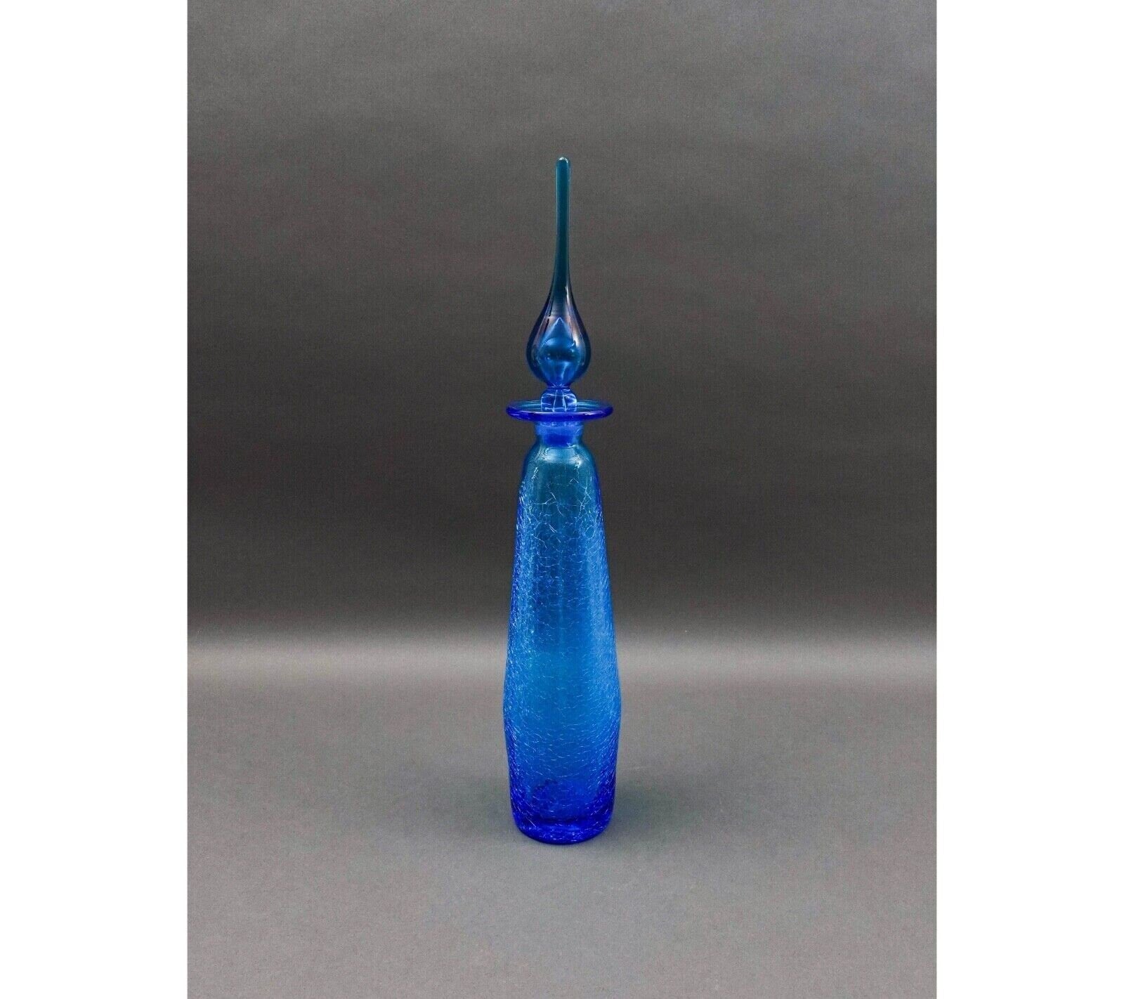 Rare Rainbow Vintage MCM #9701 Blue Art Glass Crackle Long John Decanter Genie Bottle Flame Stopper.