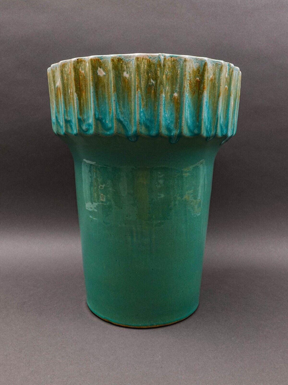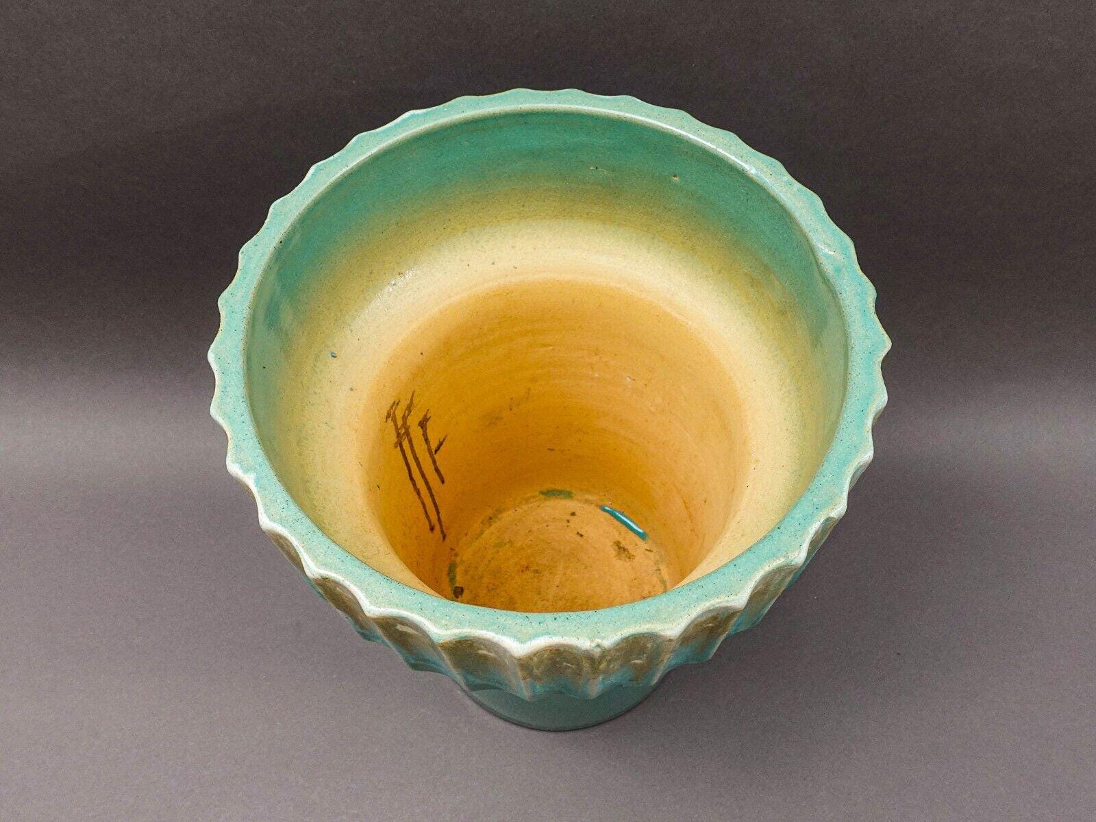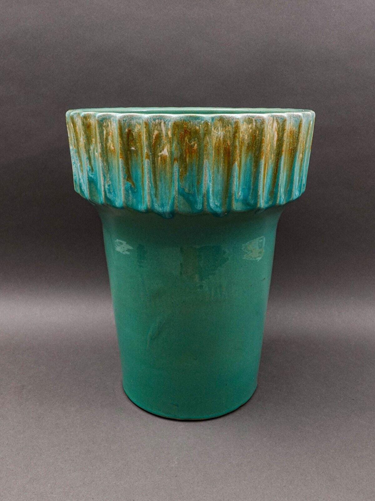 Gear Planter Jardiniere Floor Vase. Measures approximately 13" diameter, 16 1/2" high. Great pre-owned condition. Item is being sold as found. No chips, cracks or repairs. One oxidation line mark to one side. Overall fantastic appearance!!!