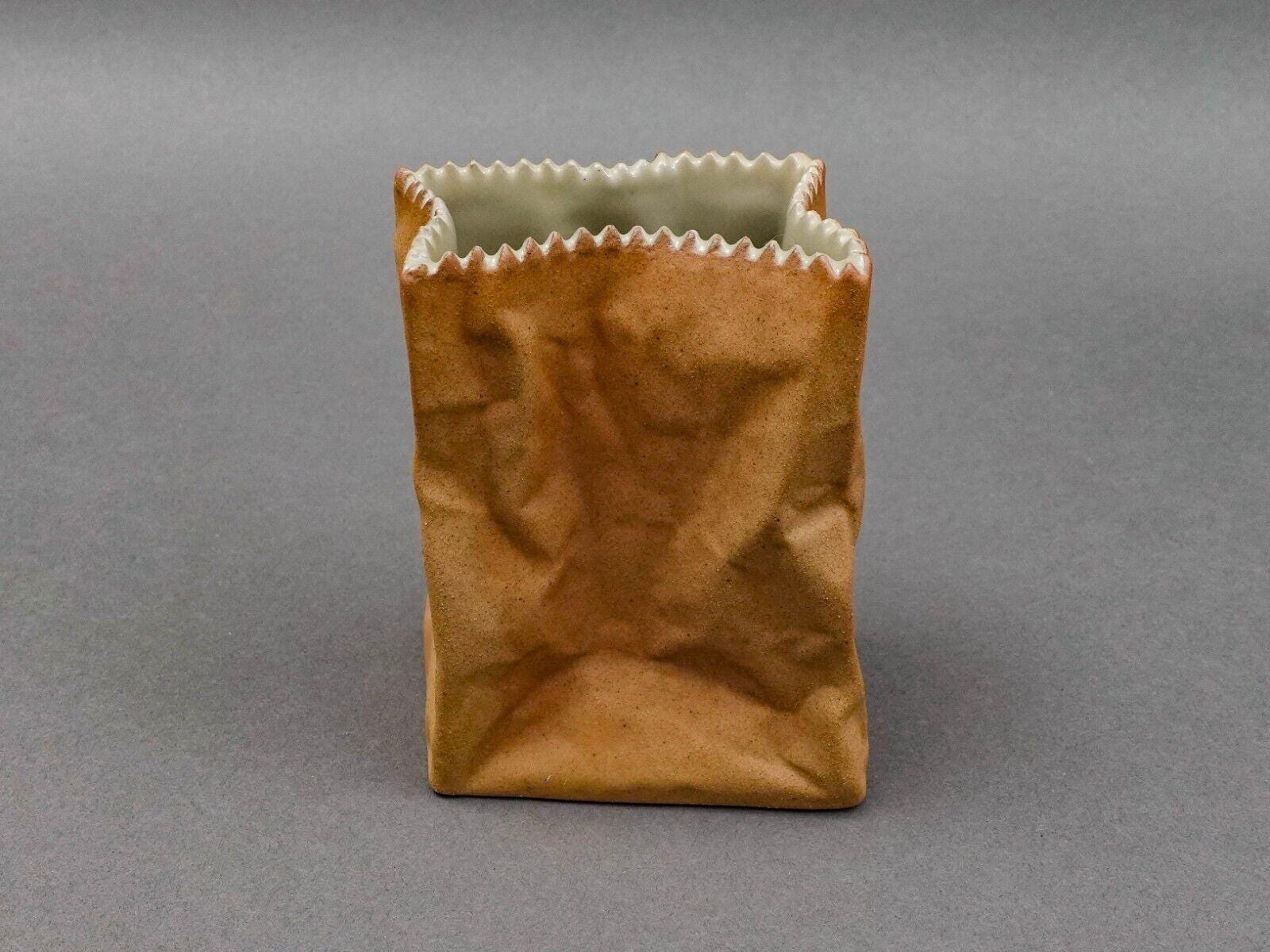 Crinkle Brown Paper Bag Vase.Measures approximately 3 1/4" long, 2" wide, 4 1/2" high.Excellent pre-owned condition. Item is being sold as found. No chips, cracks or repairs. Overall fantastic appearance!!!