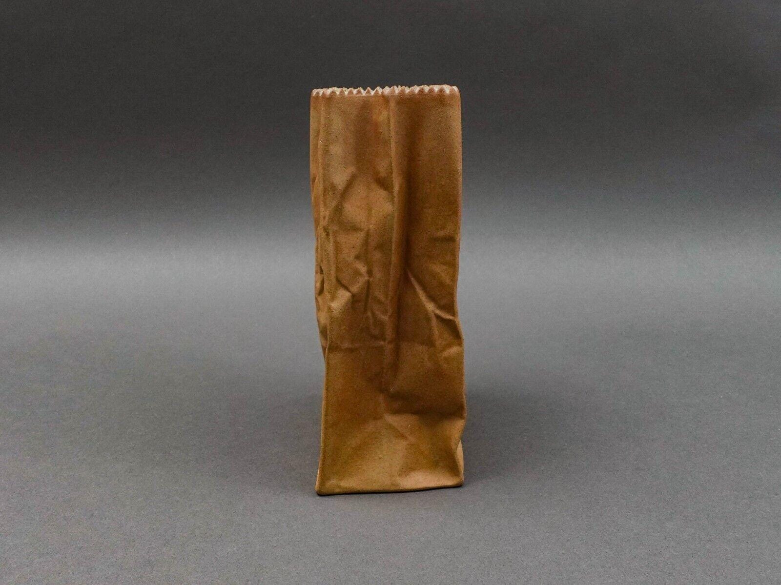 Crinkle Brown Paper Bag Vase.Measures approximately 4 3/4" long, 3" wide, 7 3/4" high.Excellent pre-owned condition. Item is being sold as found. No chips, cracks or repairs. Overall fantastic appearance!!!